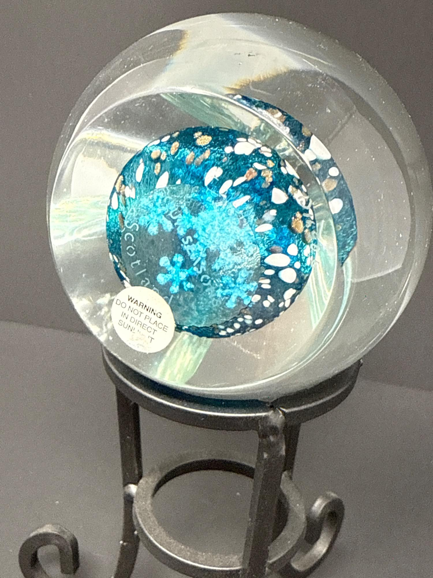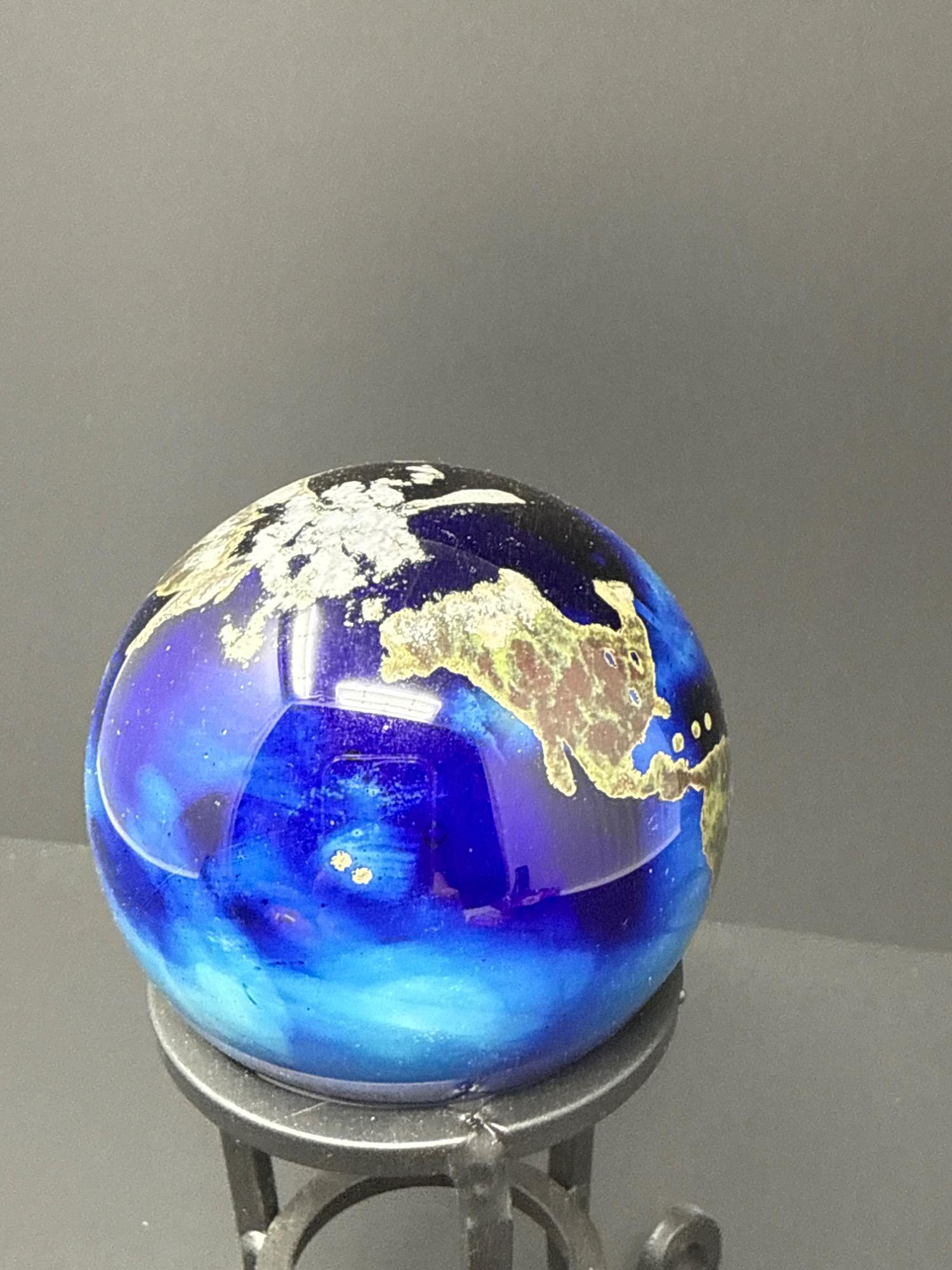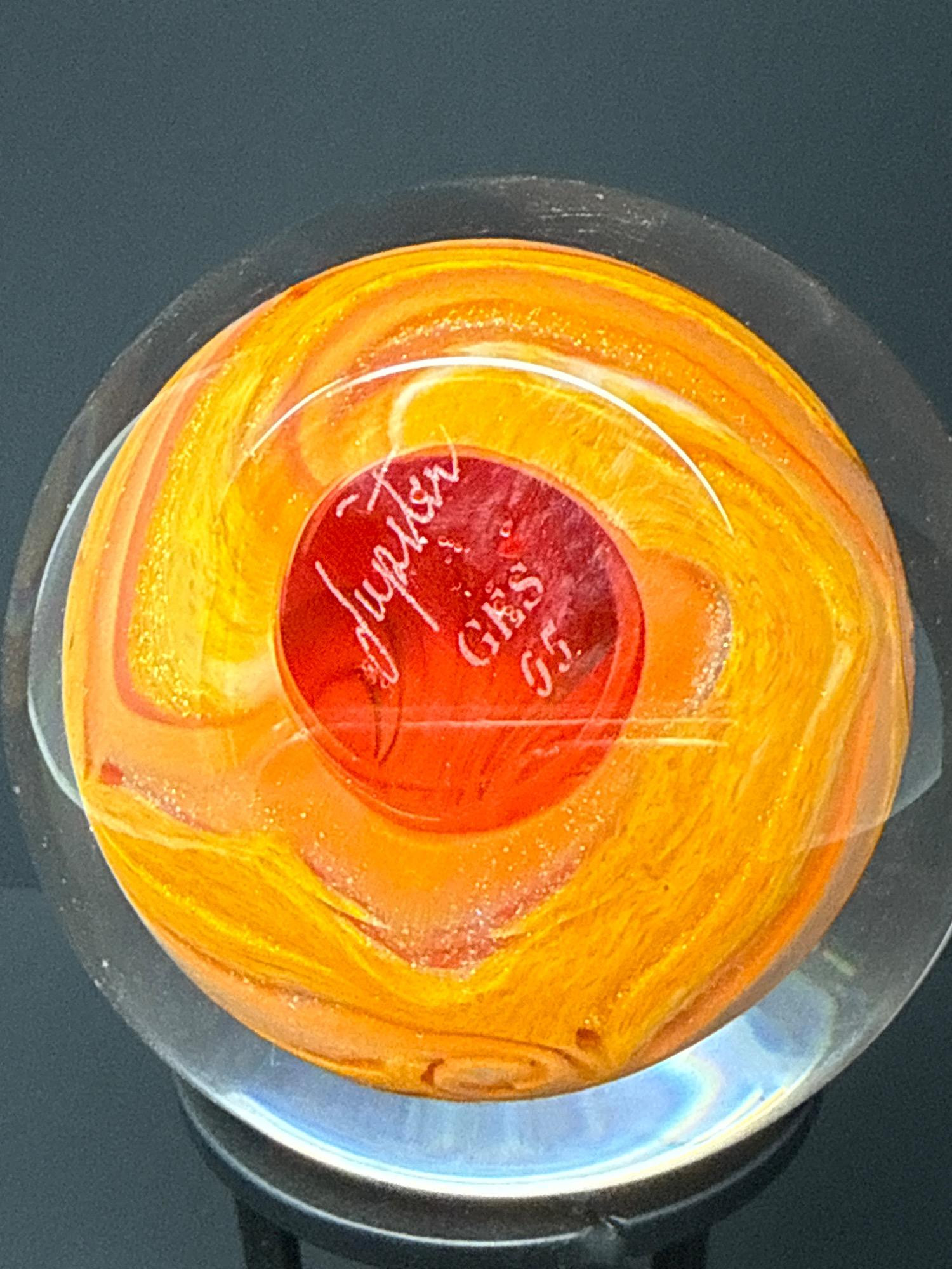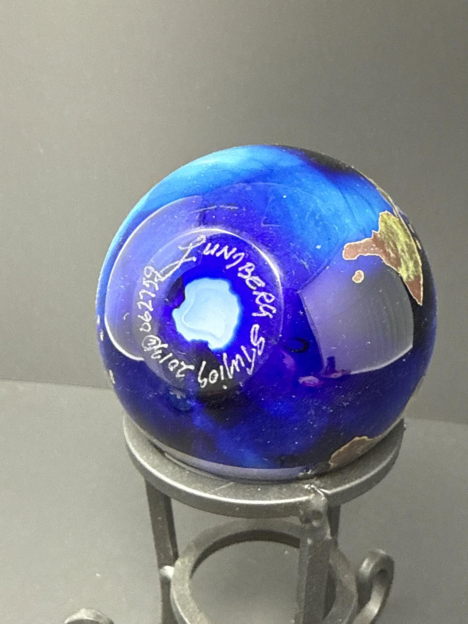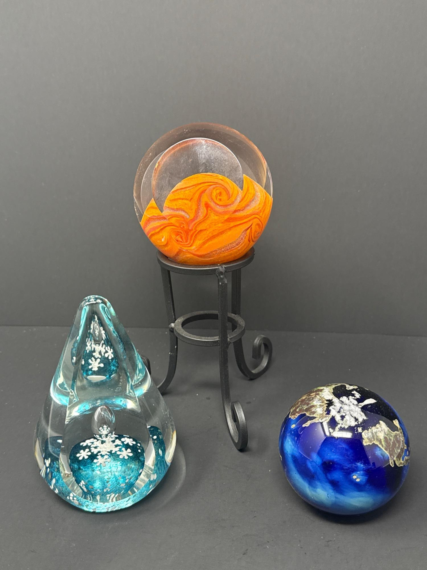 This beautiful trio of signed art glass paperweights includes vibrant and collectible pieces crafted with exceptional artistry: Teardrop Snowflake Paperweight (Four Seasons) Dimensions: 4.5 inches tall x 3 inches wide Design: Clear glass teardrop with internal snowflake and glittering blue core Markings: Signed on the base; from the Four Seasons collection Orange Swirl “Jupiter” Paperweight (GES05) Dimensions: Approx. 3 inches in diameter Design: Swirling orange with shimmering silver accents, inspired by the planet Jupiter Markings: Signed Jupiter GES 05 on the base Glowing Blue Earth Globe Paperweight (Lundberg Studios) Dimensions: Approx. 2.25 inches in diameter Design: Deep cobalt glass with gold-tone continents, resembling Earth Markings: Signed Lundberg Studios 062790 on the base