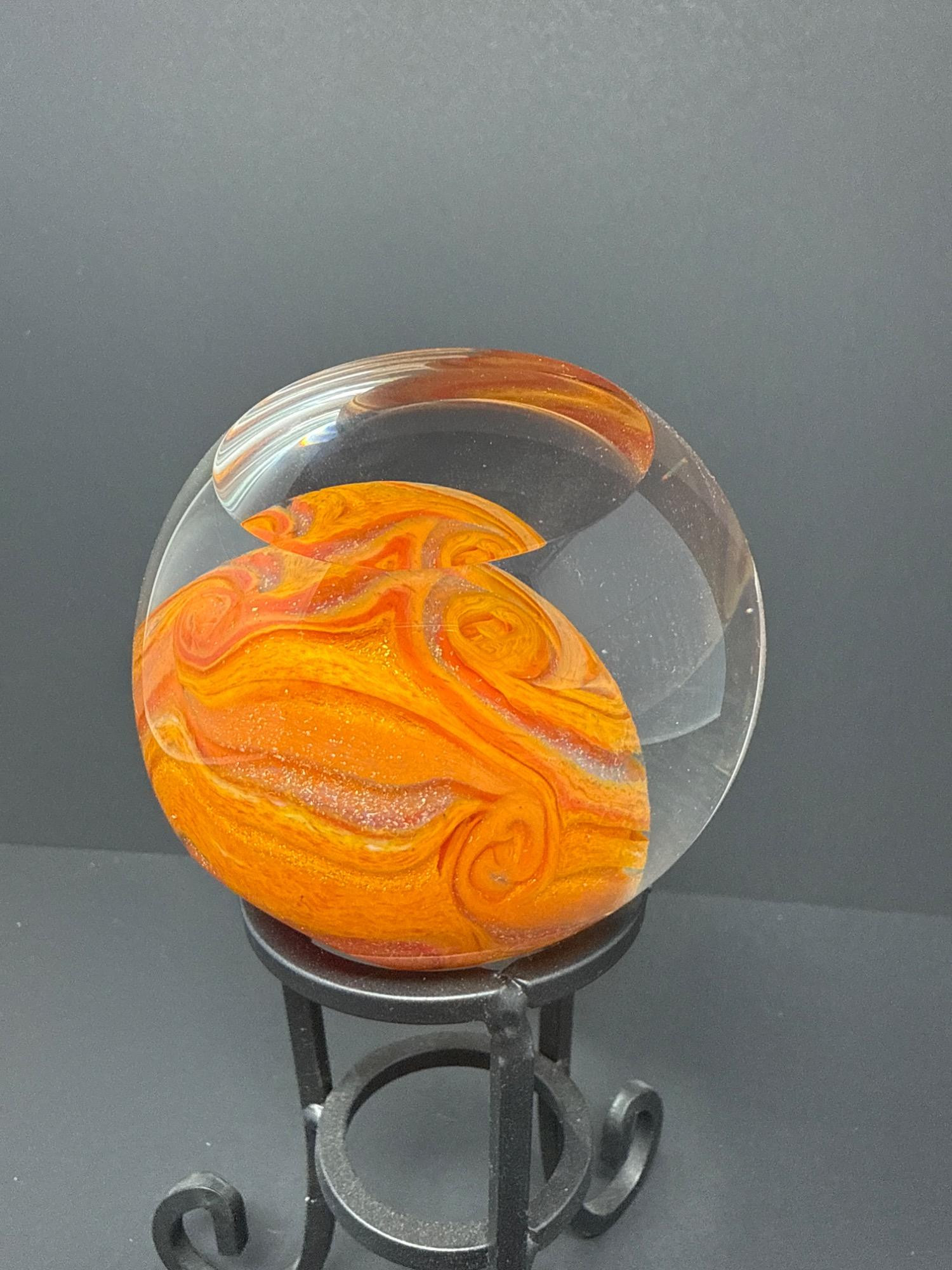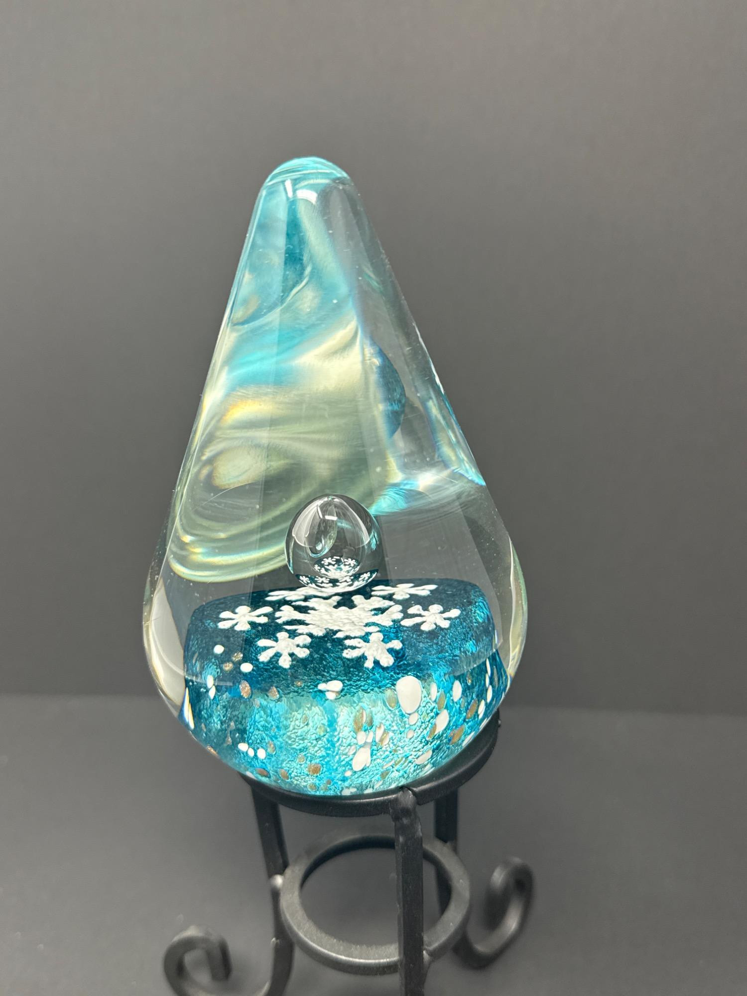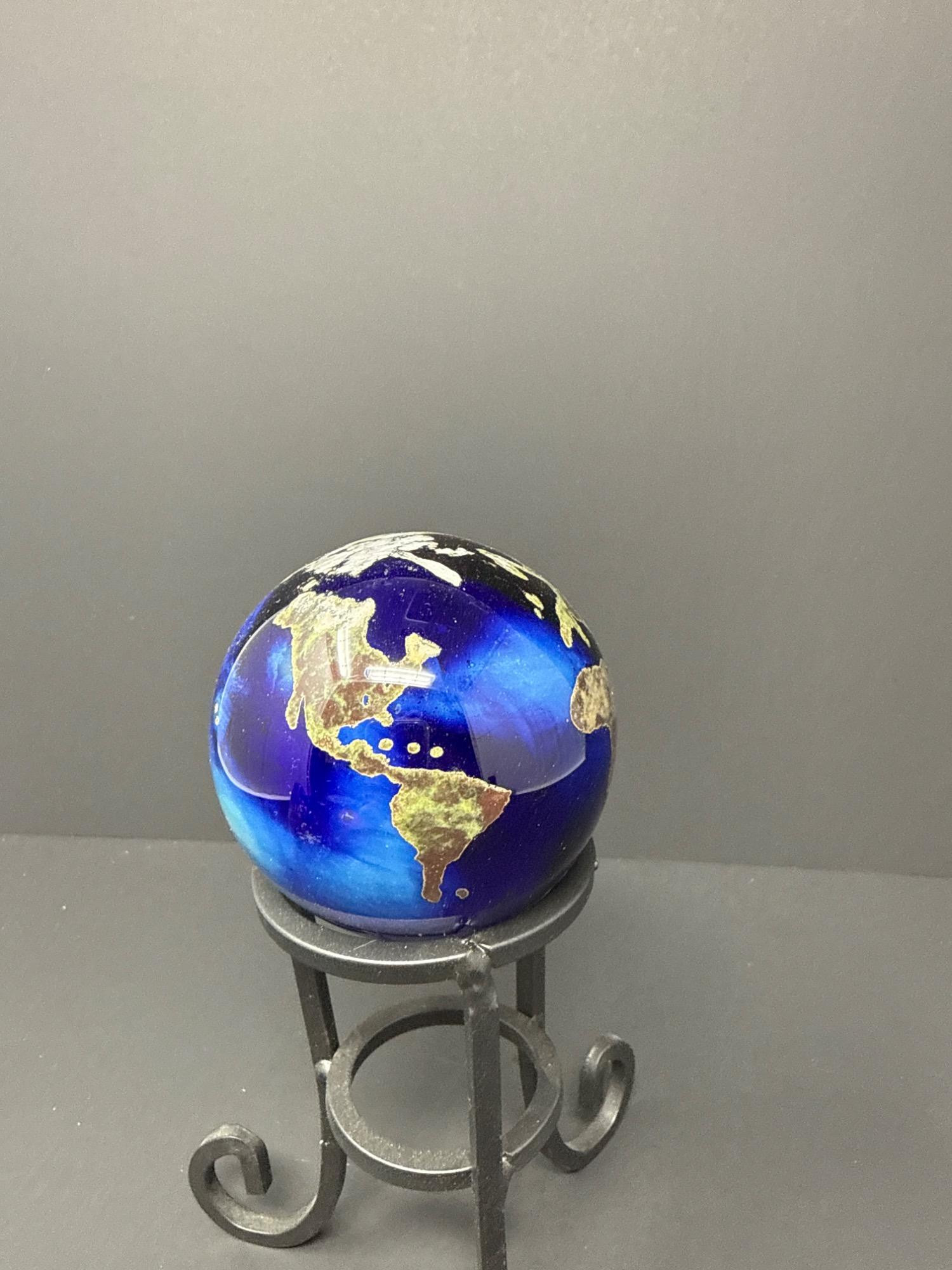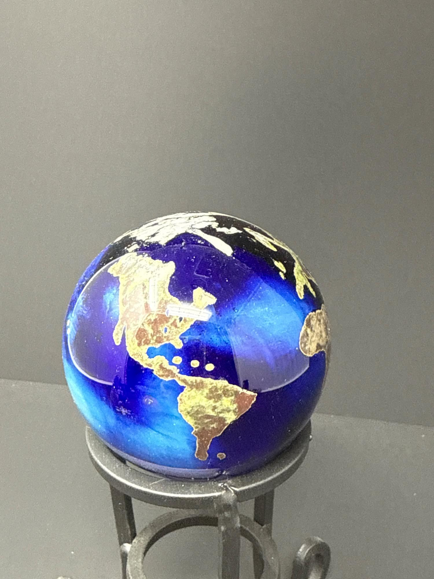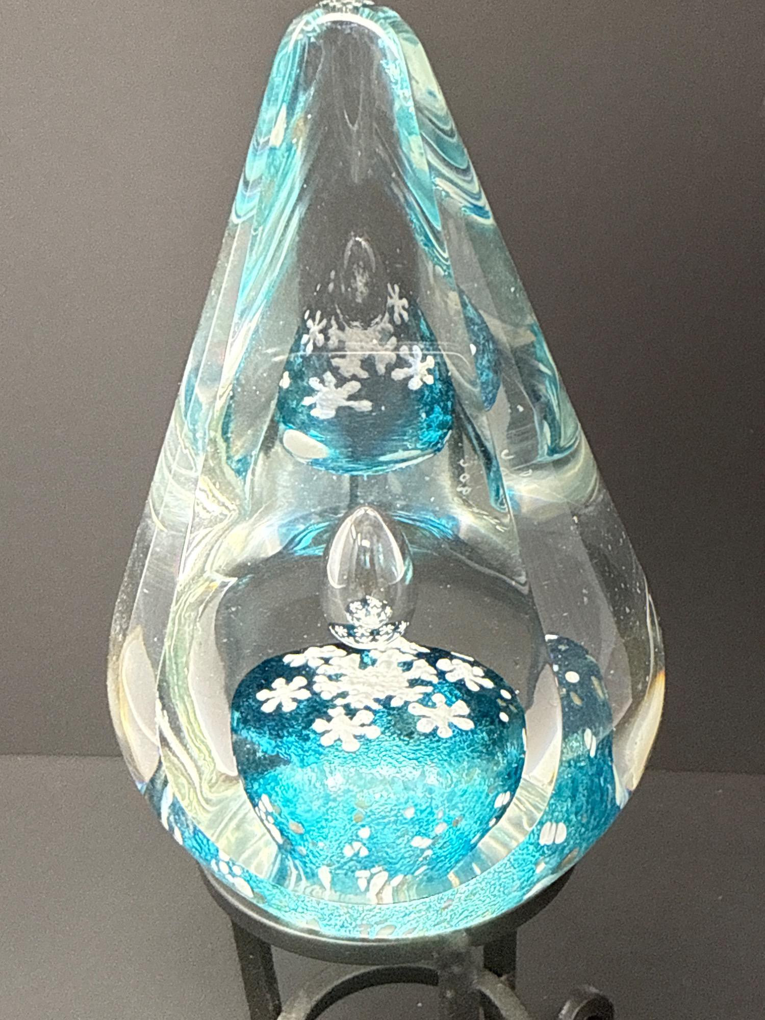 This beautiful trio of signed art glass paperweights includes vibrant and collectible pieces crafted with exceptional artistry: Teardrop Snowflake Paperweight (Four Seasons) Dimensions: 4.5 inches tall x 3 inches wide Design: Clear glass teardrop with internal snowflake and glittering blue core Markings: Signed on the base; from the Four Seasons collection Orange Swirl “Jupiter” Paperweight (GES05) Dimensions: Approx. 3 inches in diameter Design: Swirling orange with shimmering silver accents, inspired by the planet Jupiter Markings: Signed Jupiter GES 05 on the base Glowing Blue Earth Globe Paperweight (Lundberg Studios) Dimensions: Approx. 2.25 inches in diameter Design: Deep cobalt glass with gold-tone continents, resembling Earth Markings: Signed Lundberg Studios 062790 on the base