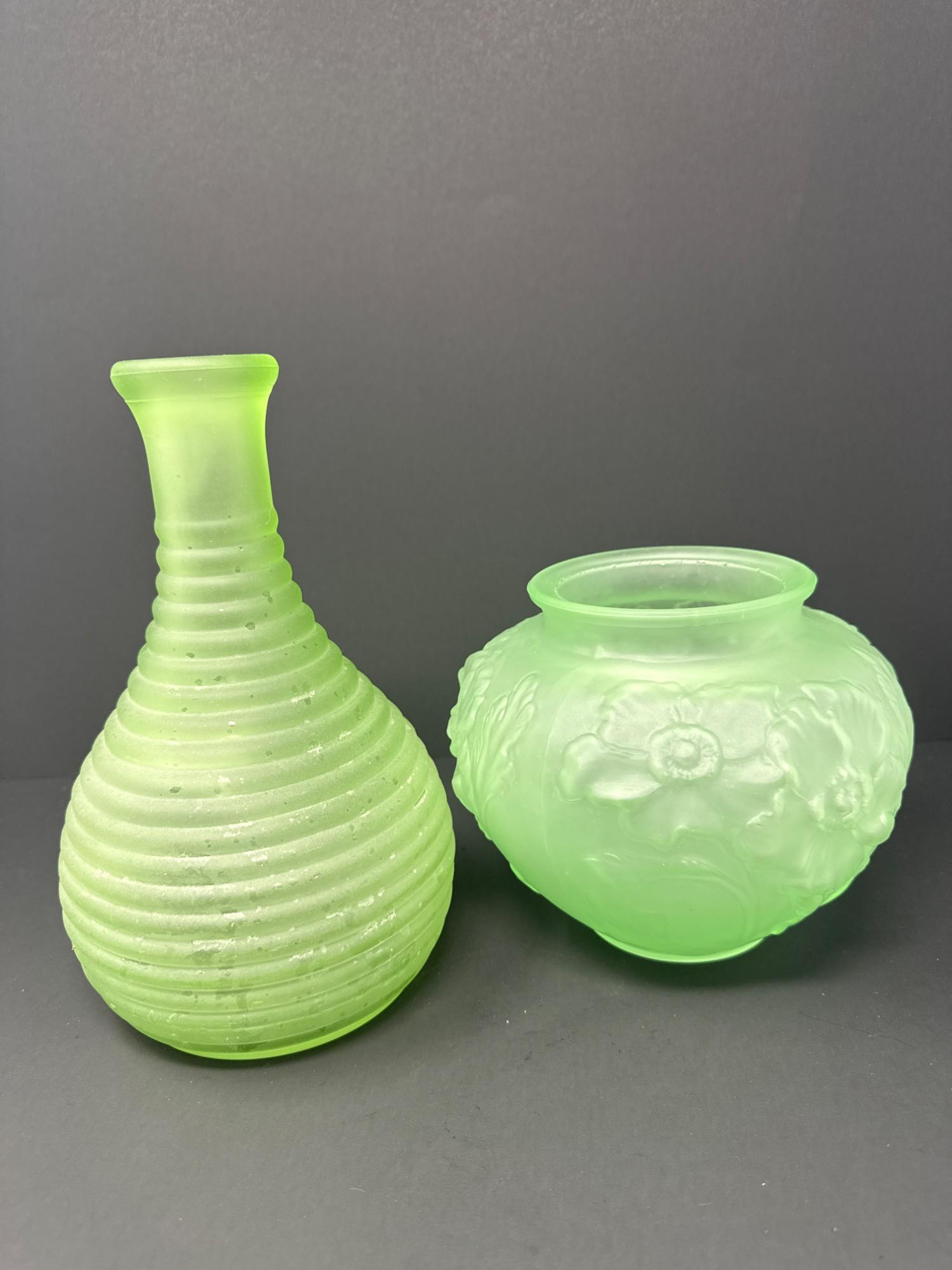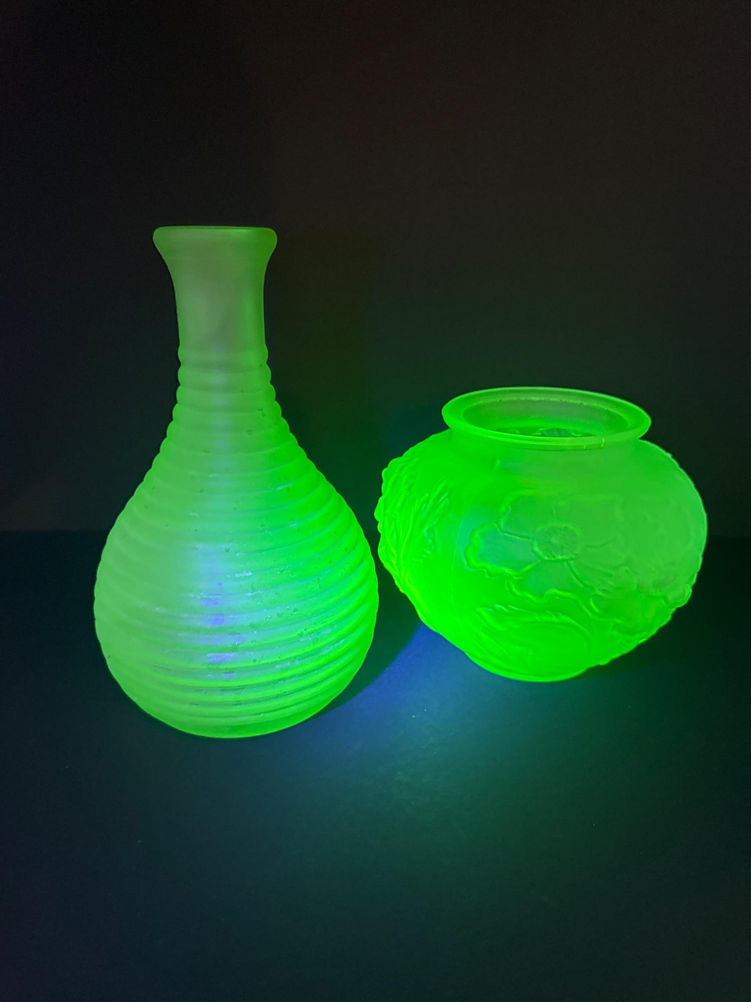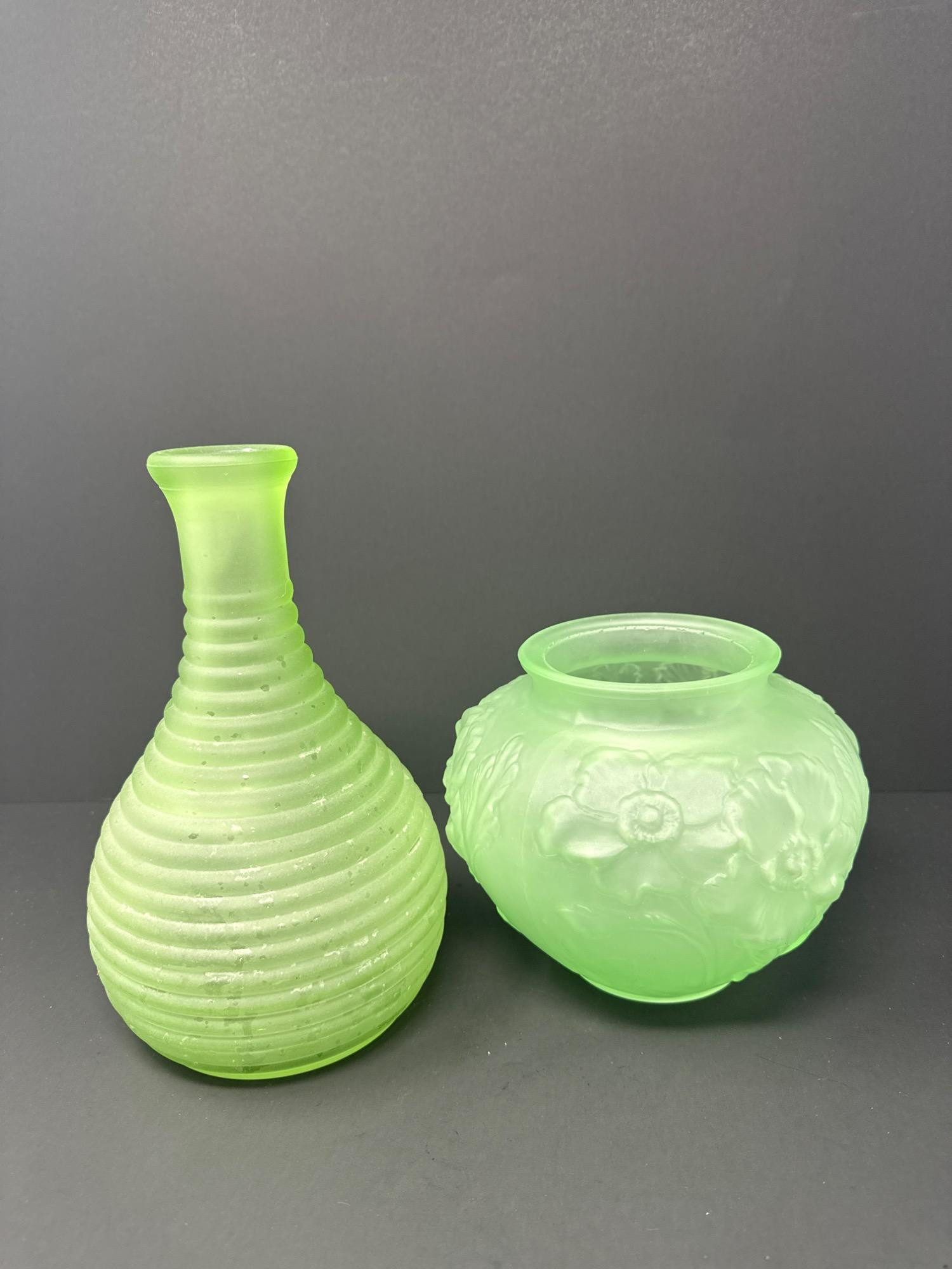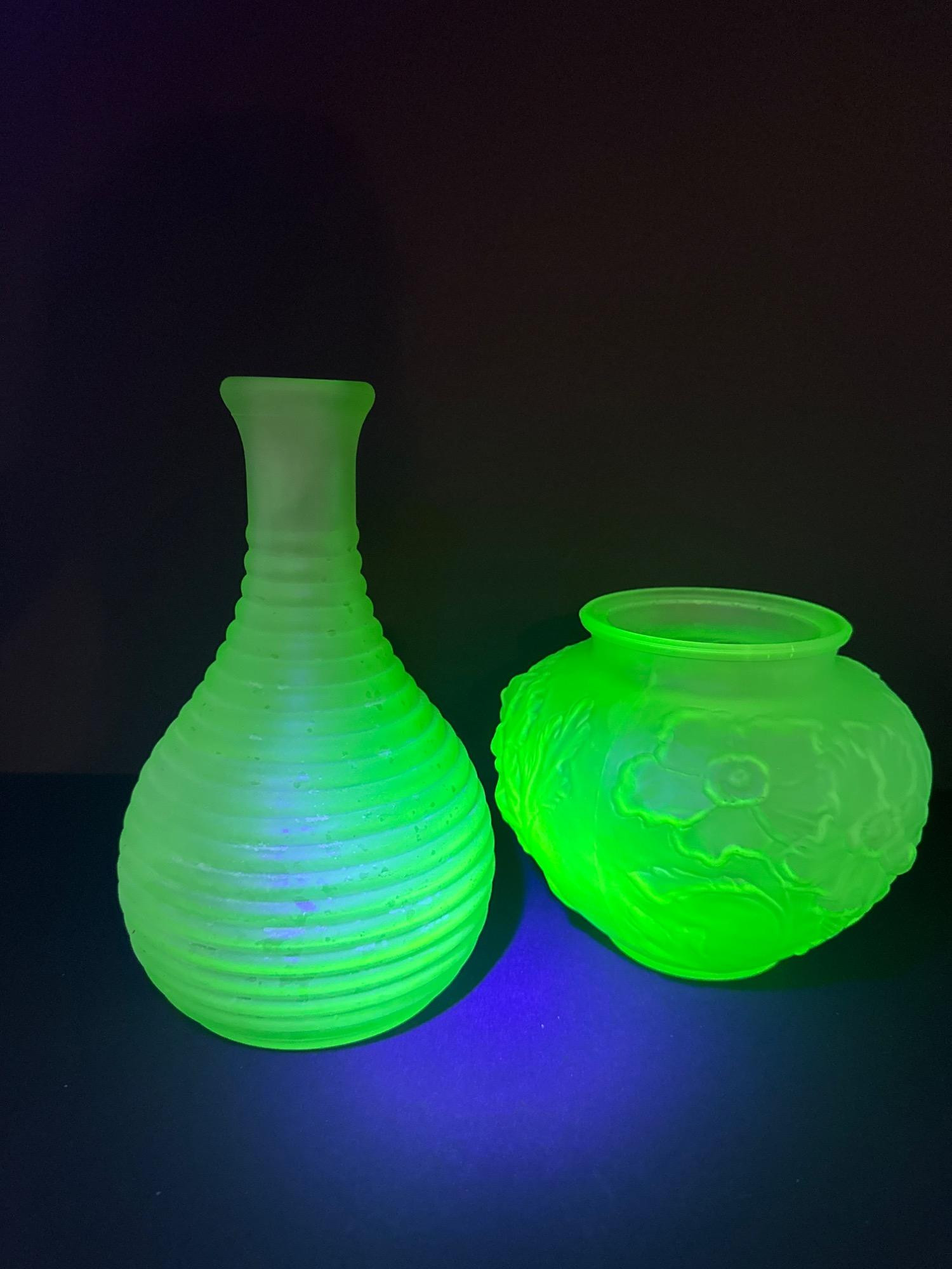 A stunning pair of vintage satin uranium glass vases from the 1930s, each with its own distinct charm and rich history. These pieces glow a brilliant neon green under UV light due to the uranium content in the glass, making them a standout addition to any glass or Art Deco collection. Details: Frigidaire Ribbed Bottle Vase Marked "Frigidaire" on the base Size: 9” Tall x 5” Wide Frosted satin finish with horizontal ribbing Originally a promotional item included with Frigidaire appliances in the 1930s Tiffin Poppy Flower Bowl Vase Unmarked, but attributed to Tiffin Glass Company Size: 6” Tall x 6.5” Wide Embossed floral and leaf motif with a wide, rounded body Satin uranium glass with glowing floral details under blacklight