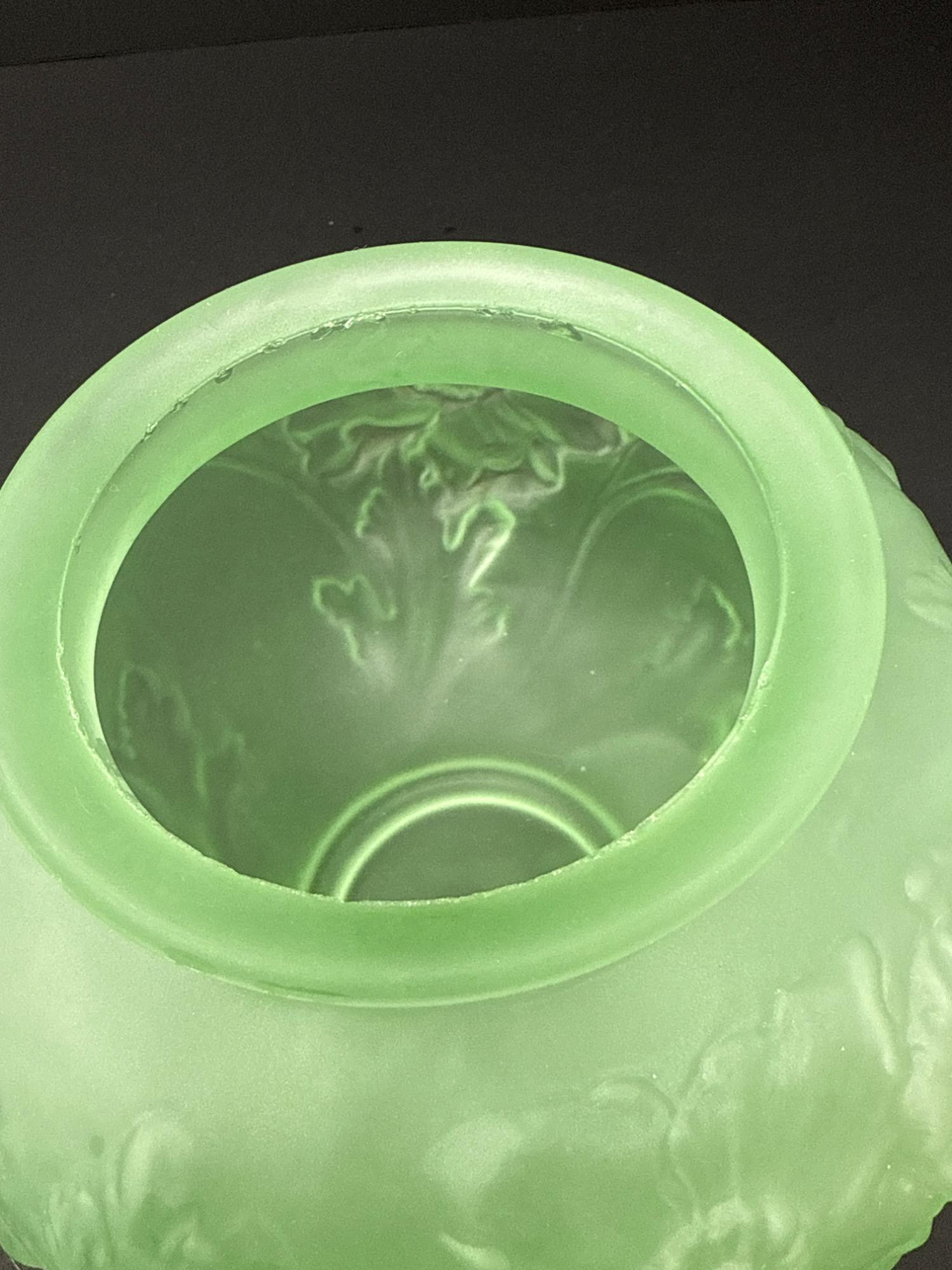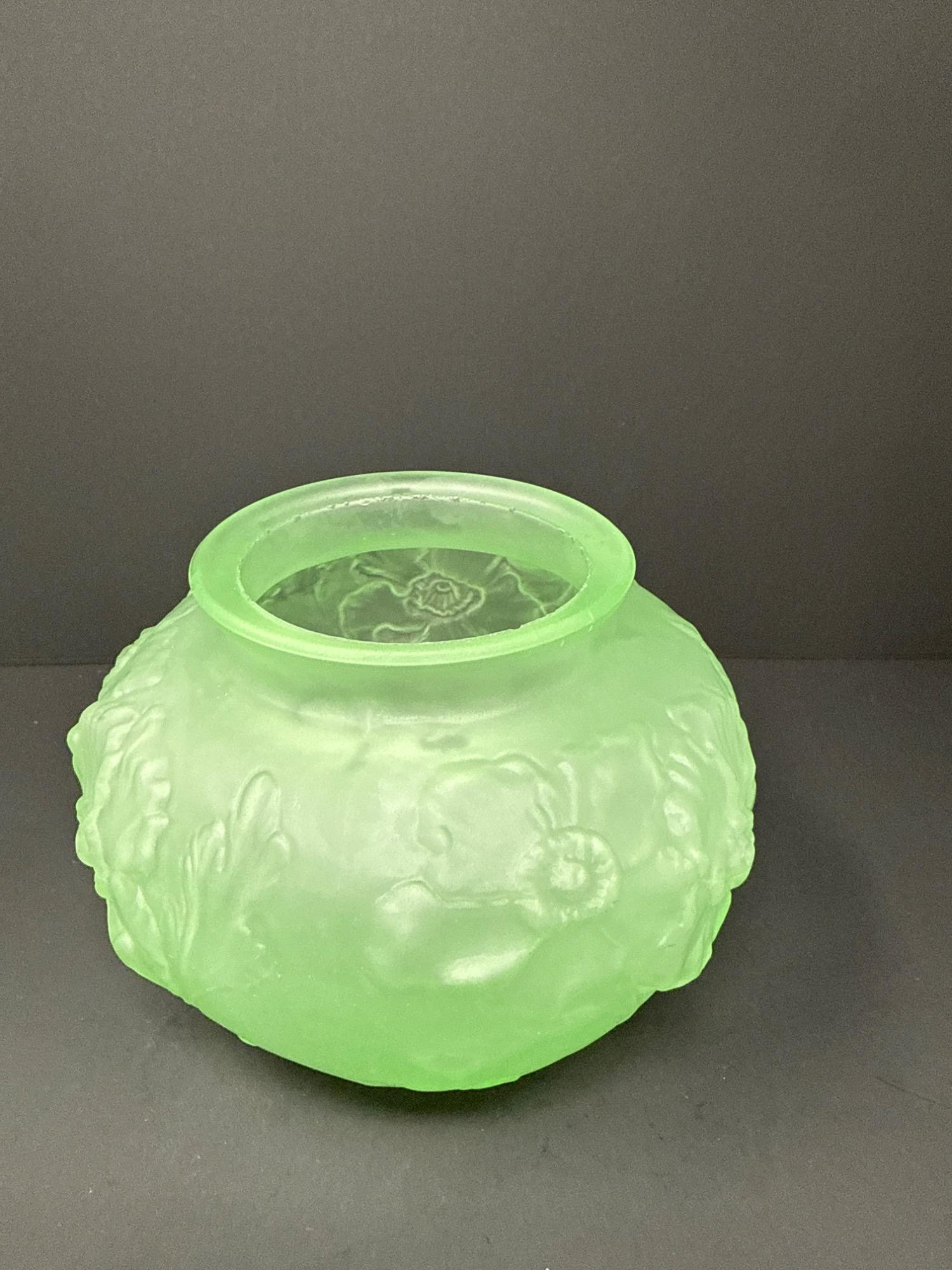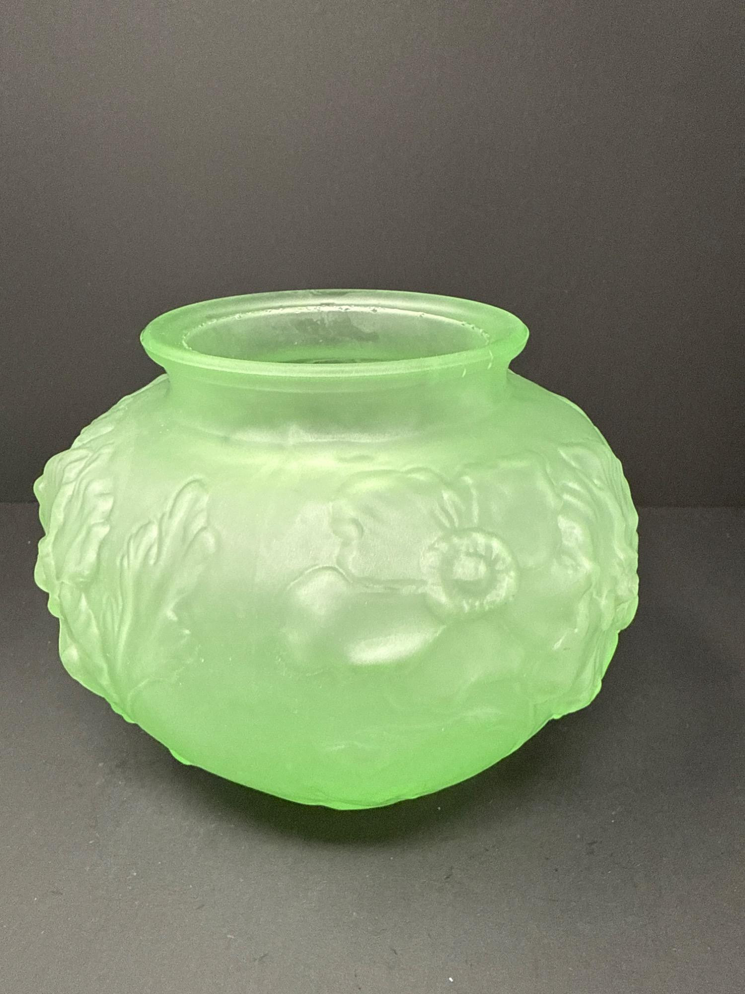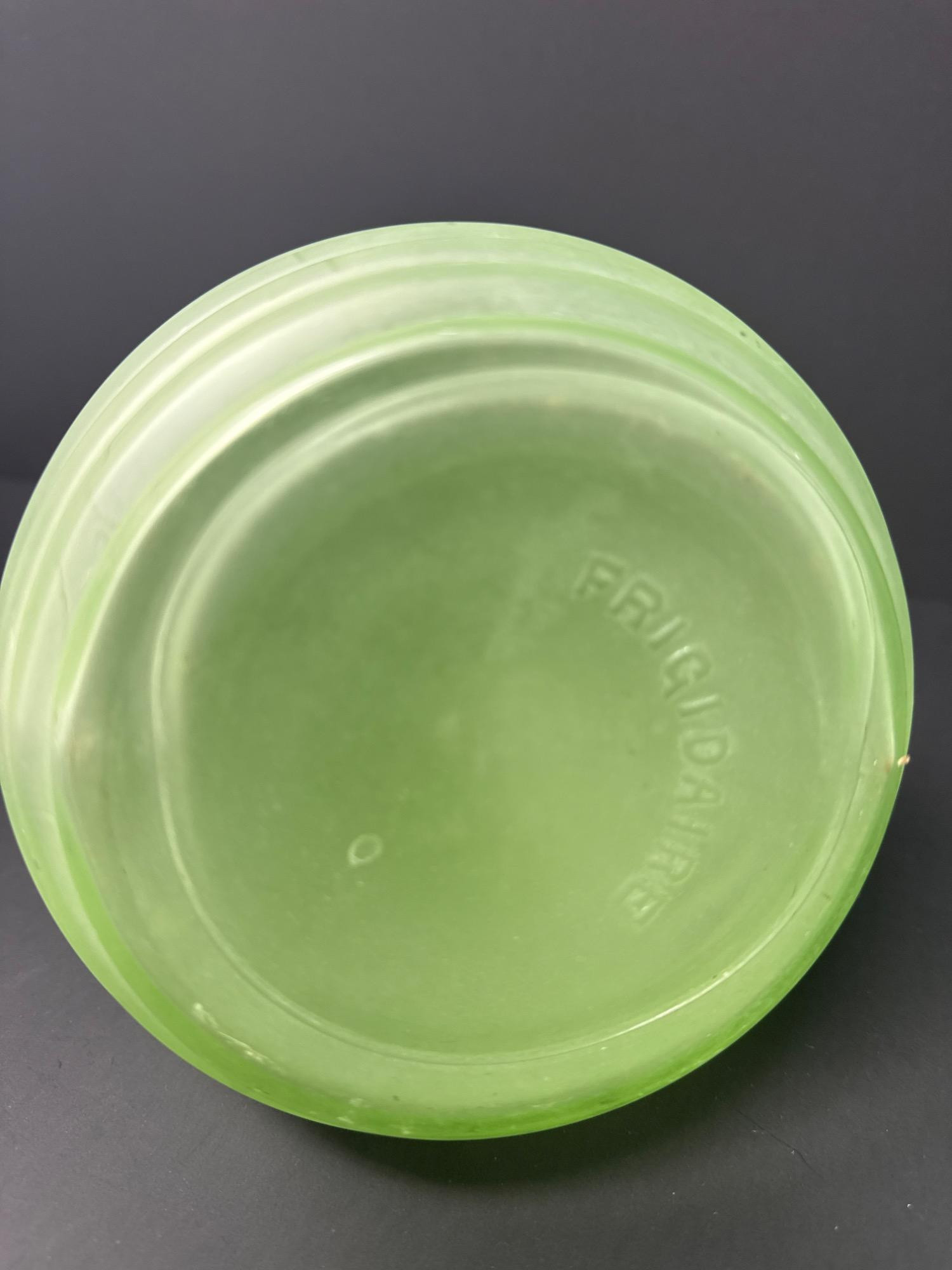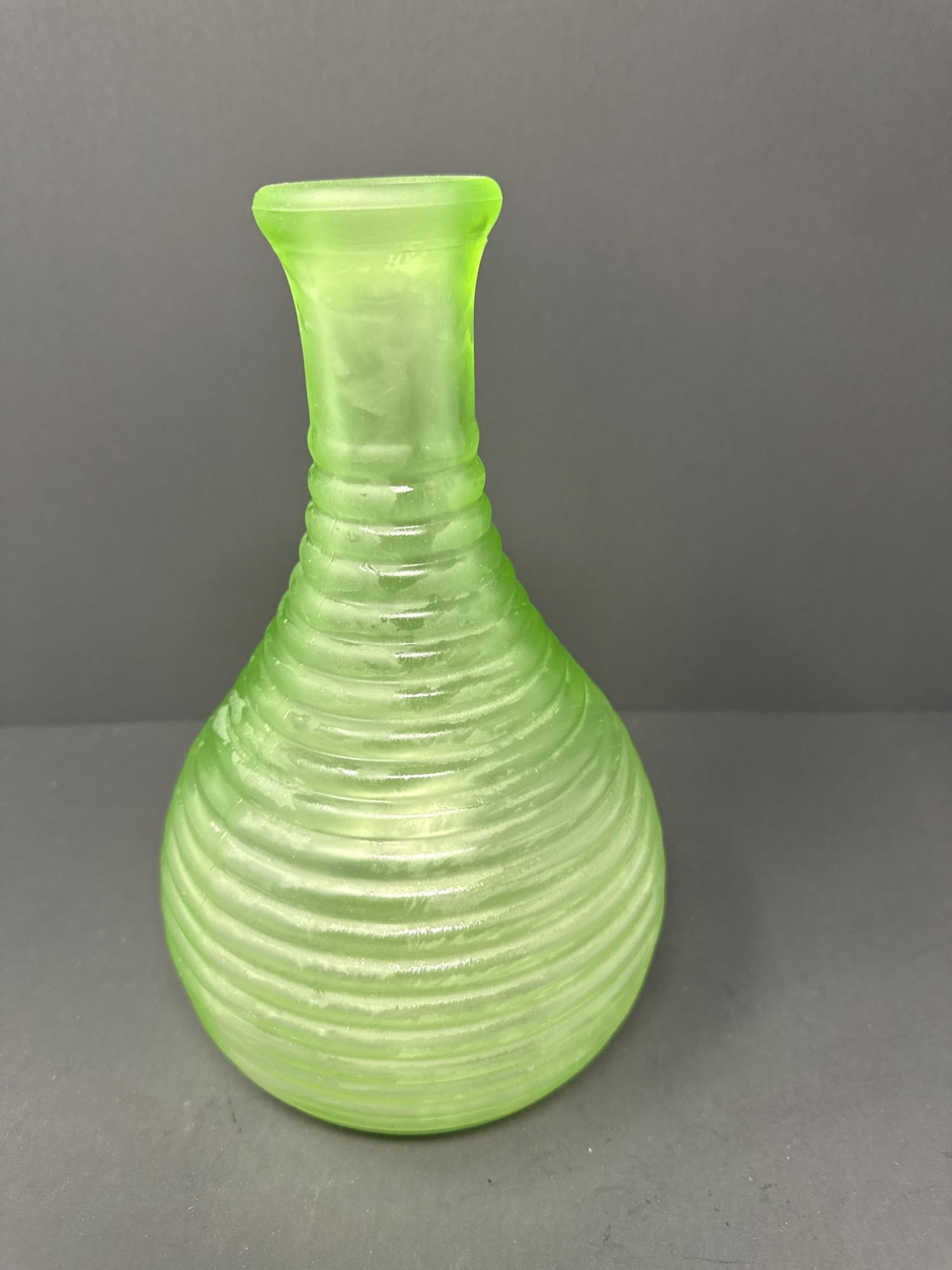 A stunning pair of vintage satin uranium glass vases from the 1930s, each with its own distinct charm and rich history. These pieces glow a brilliant neon green under UV light due to the uranium content in the glass, making them a standout addition to any glass or Art Deco collection. Details: Frigidaire Ribbed Bottle Vase Marked "Frigidaire" on the base Size: 9” Tall x 5” Wide Frosted satin finish with horizontal ribbing Originally a promotional item included with Frigidaire appliances in the 1930s Tiffin Poppy Flower Bowl Vase Unmarked, but attributed to Tiffin Glass Company Size: 6” Tall x 6.5” Wide Embossed floral and leaf motif with a wide, rounded body Satin uranium glass with glowing floral details under blacklight
