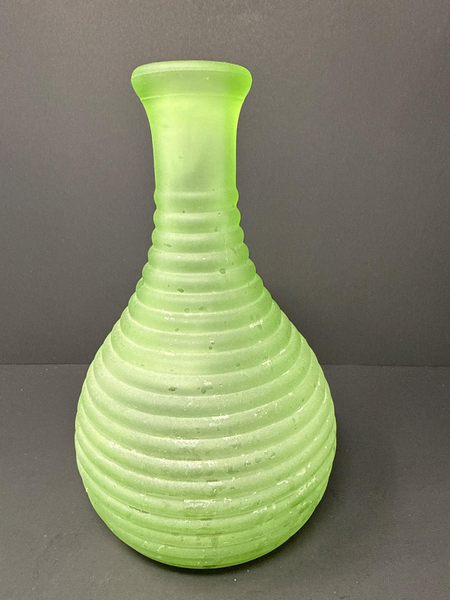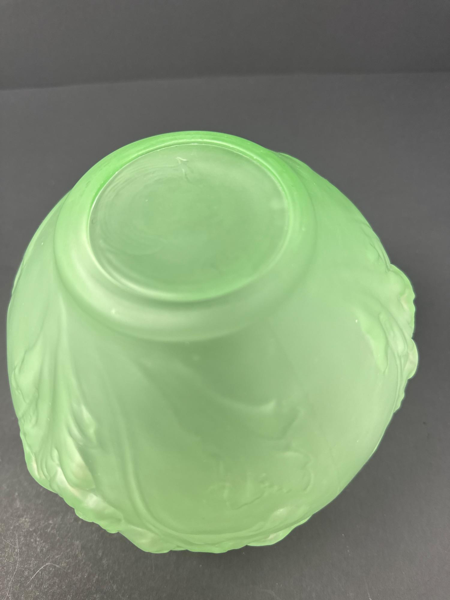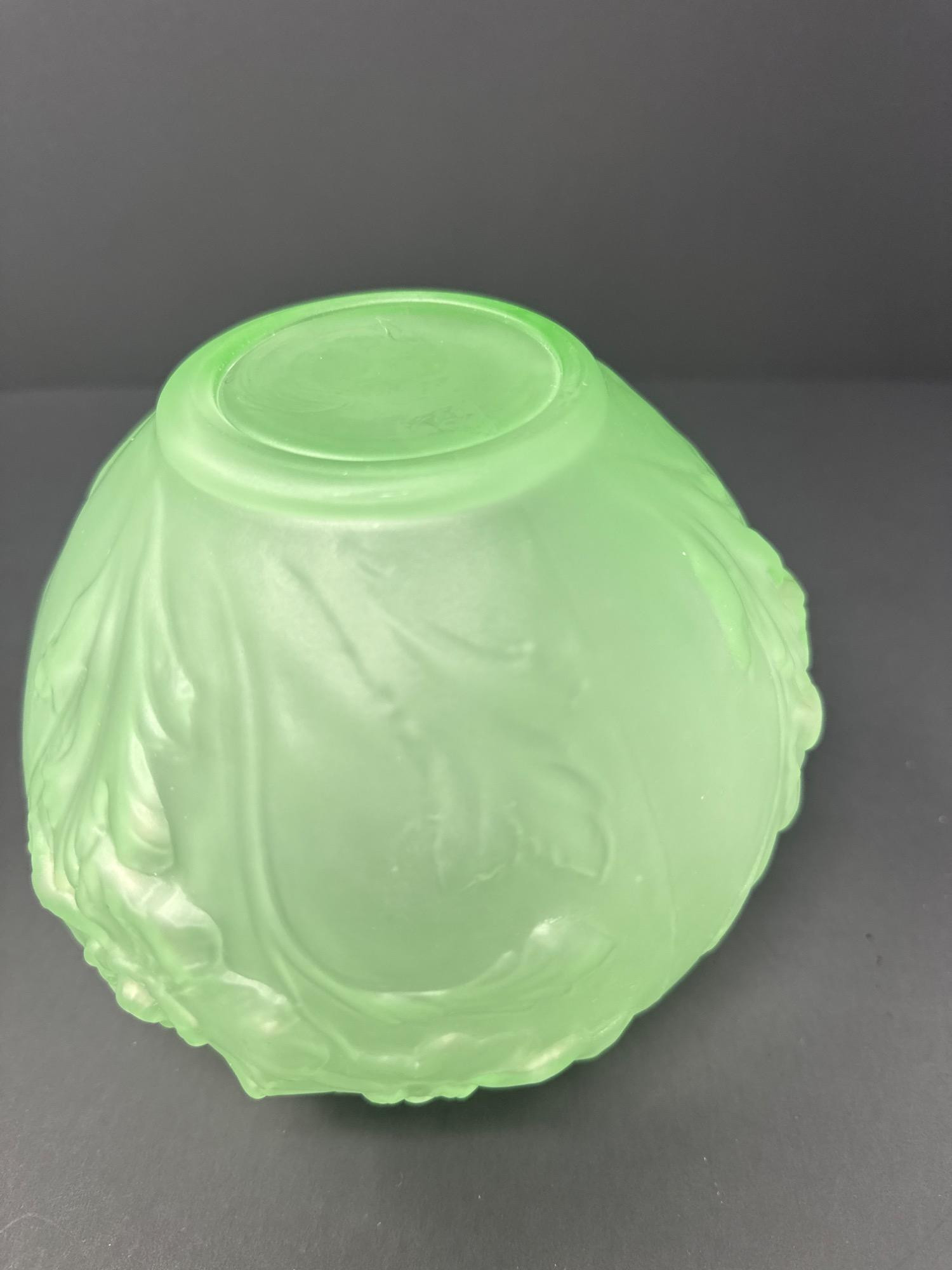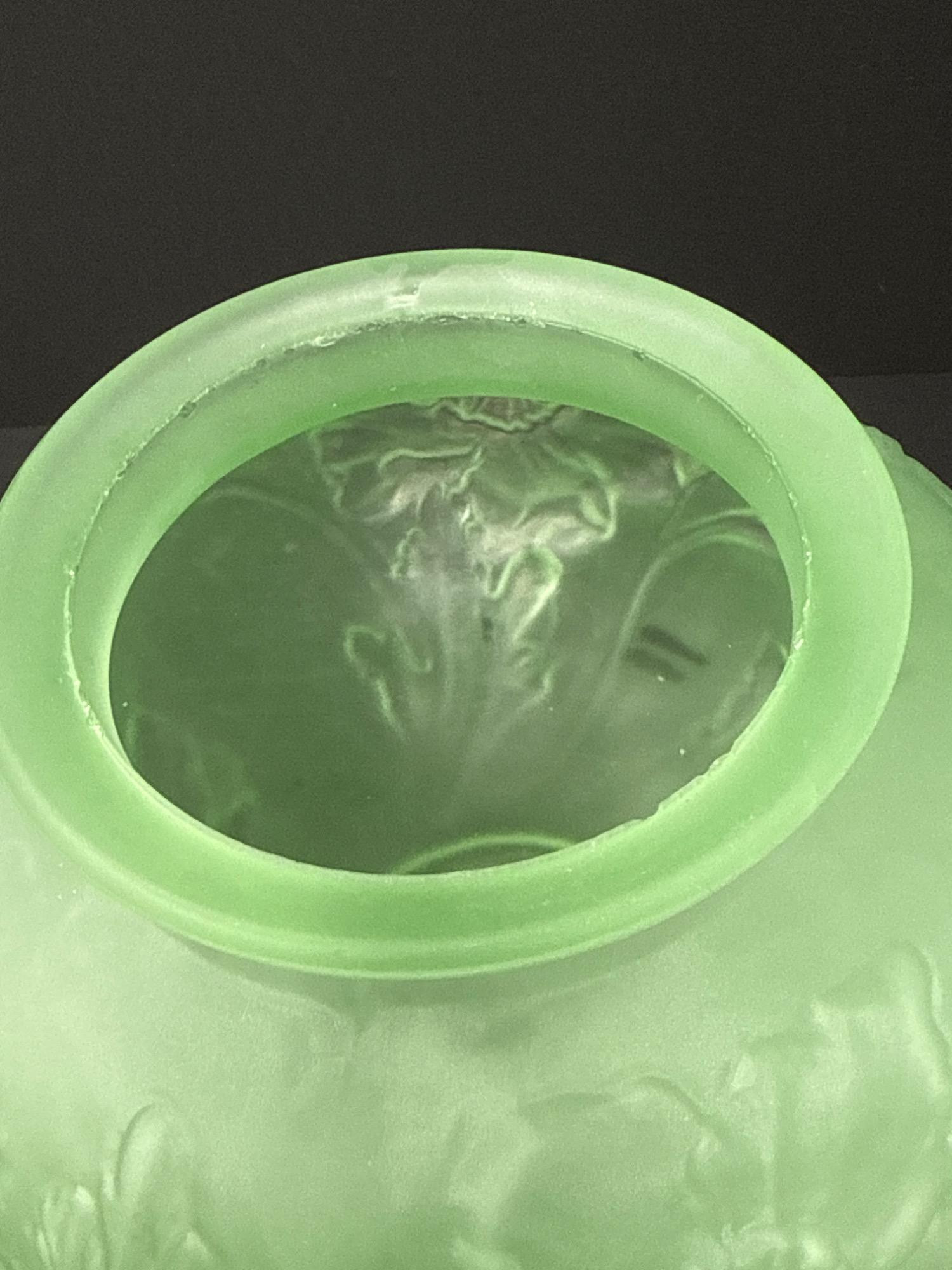 A stunning pair of vintage satin uranium glass vases from the 1930s, each with its own distinct charm and rich history. These pieces glow a brilliant neon green under UV light due to the uranium content in the glass, making them a standout addition to any glass or Art Deco collection. Details: Frigidaire Ribbed Bottle Vase Marked "Frigidaire" on the base Size: 9” Tall x 5” Wide Frosted satin finish with horizontal ribbing Originally a promotional item included with Frigidaire appliances in the 1930s Tiffin Poppy Flower Bowl Vase Unmarked, but attributed to Tiffin Glass Company Size: 6” Tall x 6.5” Wide Embossed floral and leaf motif with a wide, rounded body Satin uranium glass with glowing floral details under blacklight