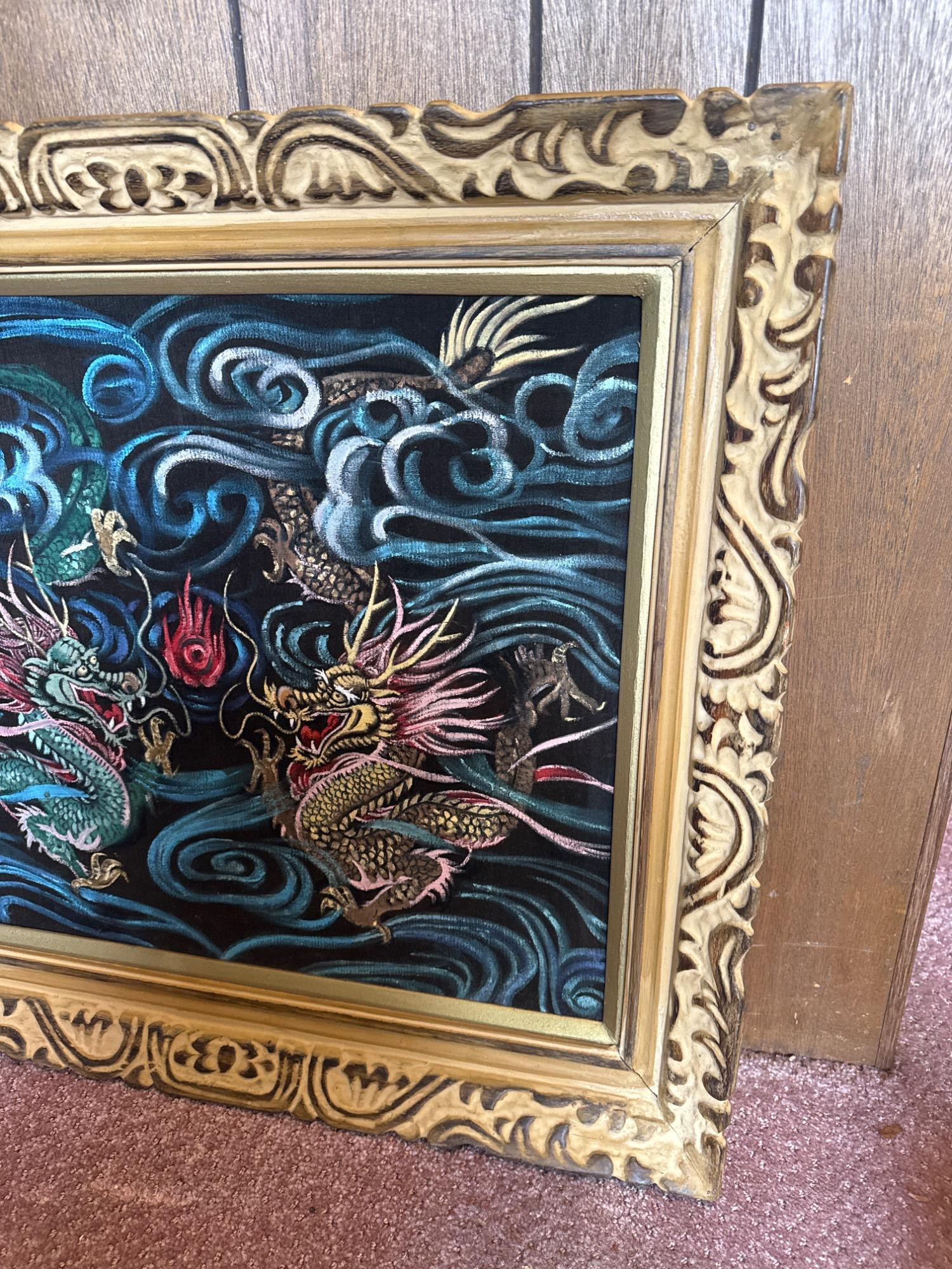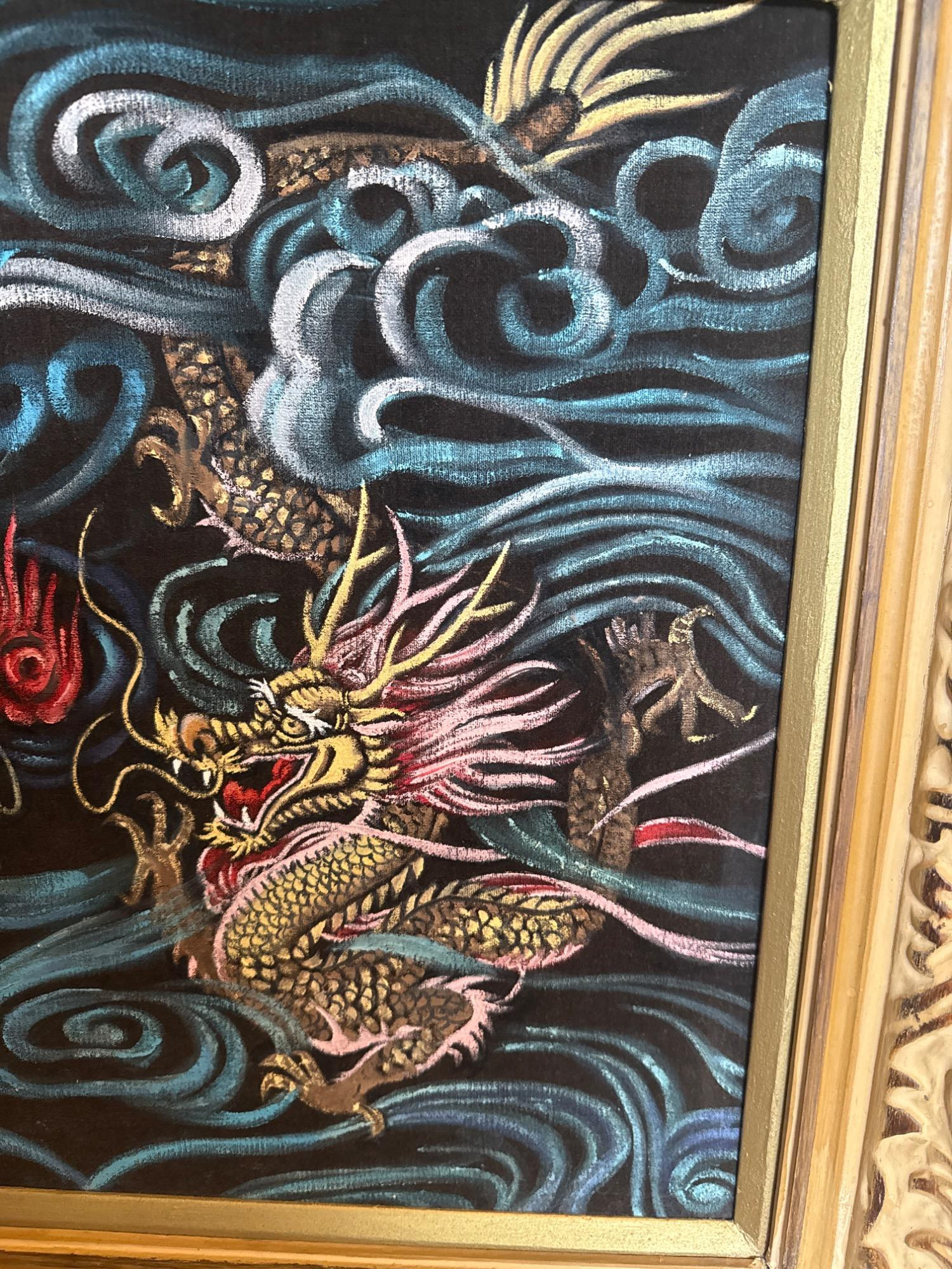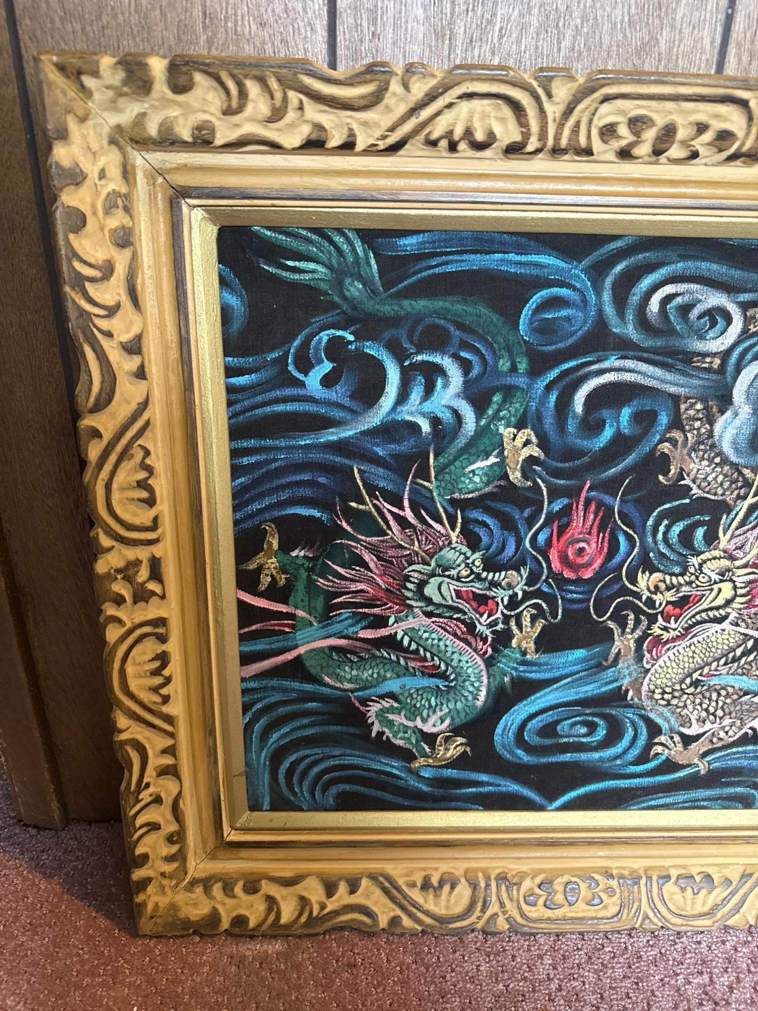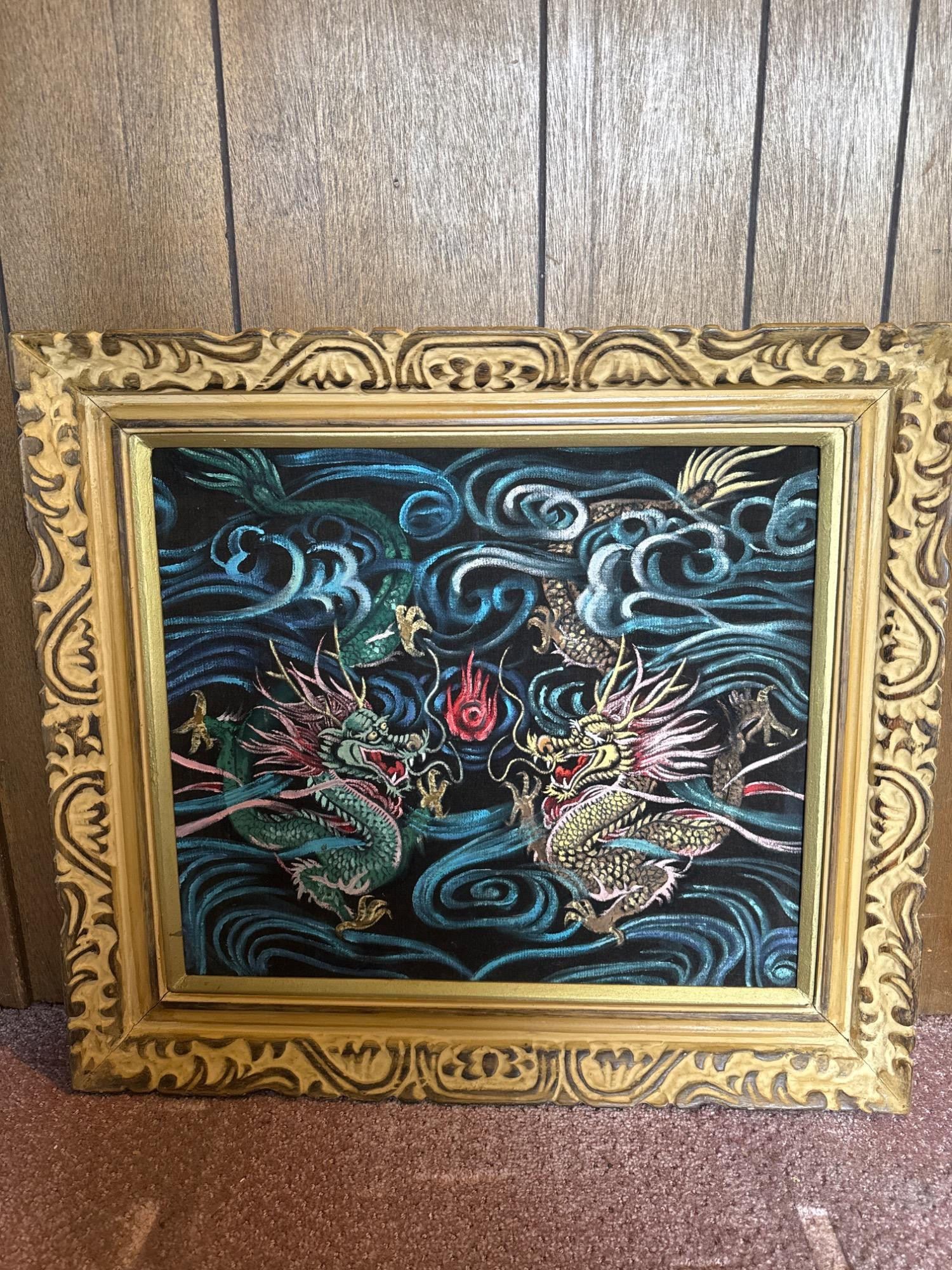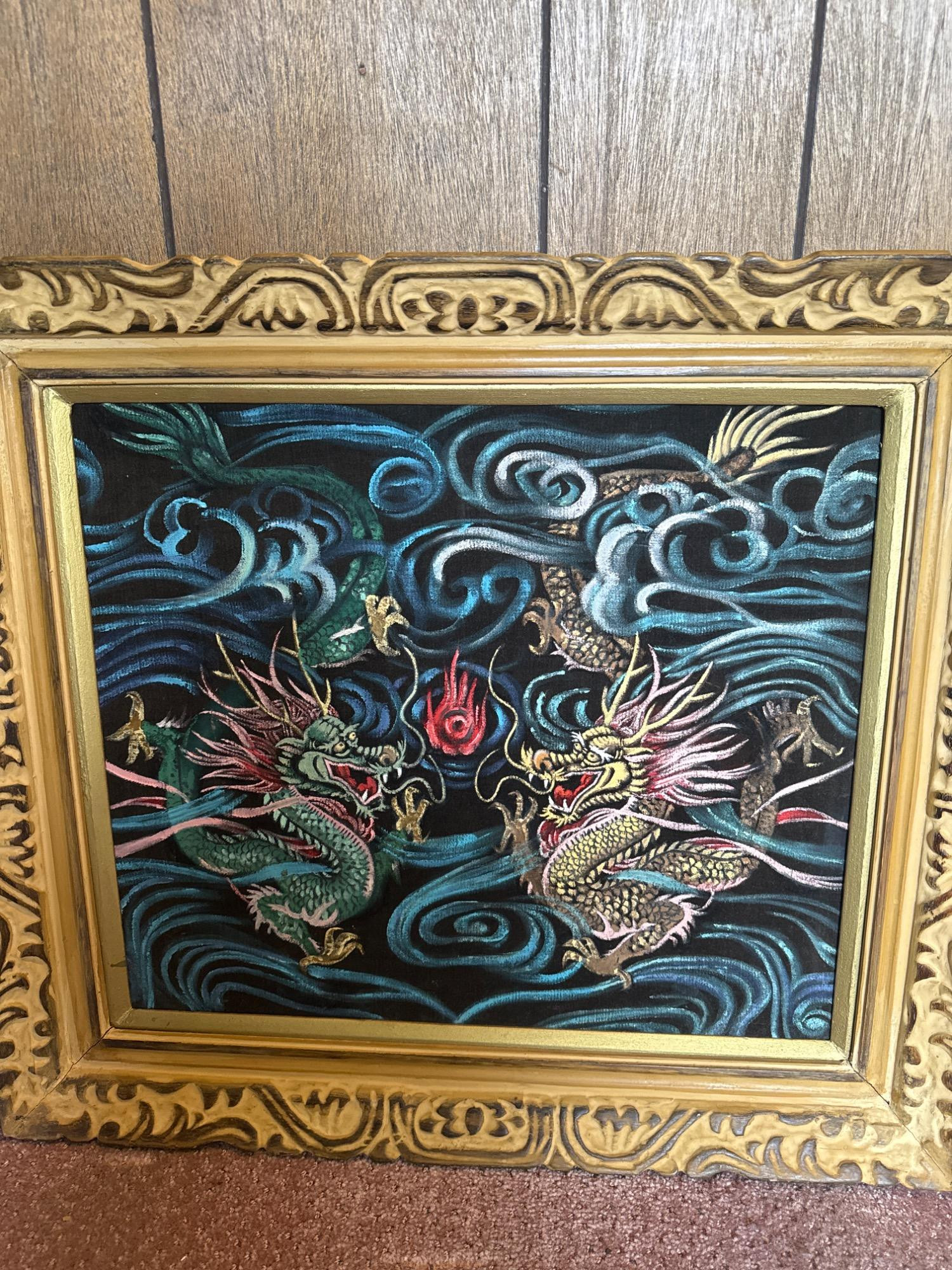 This vintage velvet artwork showcases two vibrant dragons facing each other in a dynamic scene filled with swirling clouds and a central red flame. The detailed patterns, bold lines, and deep colors create a vivid, almost 3D visual effect against the black velvet background. Features: Dimensions: 26" W x 24" T Medium: Paint on black crushed velvet Richly colored and highly detailed dragon design Set on luxurious black crushed velvet Framed in an ornate, carved gold frame Ready to hang with attached wire on the back