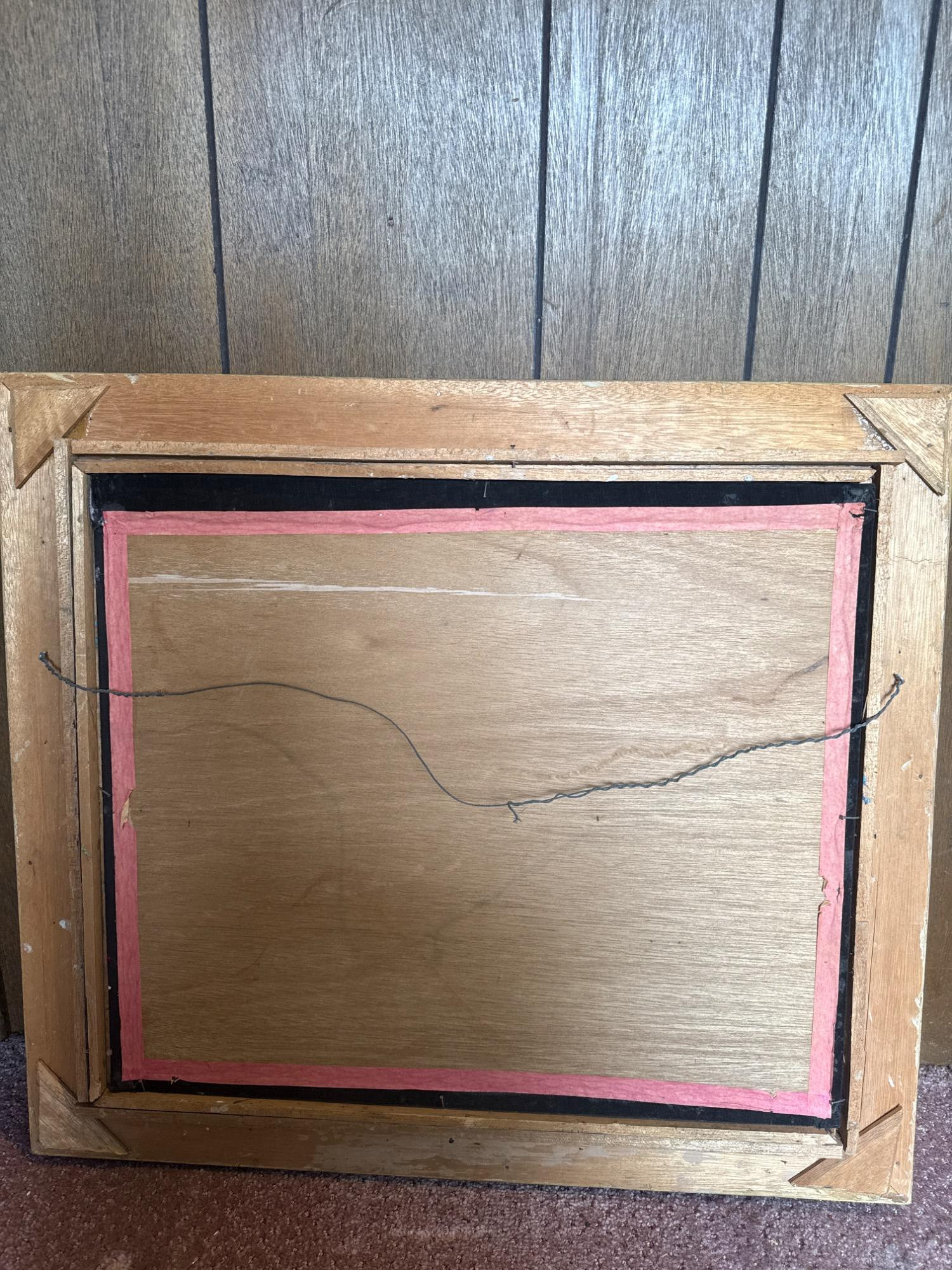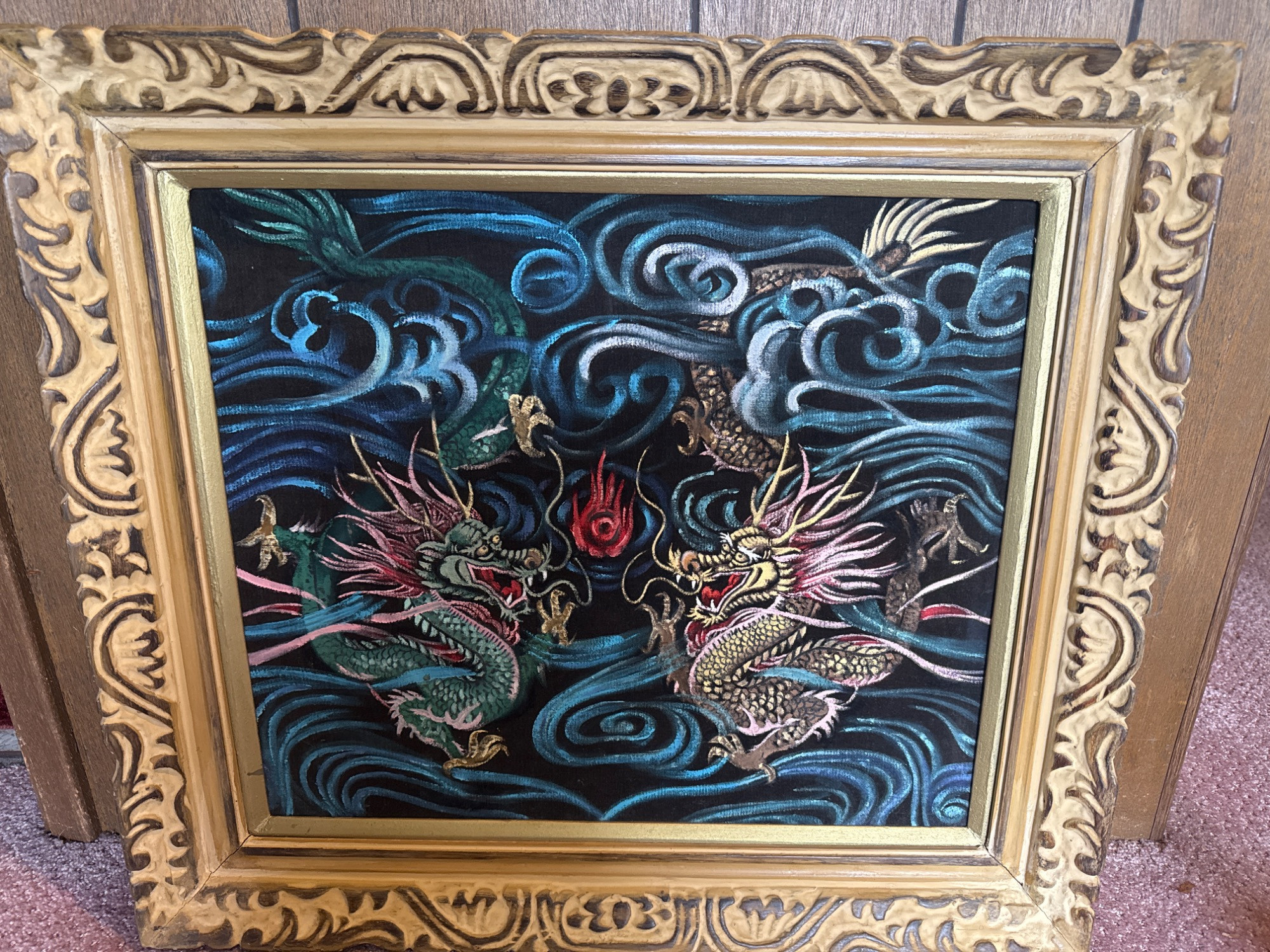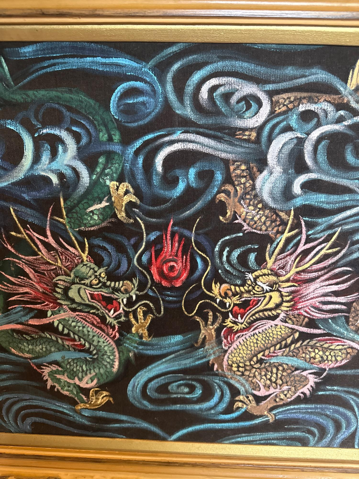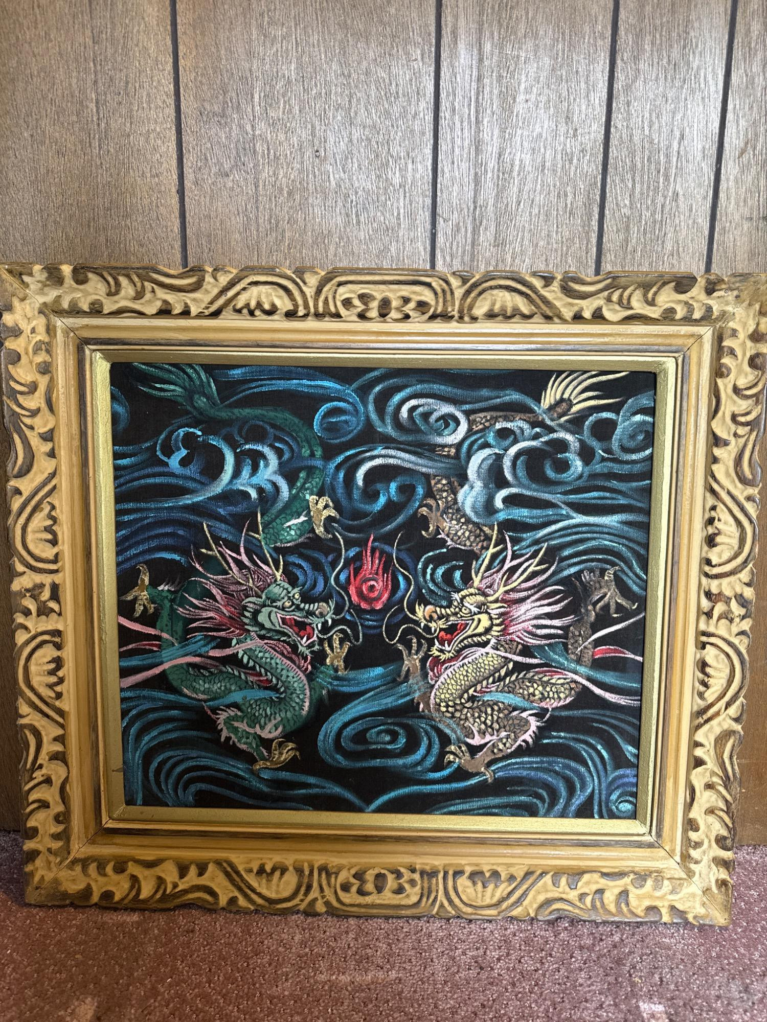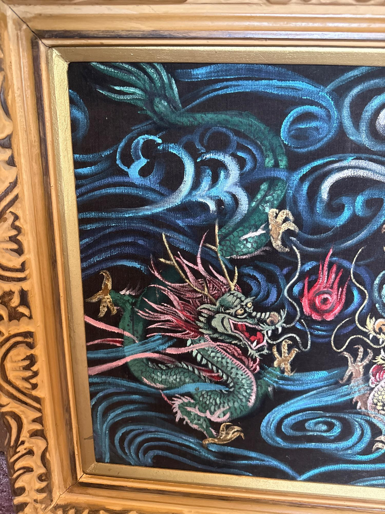 This vintage velvet artwork showcases two vibrant dragons facing each other in a dynamic scene filled with swirling clouds and a central red flame. The detailed patterns, bold lines, and deep colors create a vivid, almost 3D visual effect against the black velvet background. Features: Dimensions: 26" W x 24" T Medium: Paint on black crushed velvet Richly colored and highly detailed dragon design Set on luxurious black crushed velvet Framed in an ornate, carved gold frame Ready to hang with attached wire on the back