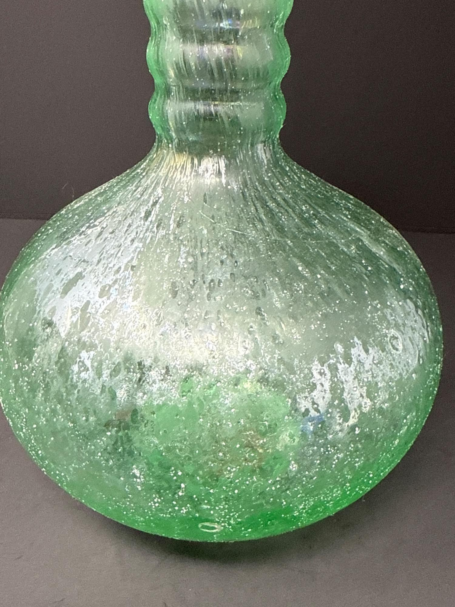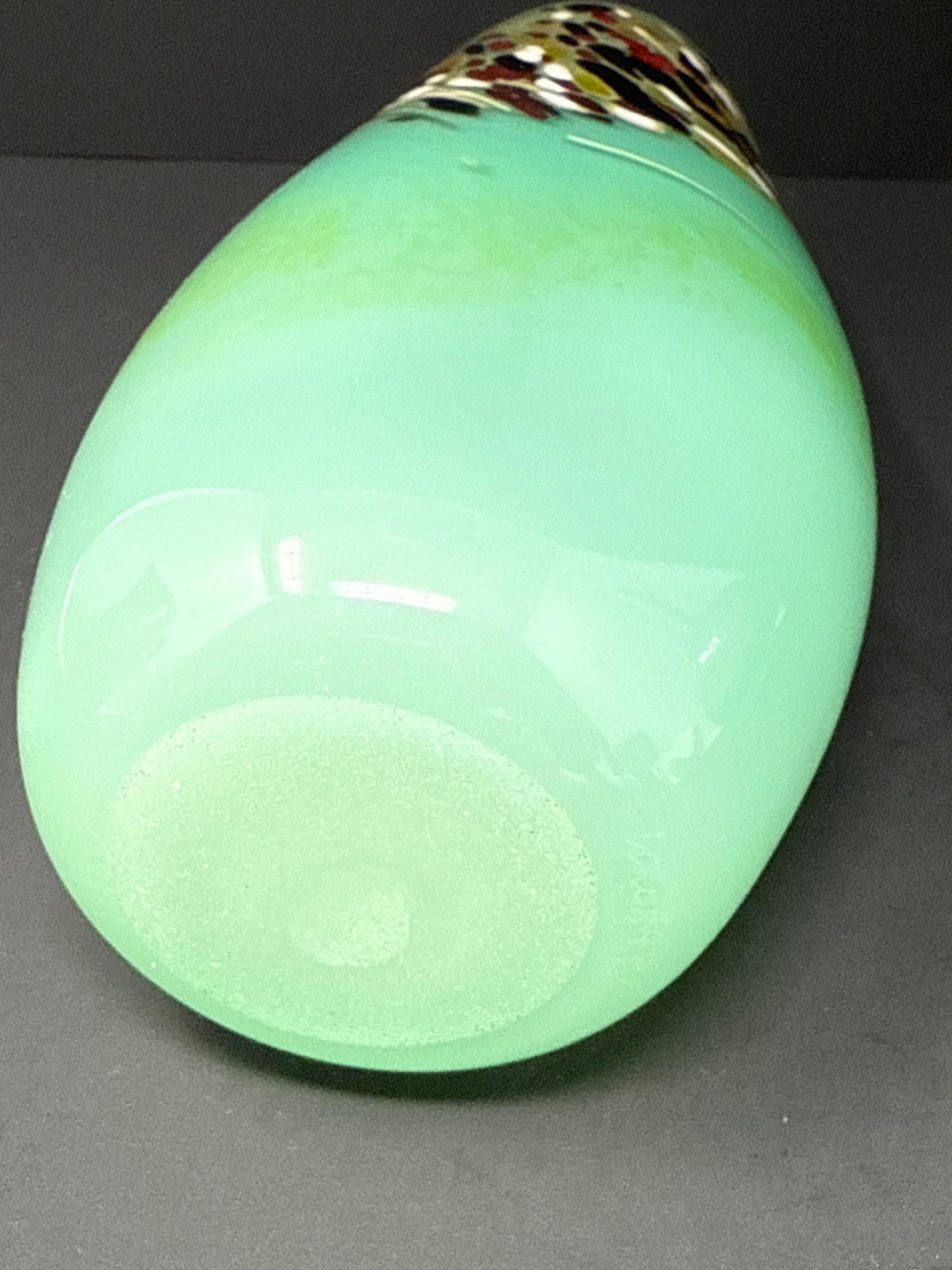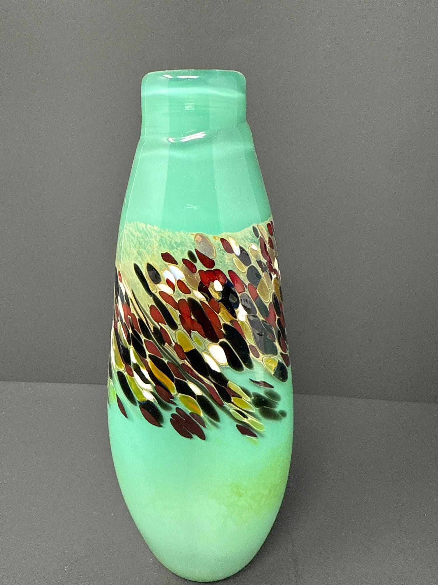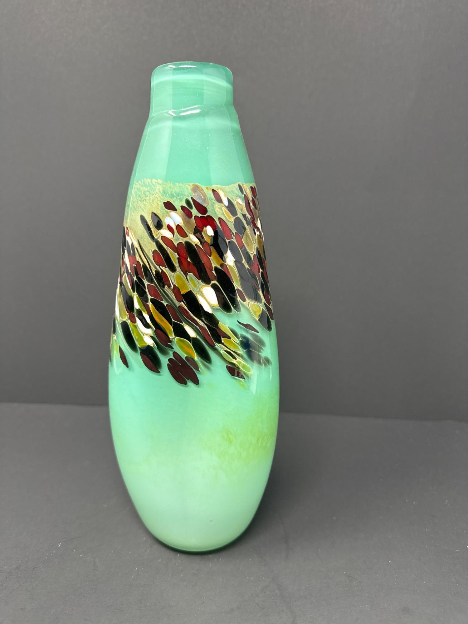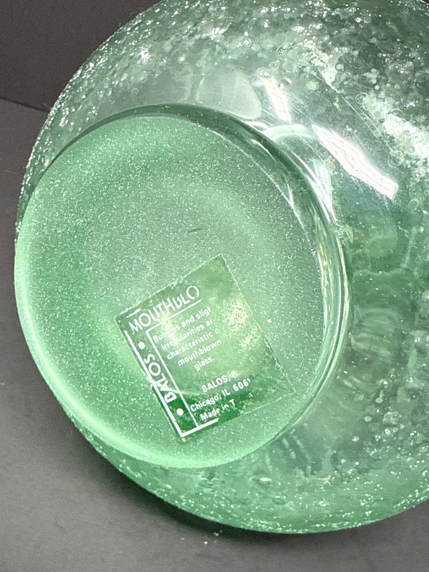 This visually striking pair of studio art glass vases showcases two unique forms of craftsmanship. Please note: Only the smaller vase is marked Balos. Balos Mouthblown Vase – 10” Tall A handblown piece with a bubble-textured surface and ribbed neck. The seafoam green coloring gives a fresh, airy vibe, while the natural imperfections (tiny bubbles and slight asymmetries) reflect its handcrafted quality. Retains original Balos label (Chicago, IL / Made in Turkey) Ribbed neck, bulbous base Fused Color Art Glass Vase – 9.5” Tall This taller vase features a smooth, glossy surface with an abstract cascade of fused glass in rich red, black, and white tones over a green ombré background. Elegant and vibrant, it adds a pop of artistry to any space. Unknown maker and signed Note: Only the large vase is marked Balos.