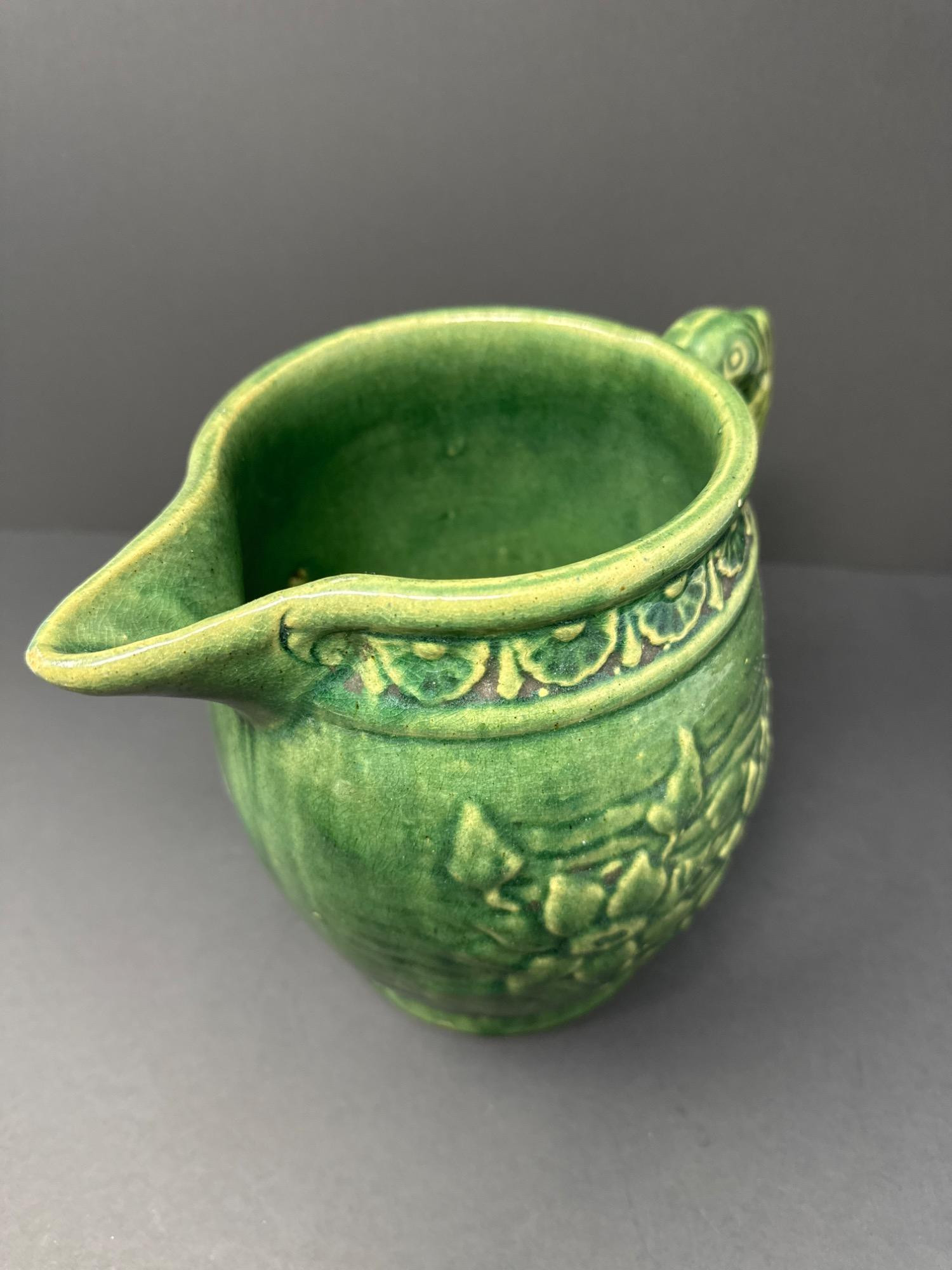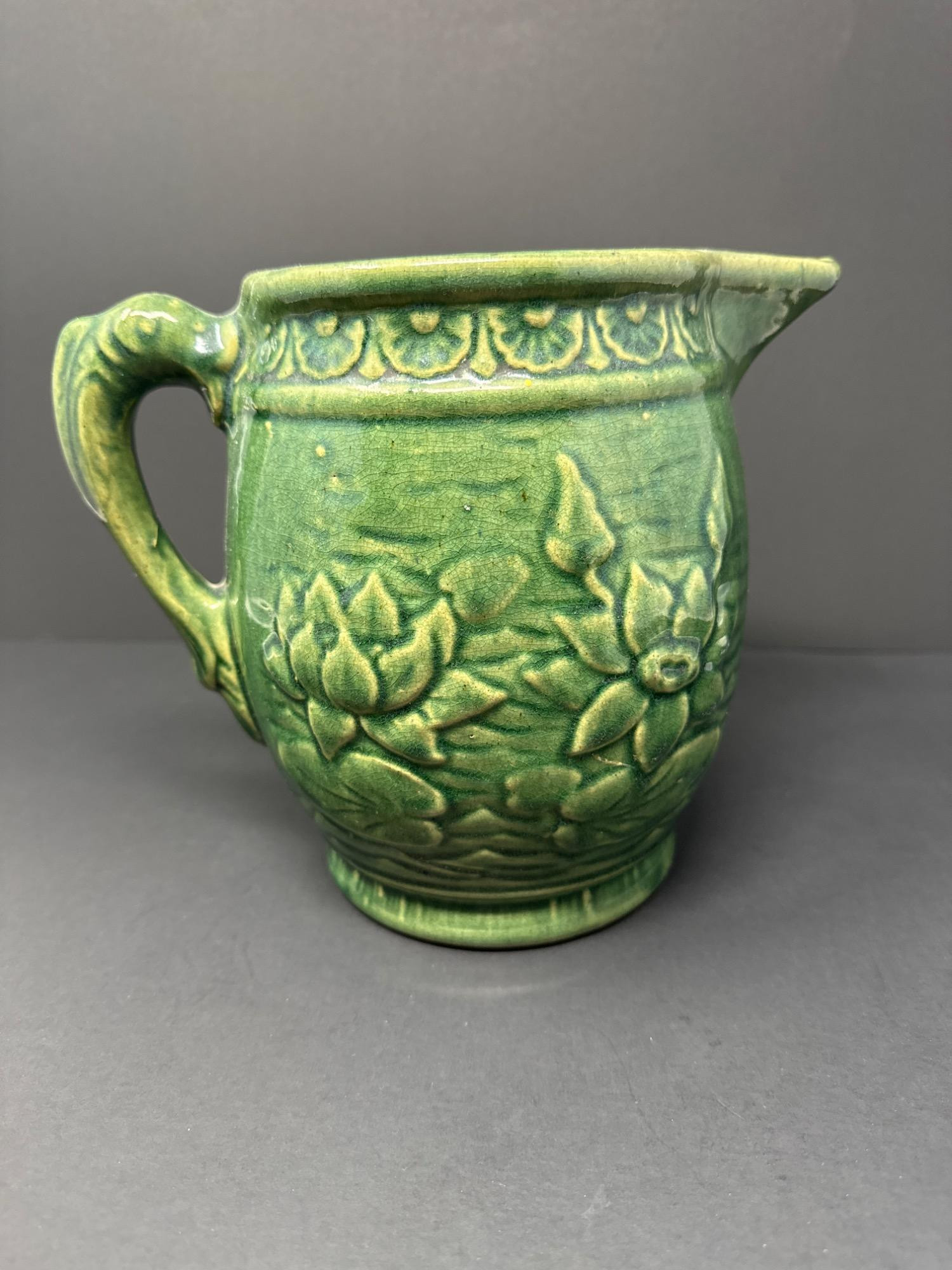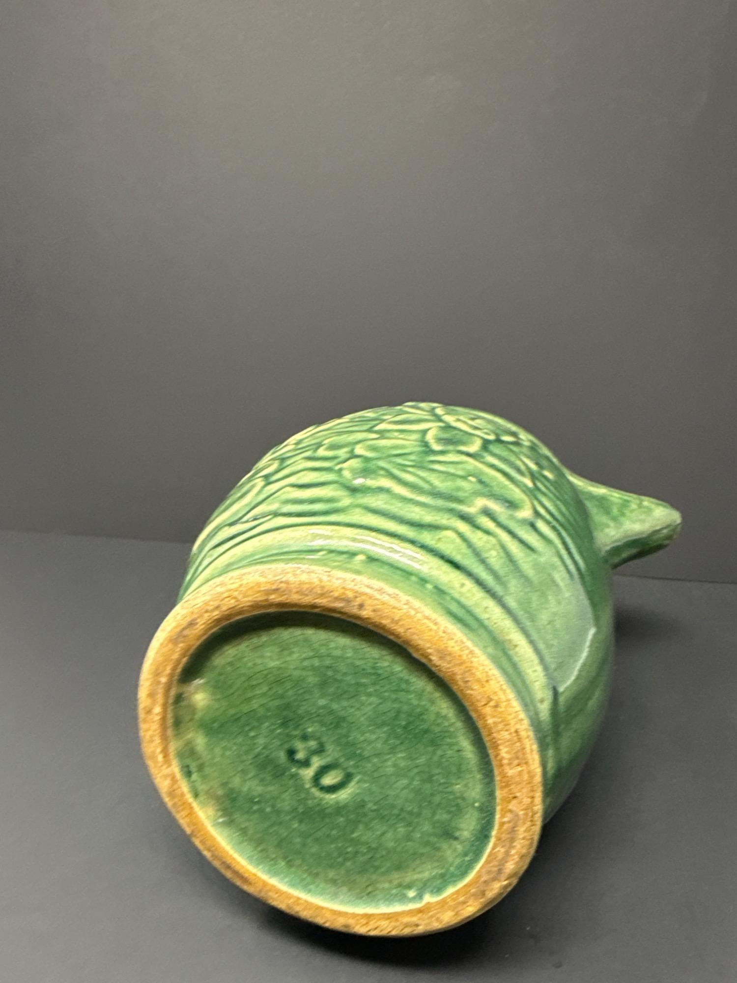 Vintage McCoy stoneware pitcher, produced circa 1935, featuring a classic green glaze with a raised lily pad floral motif and a stylized fish handle. This pitcher is a larger variation of the well-known McCoy “Lily Pad” line. Details: Manufacturer: McCoy Pottery Year: c.1935 Color: Glossy green glaze with rich tonal variation Design: Raised lily pad floral pattern with decorative rim border Handle: Sculpted with fish-tail or leaf-like styling Base Marking: Stamped “30” on the underside Material: Stoneware Dimensions: 7.5"H x 9"W