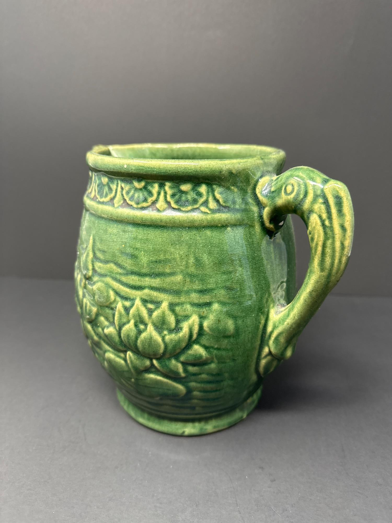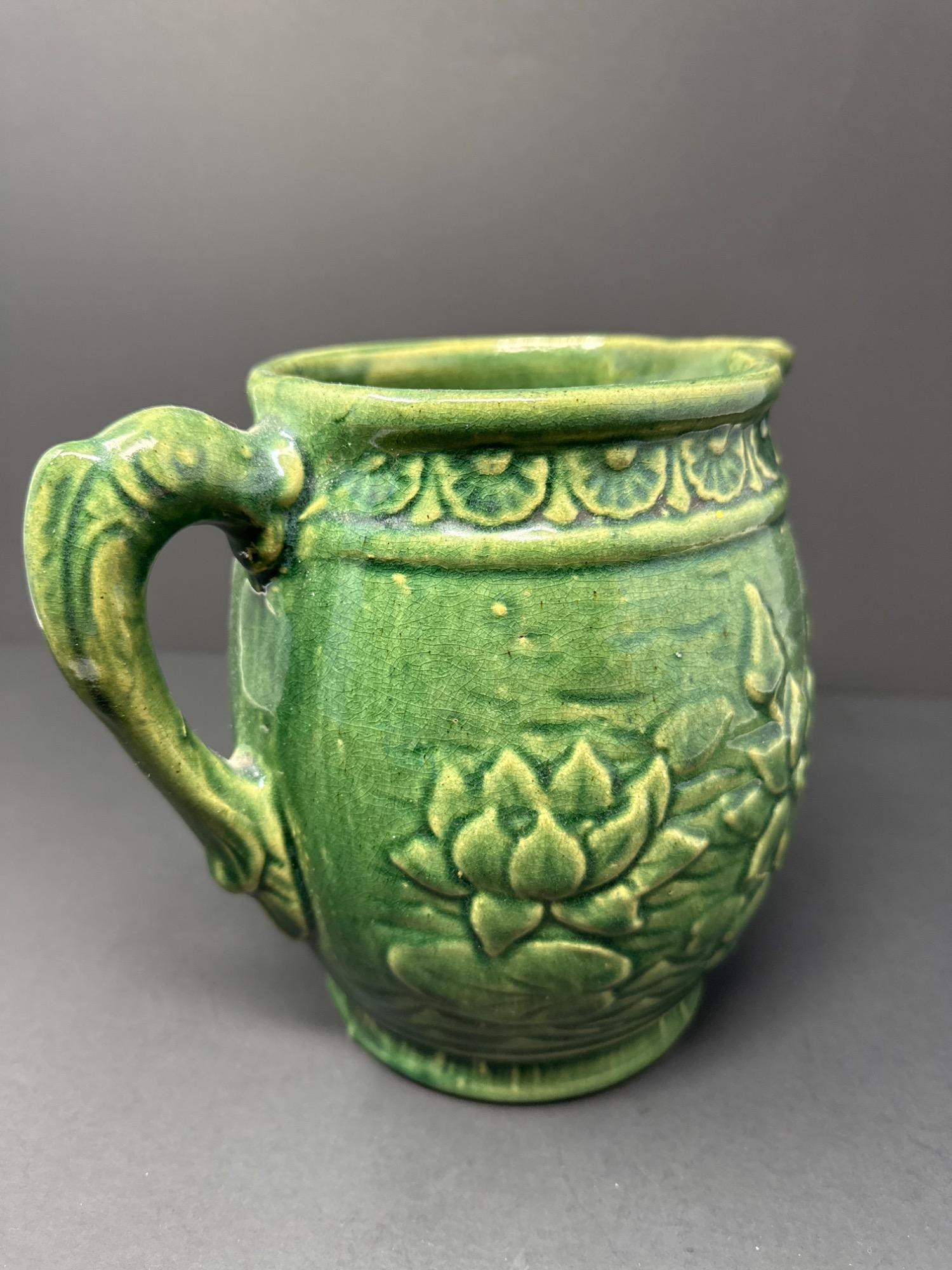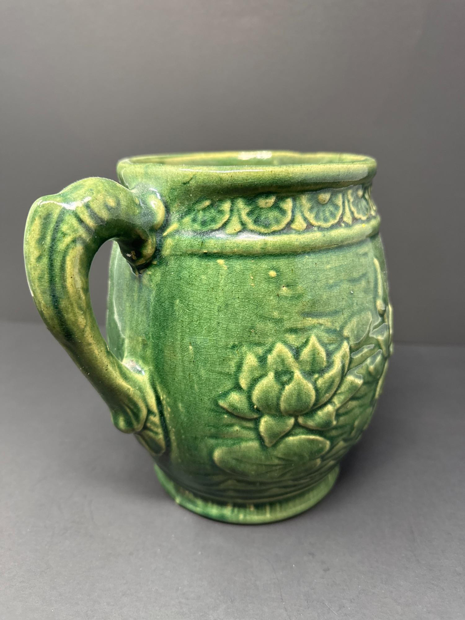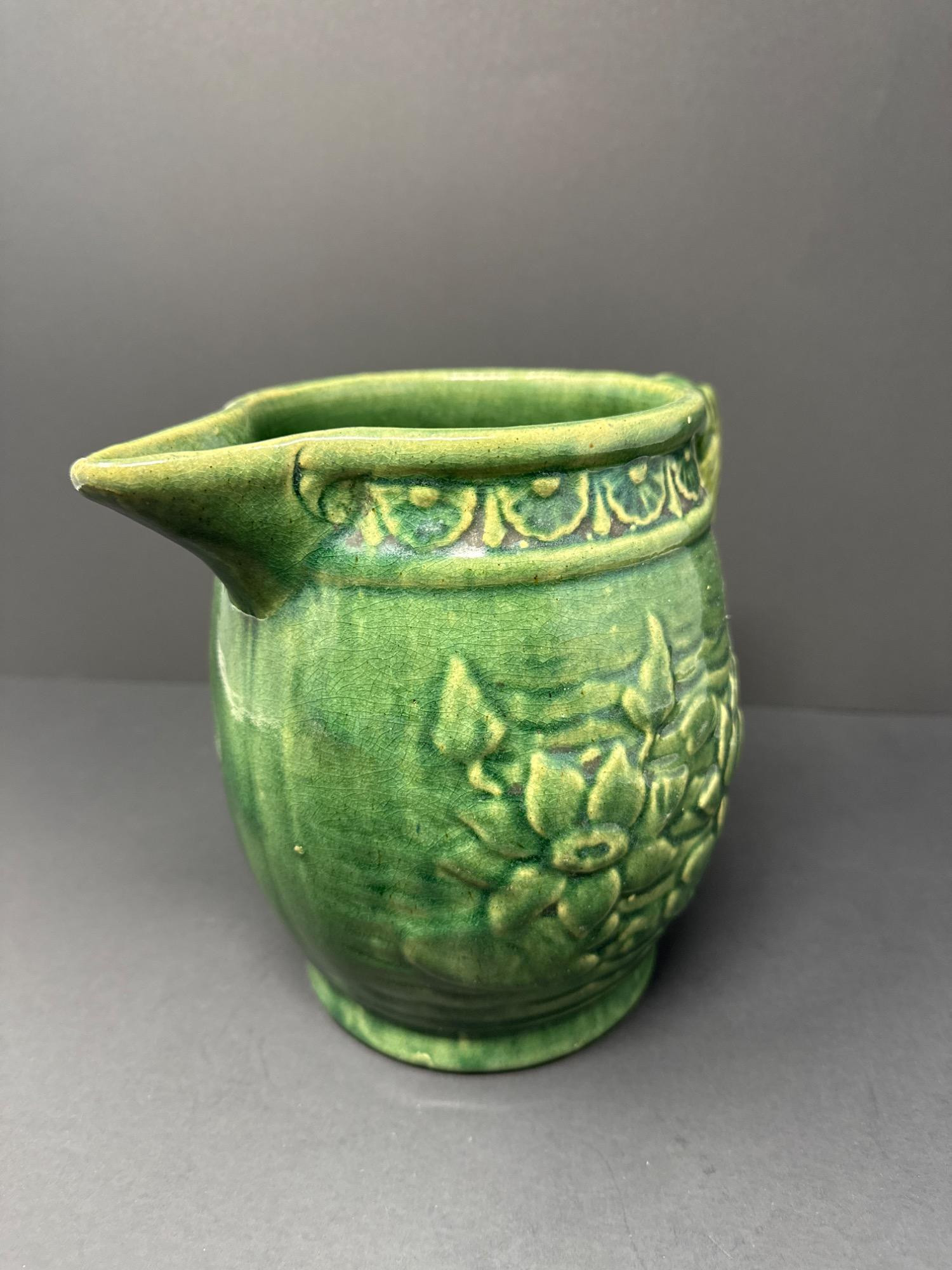 Vintage McCoy stoneware pitcher, produced circa 1935, featuring a classic green glaze with a raised lily pad floral motif and a stylized fish handle. This pitcher is a larger variation of the well-known McCoy “Lily Pad” line. Details: Manufacturer: McCoy Pottery Year: c.1935 Color: Glossy green glaze with rich tonal variation Design: Raised lily pad floral pattern with decorative rim border Handle: Sculpted with fish-tail or leaf-like styling Base Marking: Stamped “30” on the underside Material: Stoneware Dimensions: 7.5"H x 9"W