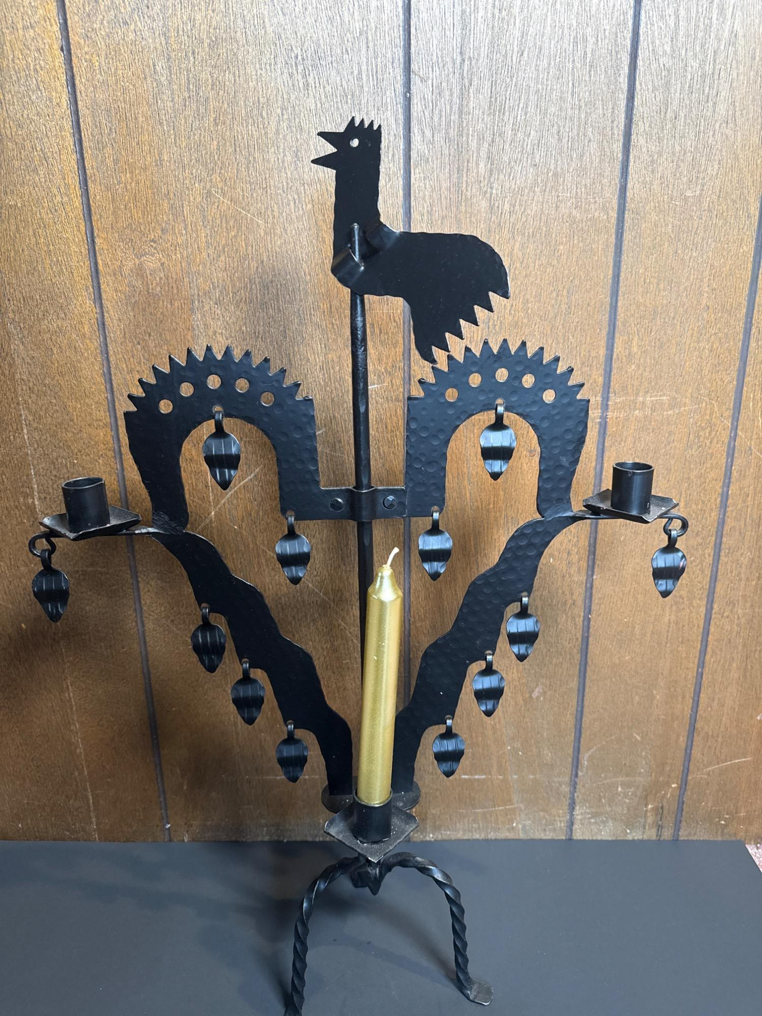 This striking candlestick stands an impressive 36 inches tall, designed to make a statement in any room, entryway, or outdoor setting. Crafted from hand-forged iron, the piece features a detailed rooster figure perched proudly atop a sturdy post, symbolizing vigilance and rural charm. Material: Solid wrought iron or forged steel, often finished with a distressed or blackened patina to enhance its vintage appeal. Design: The base is wide and stable, sometimes embellished with scrollwork or rustic textures. The rooster is sculpted with realistic feather detailing, comb and beak raised as if mid-crow. Function: The candlestick holder (or holders, if multi-arm) may be mounted at the top near the rooster or along the shaft, accommodating taper or pillar candles. Style: Perfect for farmhouse, country, or French provincial decor. It adds vertical interest and a touch of whimsy with an old-world feel.Forged Rooster Post Candlestick – 3 Feet Tall