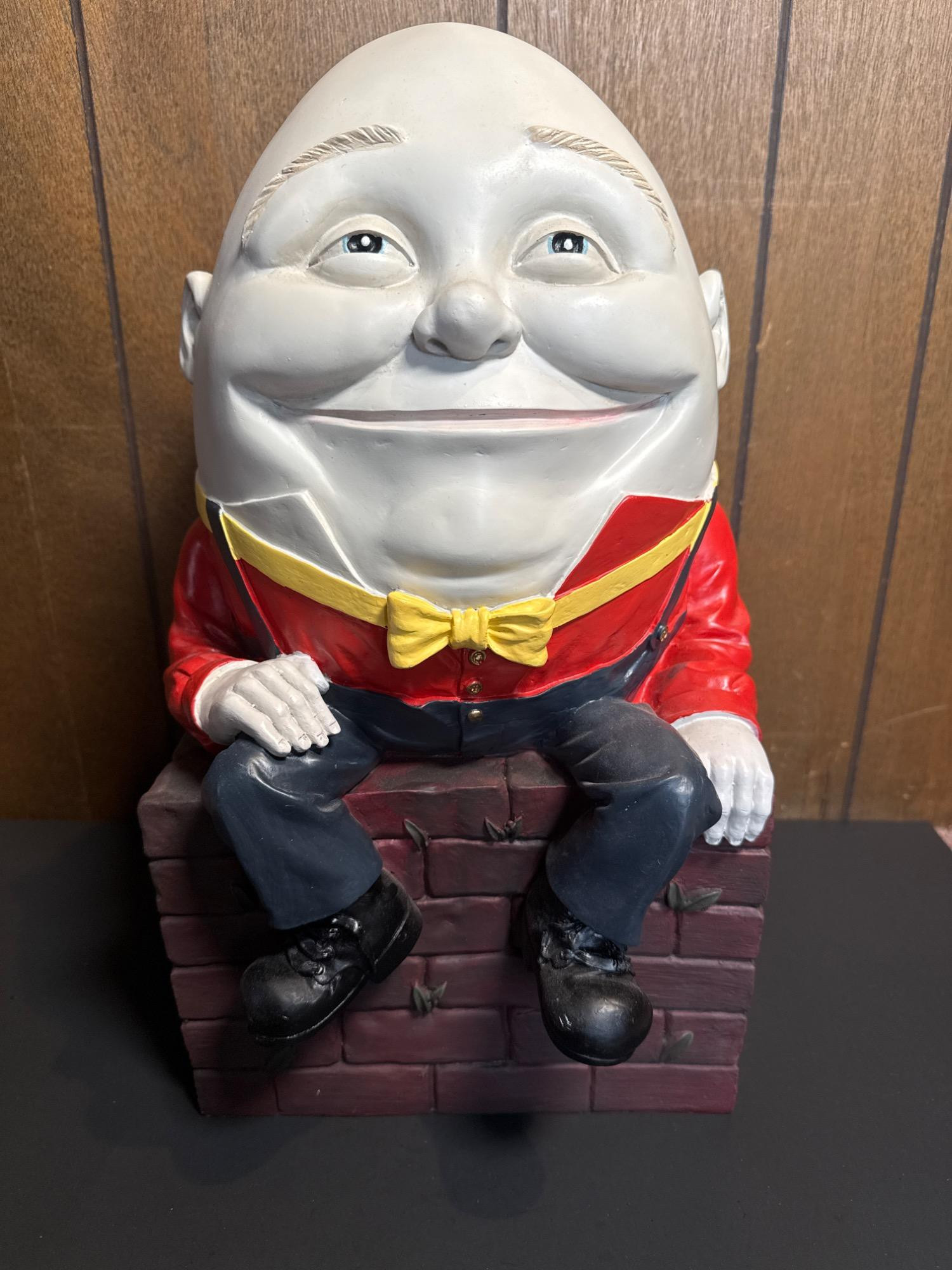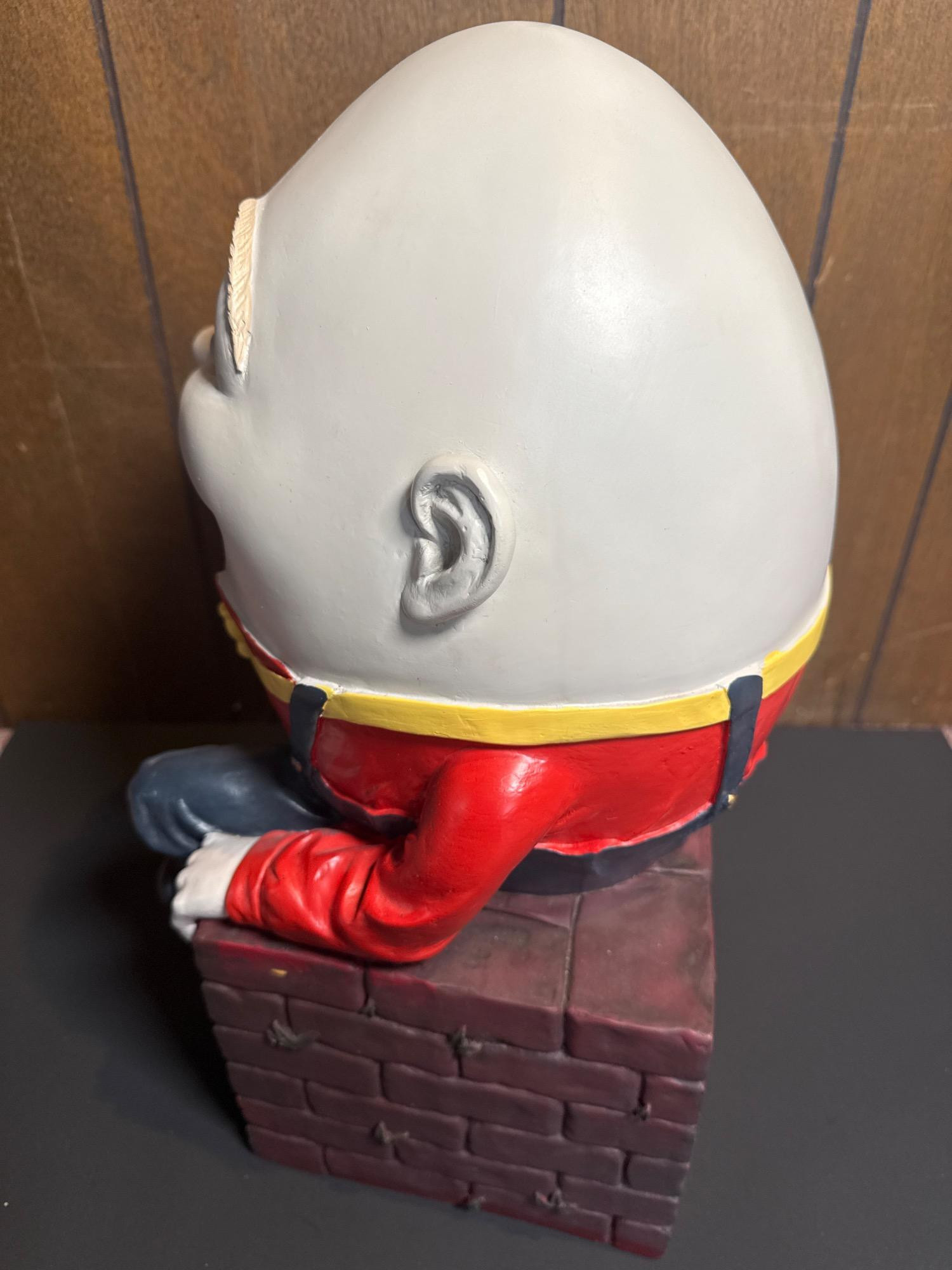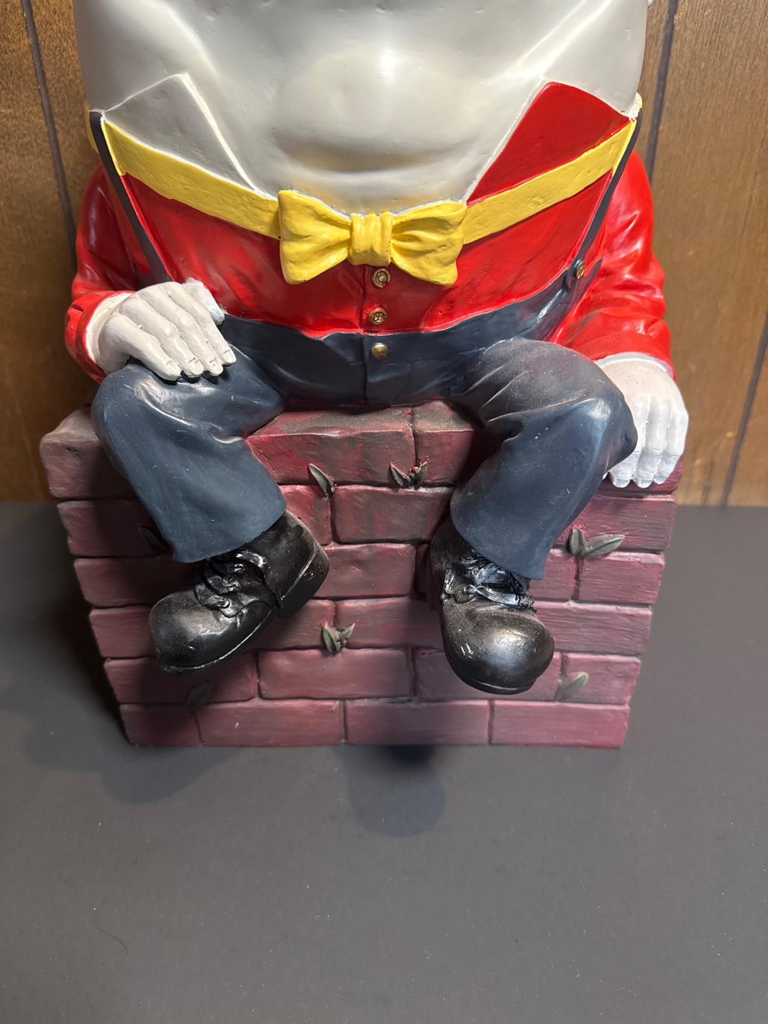 Bring classic nursery rhyme charm to your home or garden with this delightful Toscano Humpty Dumpty wall-sitter figure. This whimsical character is dressed in a vibrant red jacket, yellow bow tie, and blue pants, seated atop a faux brick wall. Crafted from durable resin and beautifully hand-painted, this piece showcases Toscano's signature attention to detail and playful design. It’s stamped with original markings, including: Toscano brand label (designed in the USA, made in China) Quality Control sticker dated July 30, 2020 Serial number: 35988 Dimensions: 19” T x 10” W
