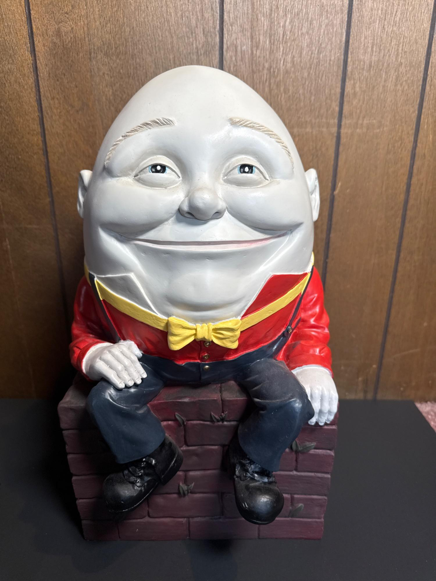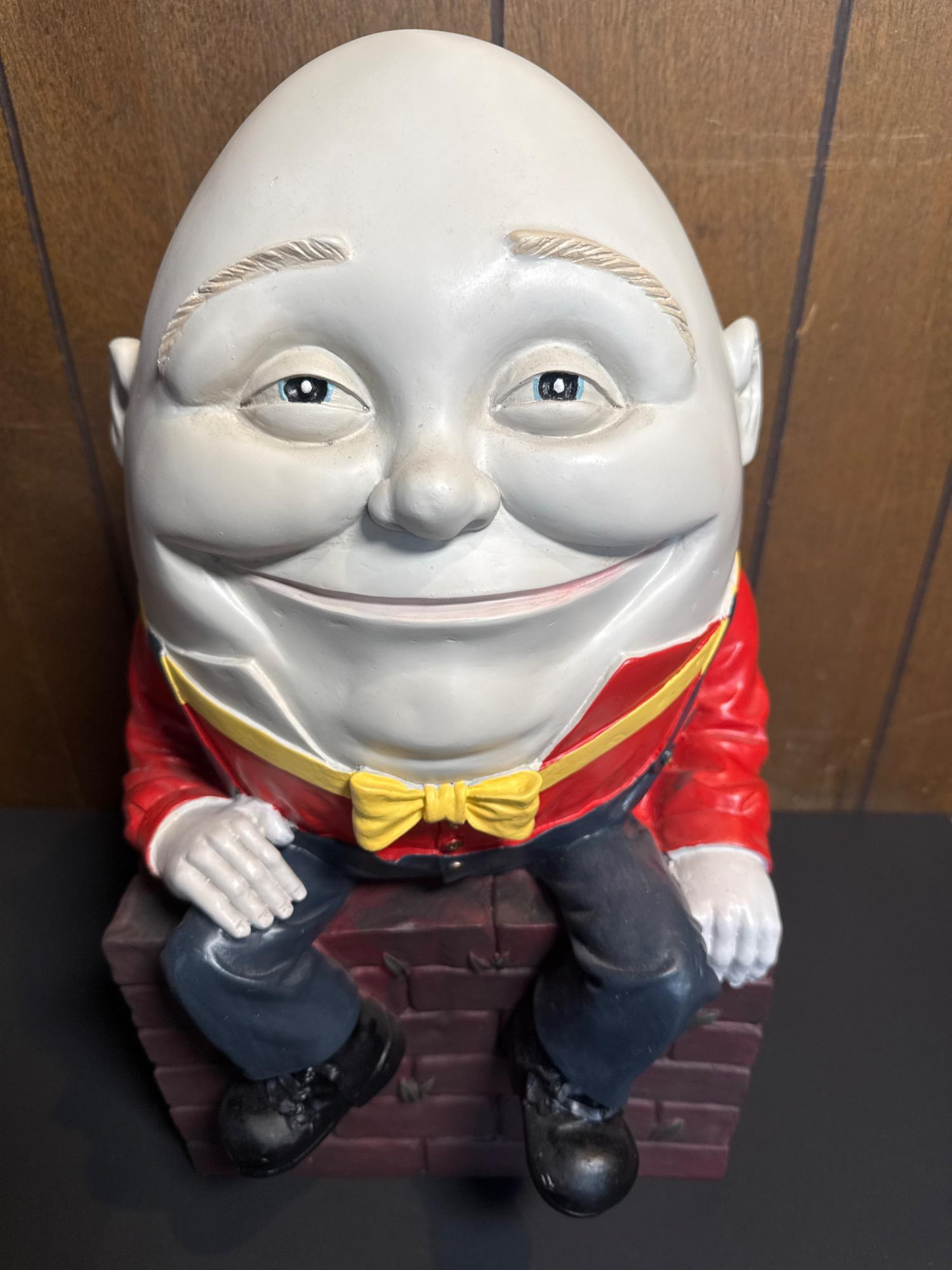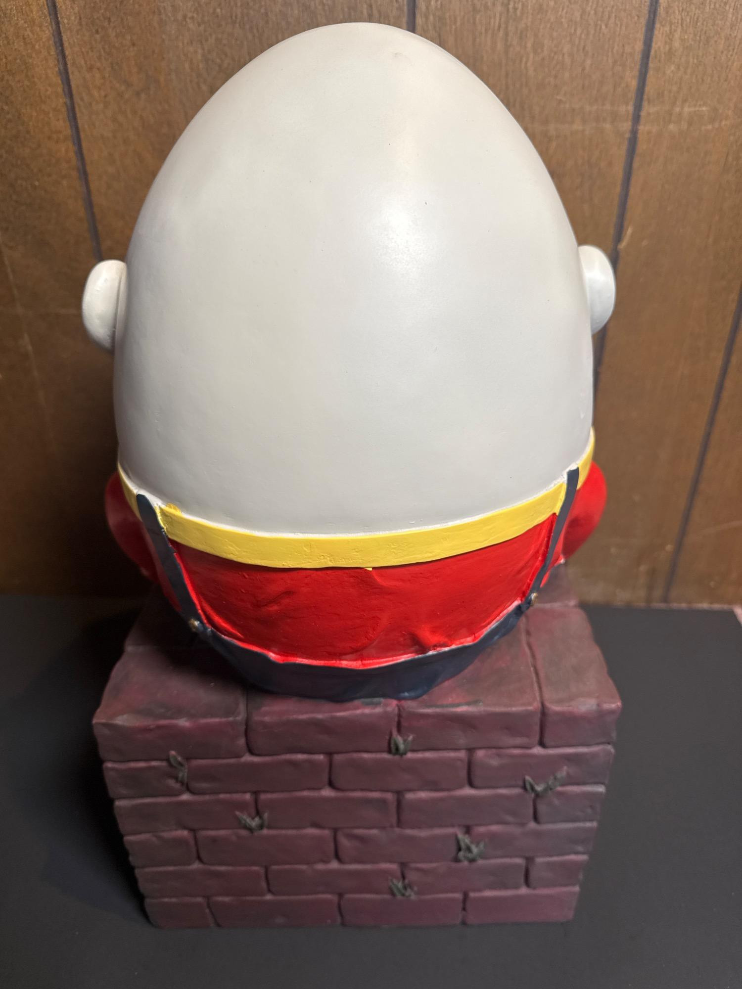 Bring classic nursery rhyme charm to your home or garden with this delightful Toscano Humpty Dumpty wall-sitter figure. This whimsical character is dressed in a vibrant red jacket, yellow bow tie, and blue pants, seated atop a faux brick wall. Crafted from durable resin and beautifully hand-painted, this piece showcases Toscano's signature attention to detail and playful design. It’s stamped with original markings, including: Toscano brand label (designed in the USA, made in China) Quality Control sticker dated July 30, 2020 Serial number: 35988 Dimensions: 19” T x 10” W