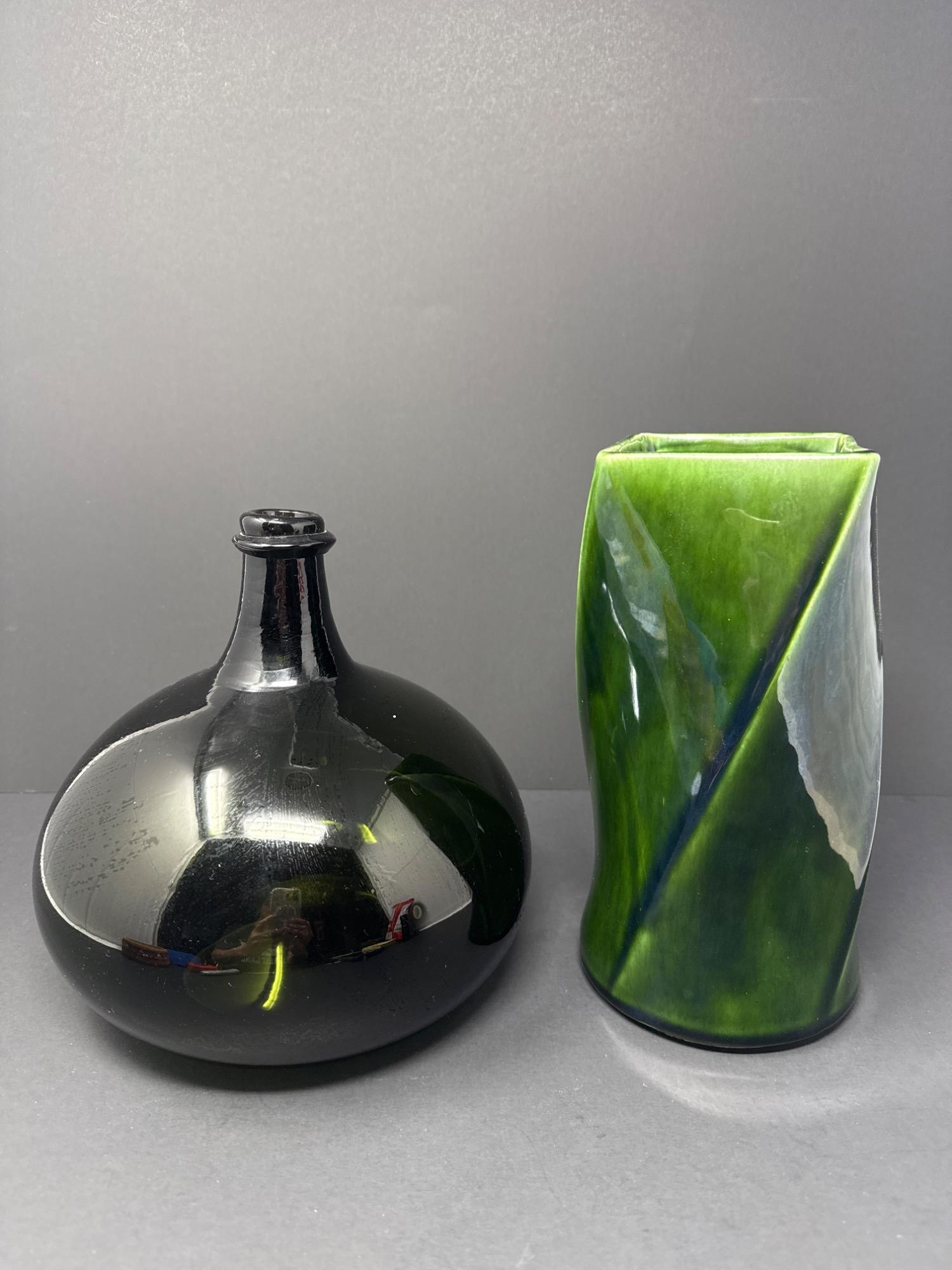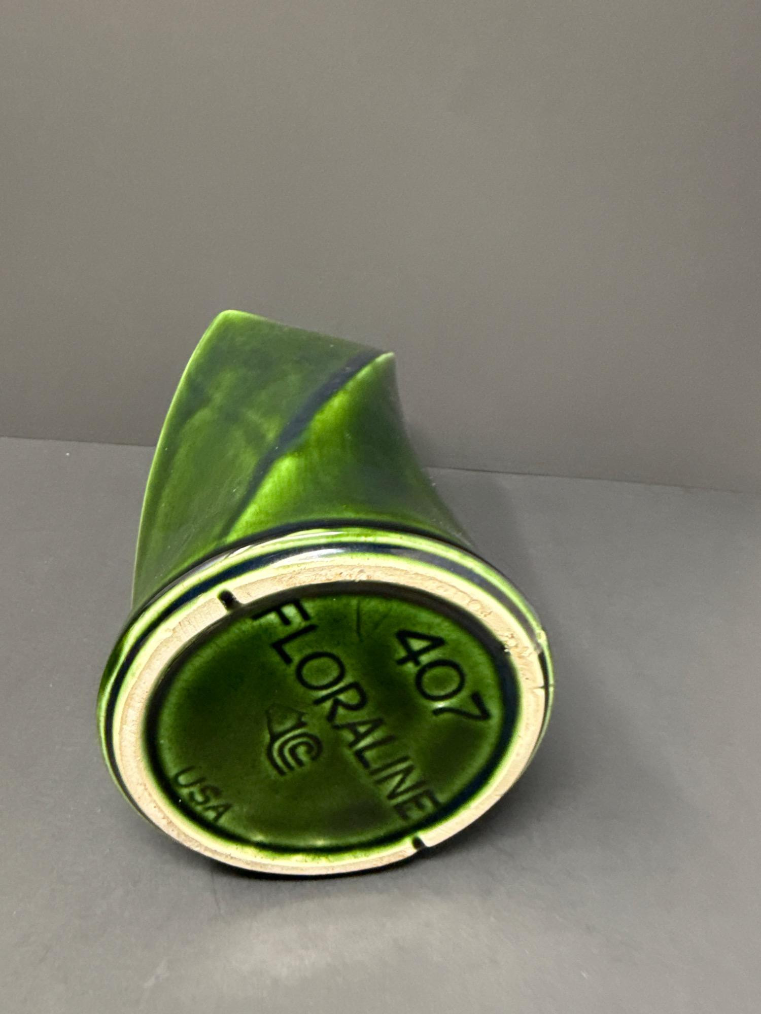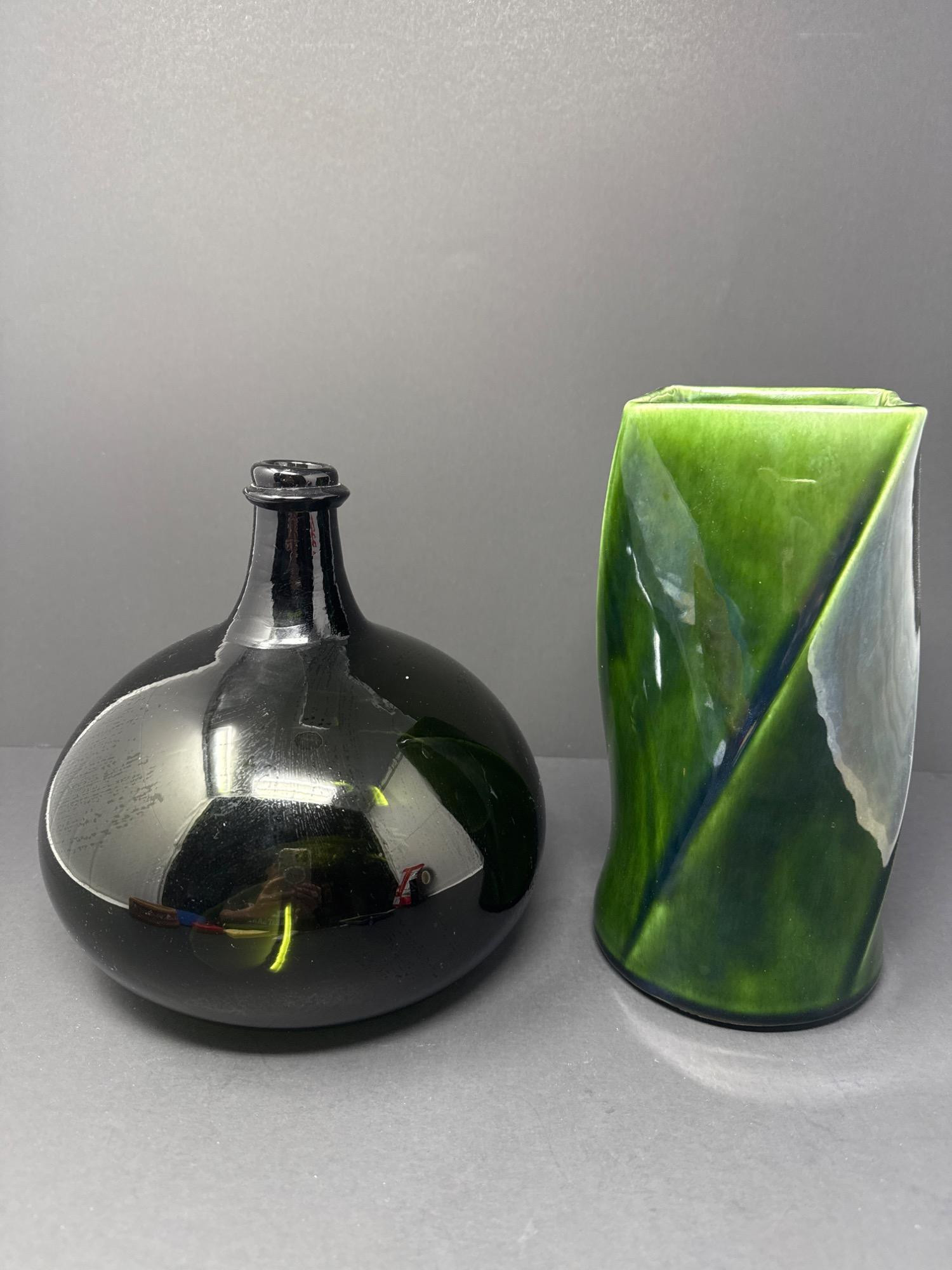This beautiful pair of art glass vases includes: Floraline Vase Model: 407 Dimensions: 9” tall x 4” wide Rich green glaze with a dynamic twisted design Square mouth, smooth curves, and an elegant blend of green tones Marked on the base: “407 FLORALINE USA” with the original McCoy-style USA pottery logo French Blown Art Glass Vase Dimensions: 8.5” tall x 7” wide Beautiful hand-blown French art glass with a deep, glossy black finish Elegant bulbous body with a narrow neck and flared rim Polished pontil mark on base indicates hand-blown craftsmanship