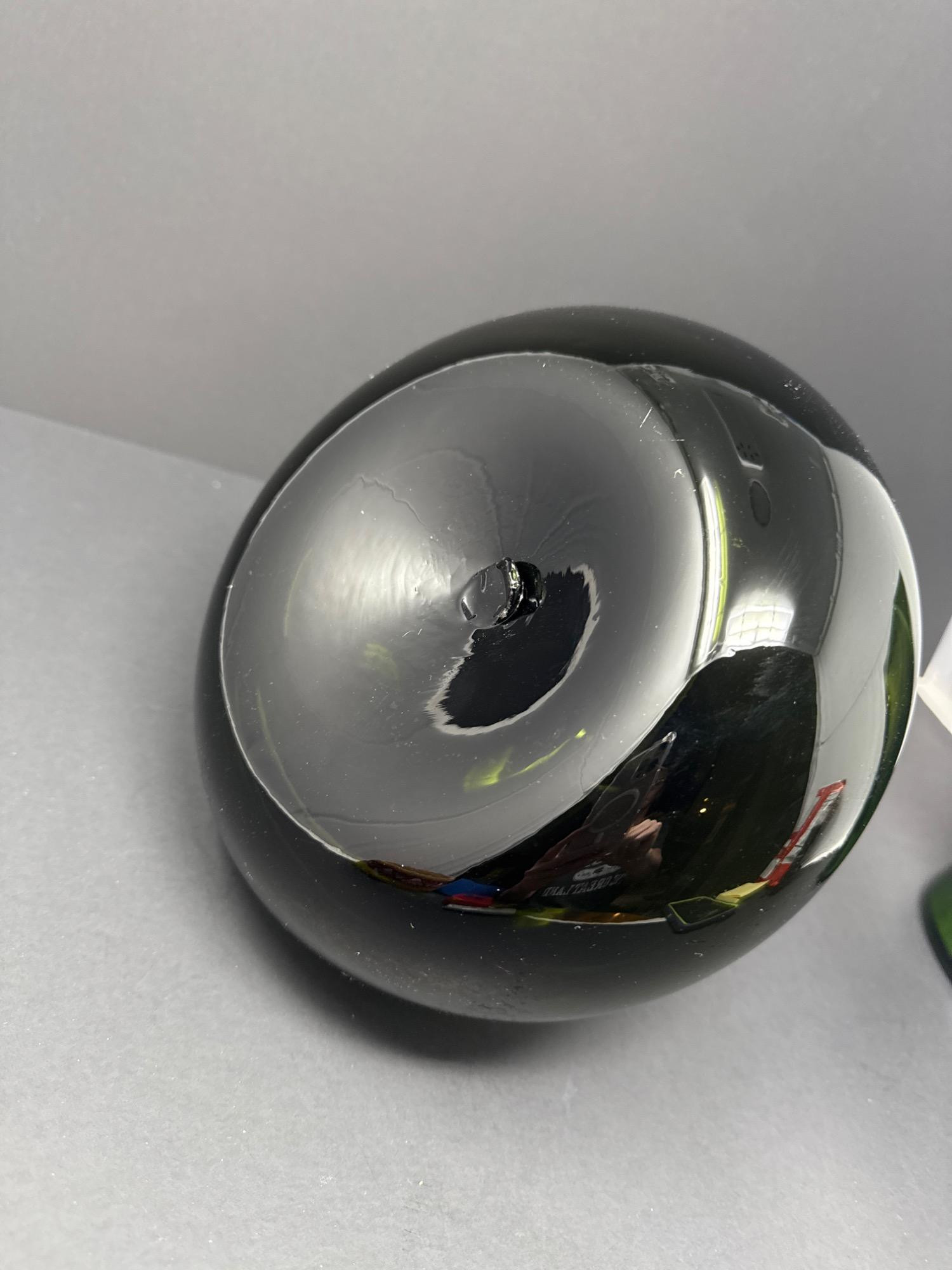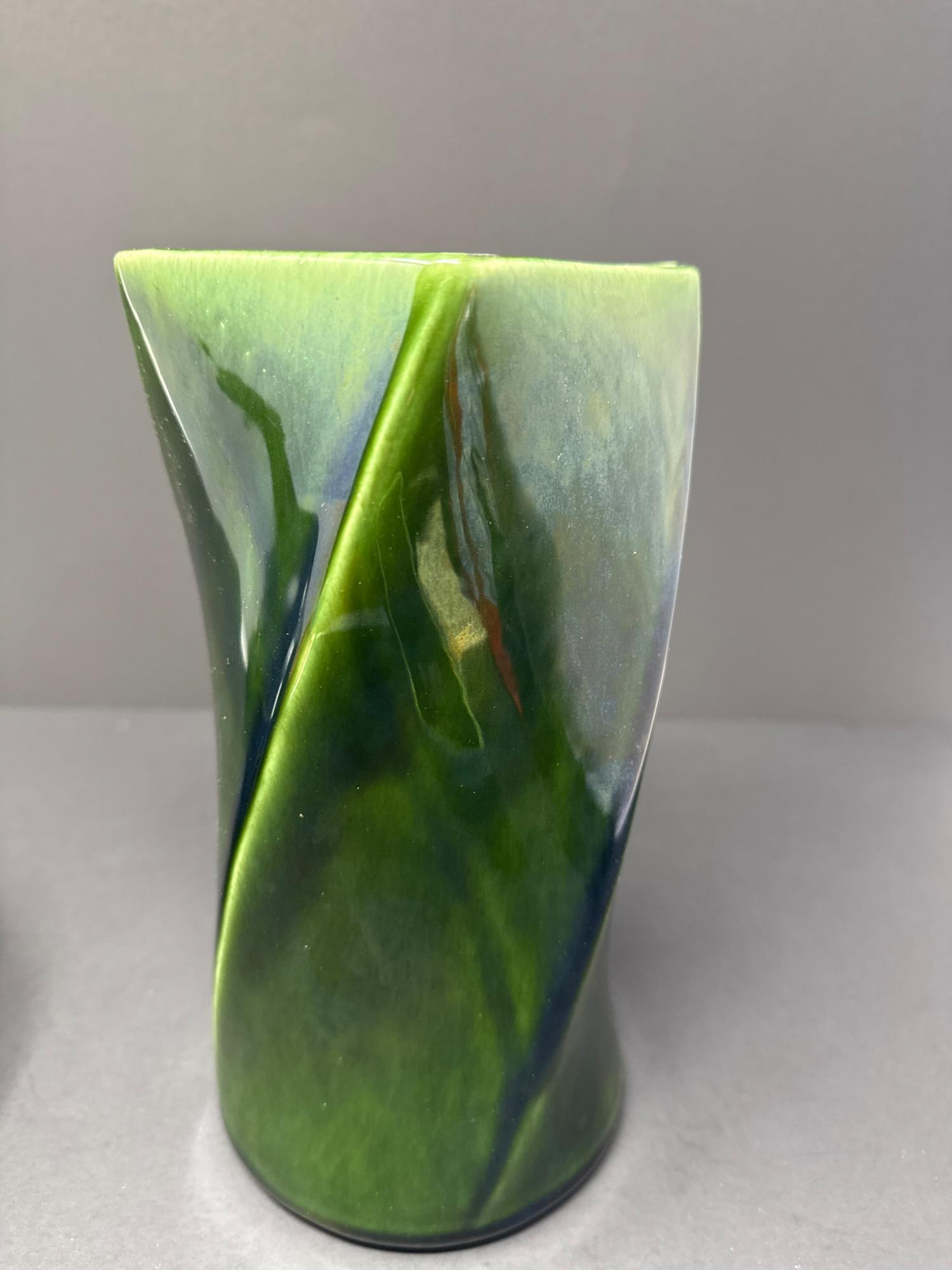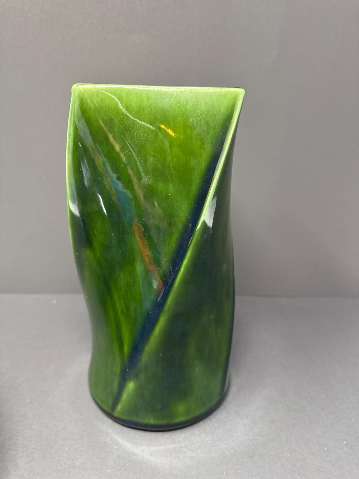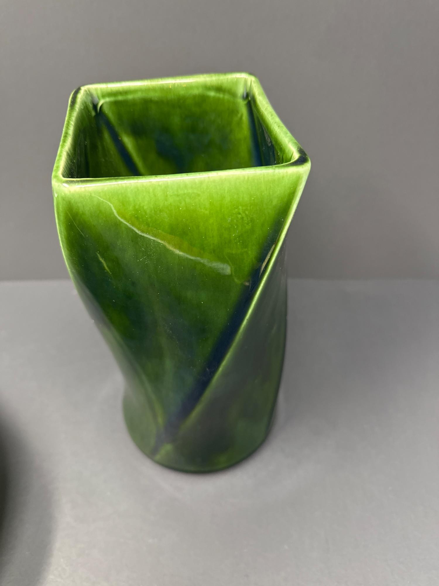 This beautiful pair of art glass vases includes: Floraline Vase Model: 407 Dimensions: 9” tall x 4” wide Rich green glaze with a dynamic twisted design Square mouth, smooth curves, and an elegant blend of green tones Marked on the base: “407 FLORALINE USA” with the original McCoy-style USA pottery logo French Blown Art Glass Vase Dimensions: 8.5” tall x 7” wide Beautiful hand-blown French art glass with a deep, glossy black finish Elegant bulbous body with a narrow neck and flared rim Polished pontil mark on base indicates hand-blown craftsmanship