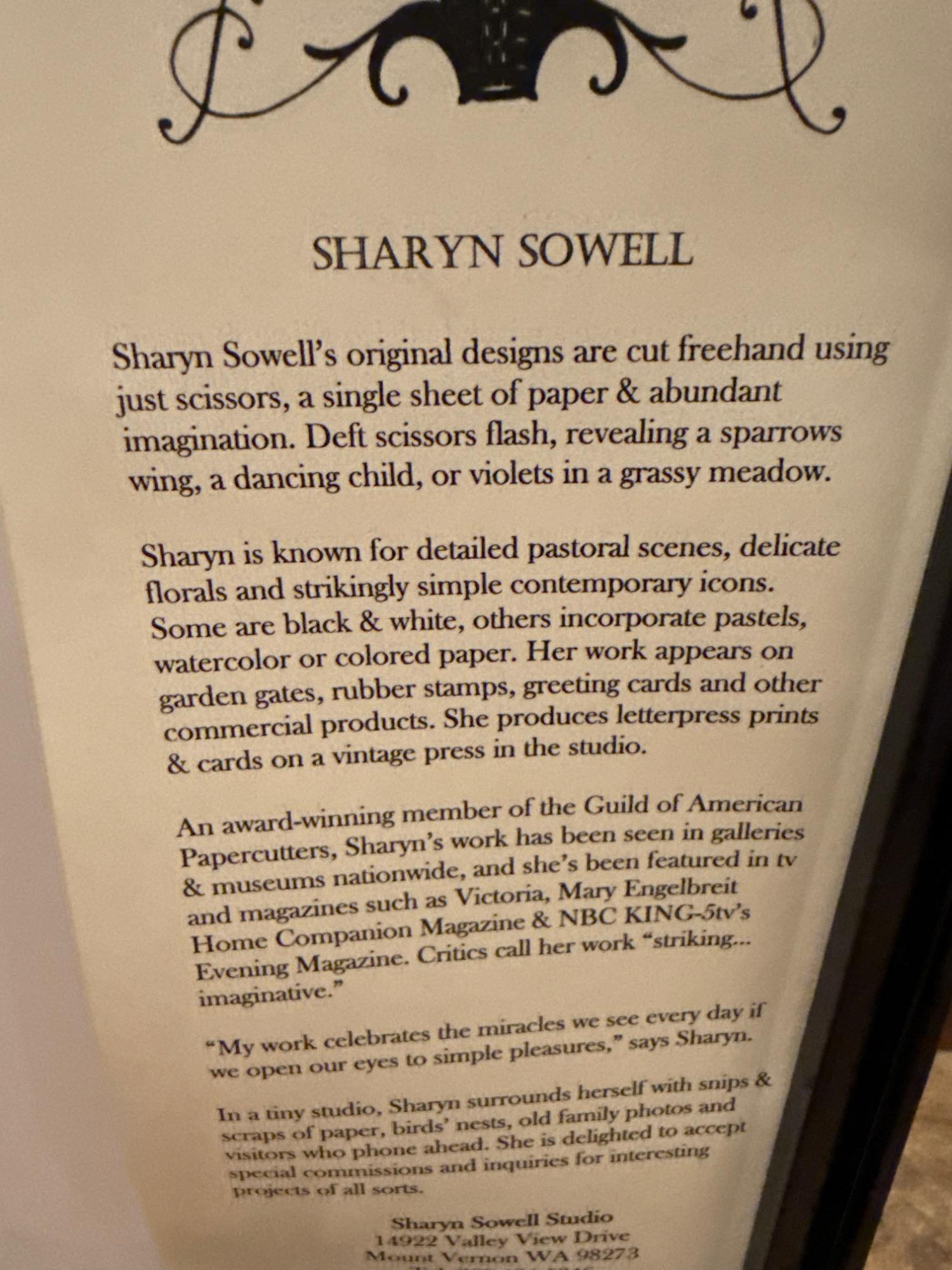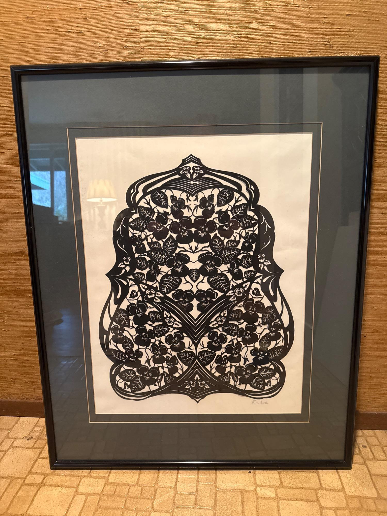 This stunning piece is an original scissor art creation by Sharyn Sowell, a celebrated member of the Guild of American Papercutters. The intricate design is hand-cut freehand from a single sheet of paper using only scissors—no templates or lasers—resulting in a delicate, symmetrical floral composition that radiates natural beauty and grace. Artist: Sharyn Sowell Title: Not specified (floral motif, symmetrical design) Medium: Hand-cut black paper on white backing Signature: Signed by the artist in pencil on the bottom right corner Framed Size: Approx. 24" x 30" (estimate from images) Frame: Black metal frame with double matting Artist Background: Sharyn Sowell’s designs are cut freehand using just scissors, a single sheet of paper, and her vivid imagination. Her artwork captures detailed pastoral scenes, delicate florals, and simple contemporary icons. Her work has been featured in galleries and publications such as Victoria and Mary Engelbreit’s Home Companion, and on NBC’s KING-5.
