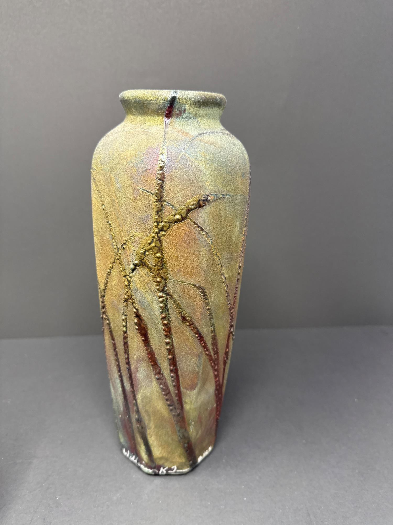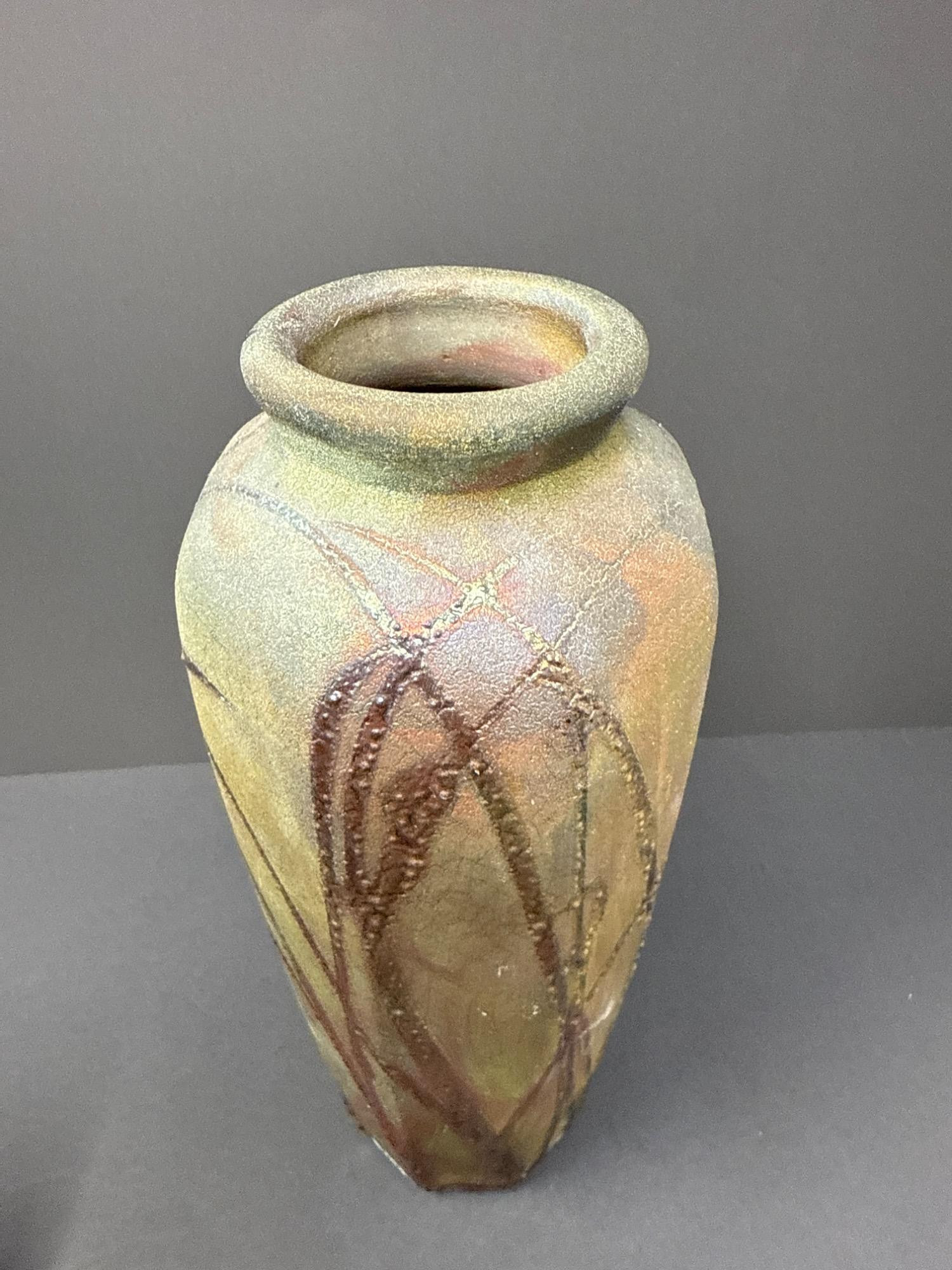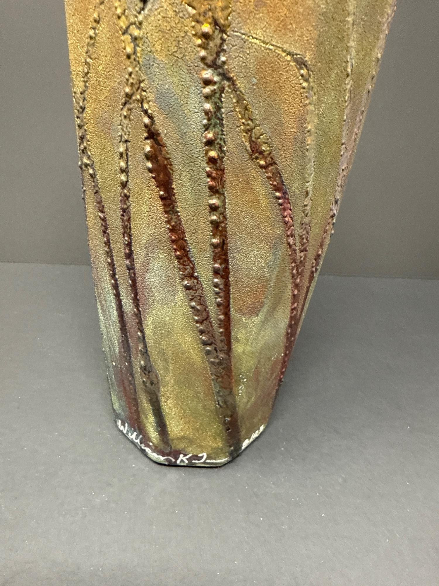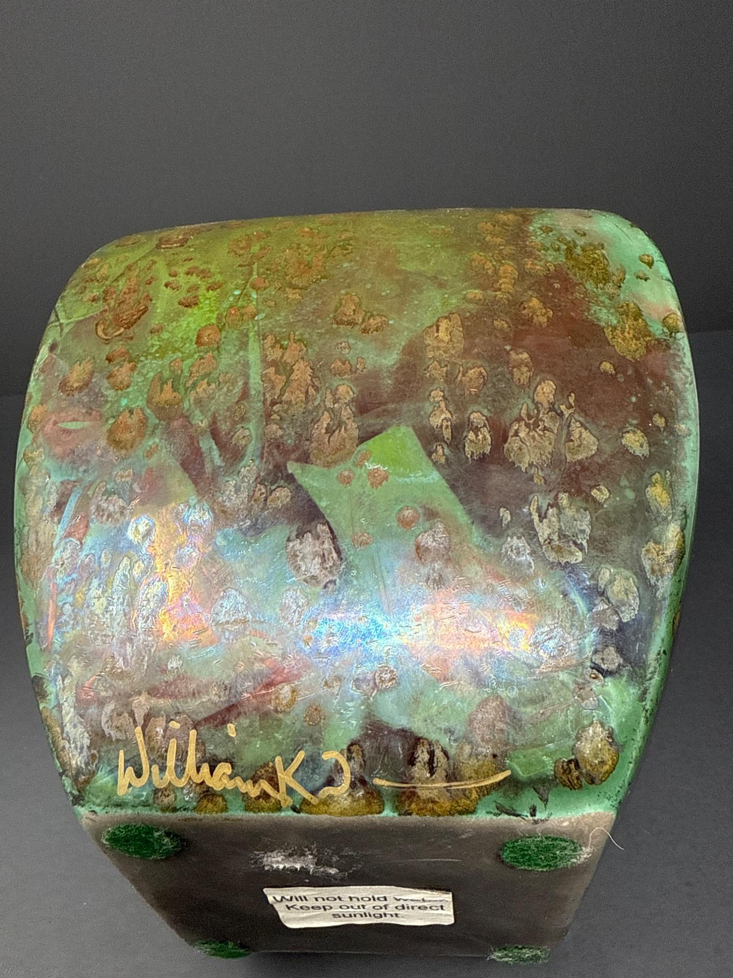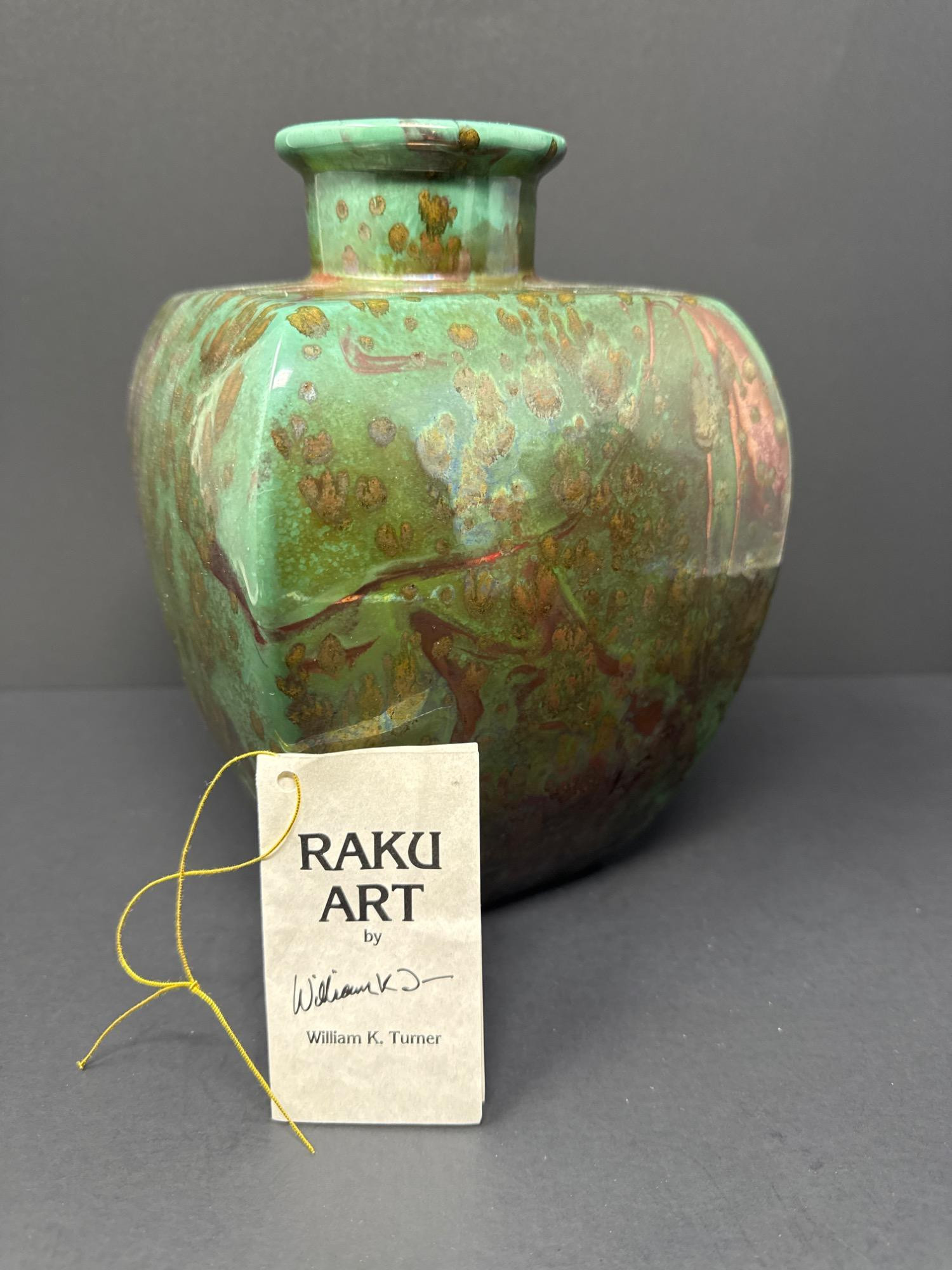 This stunning pair of handcrafted Raku vases by acclaimed ceramic artist William K. Turner beautifully showcases the unique characteristics of the Raku firing process—dramatic textures, rich earthy colors, and organic patterns. Each piece is signed and comes with its original "Raku Art by William K. Turner" tag. Details: Artist: William K. Turner Type: Studio pottery, decorative vases Technique: Raku-fired ceramic Signed: Yes – signature on the base of the green vase Includes Tag: Yes – original artist tag with signature Condition: Excellent. No chips or cracks. Surface variations are intentional and inherent to the Raku process. Vase Dimensions: Taller vase (brown with vine texture): 10.5” H x 3.5” W Shorter, wide vase (green with copper tones): 9.5” H x 5” W Note: For decorative use only – will not hold water. Label on base advises to keep out of direct sunlight.