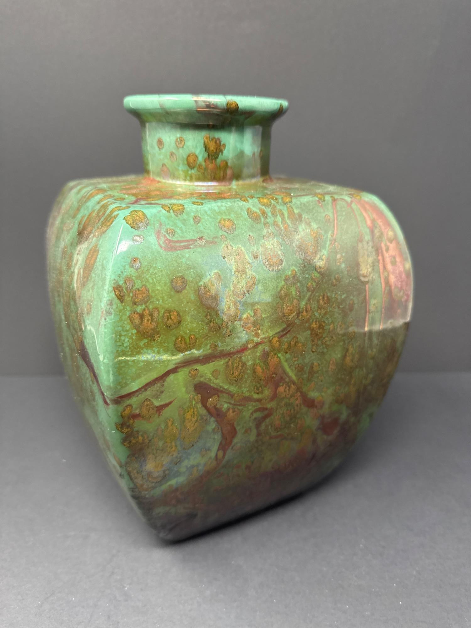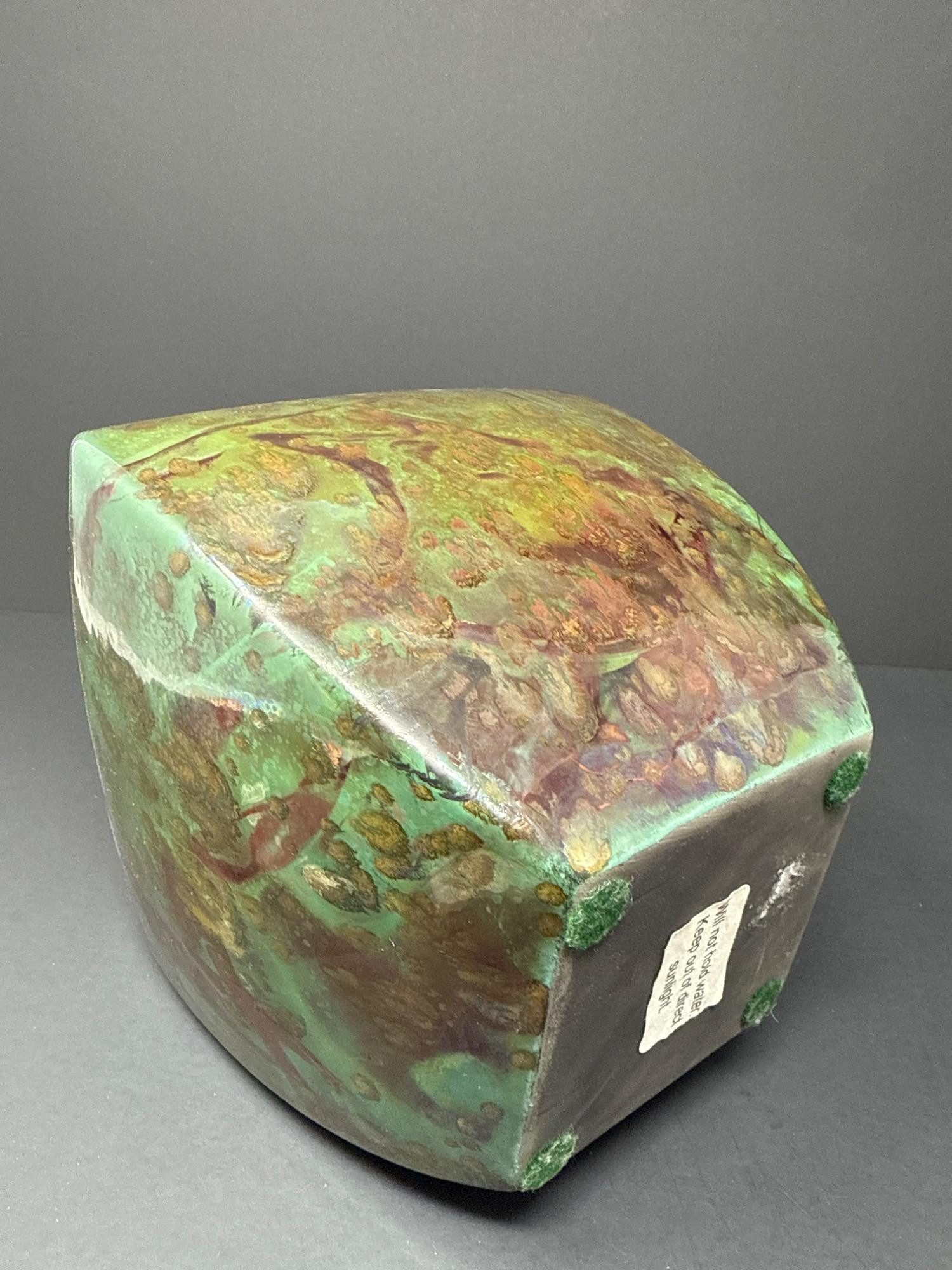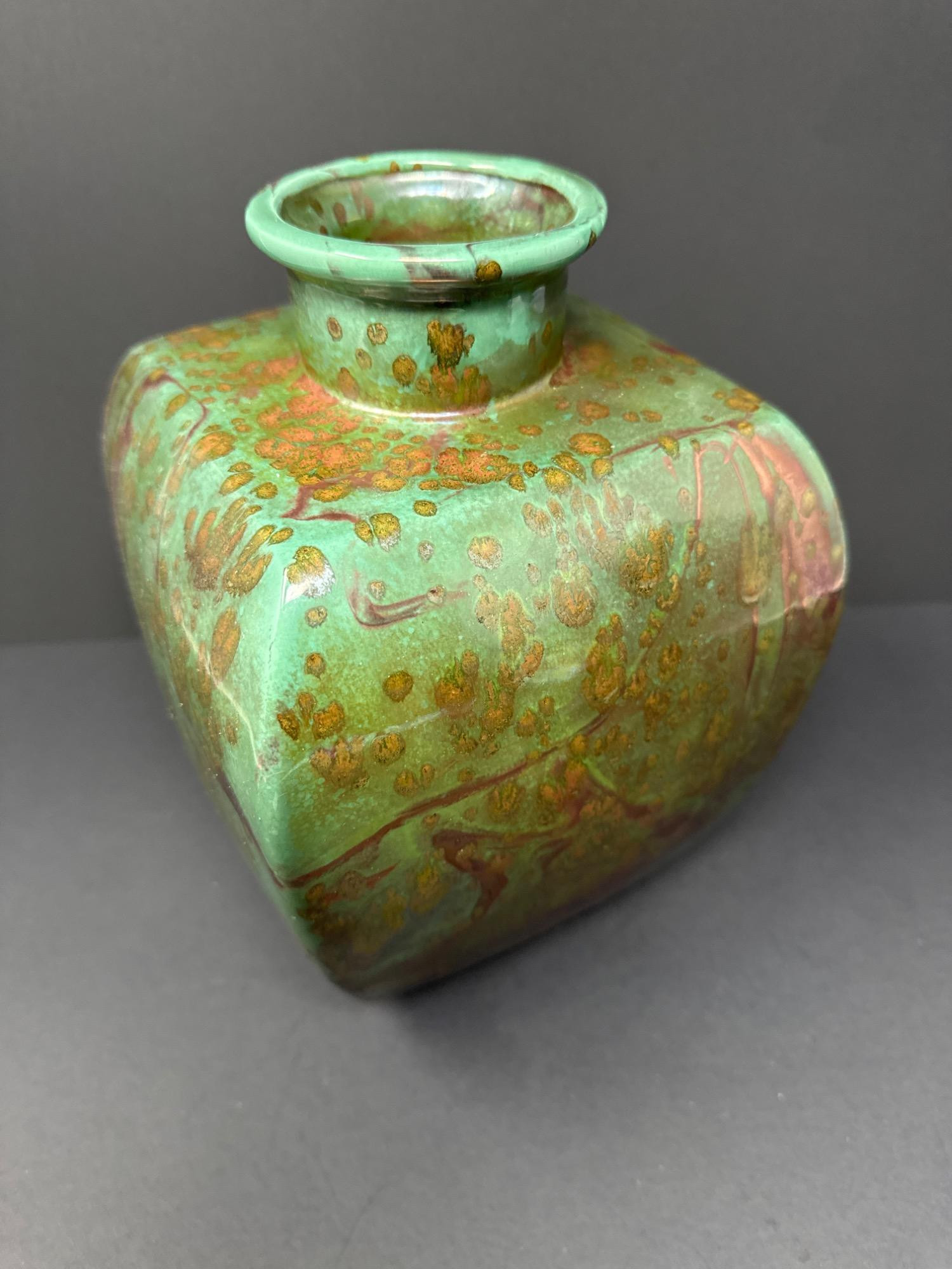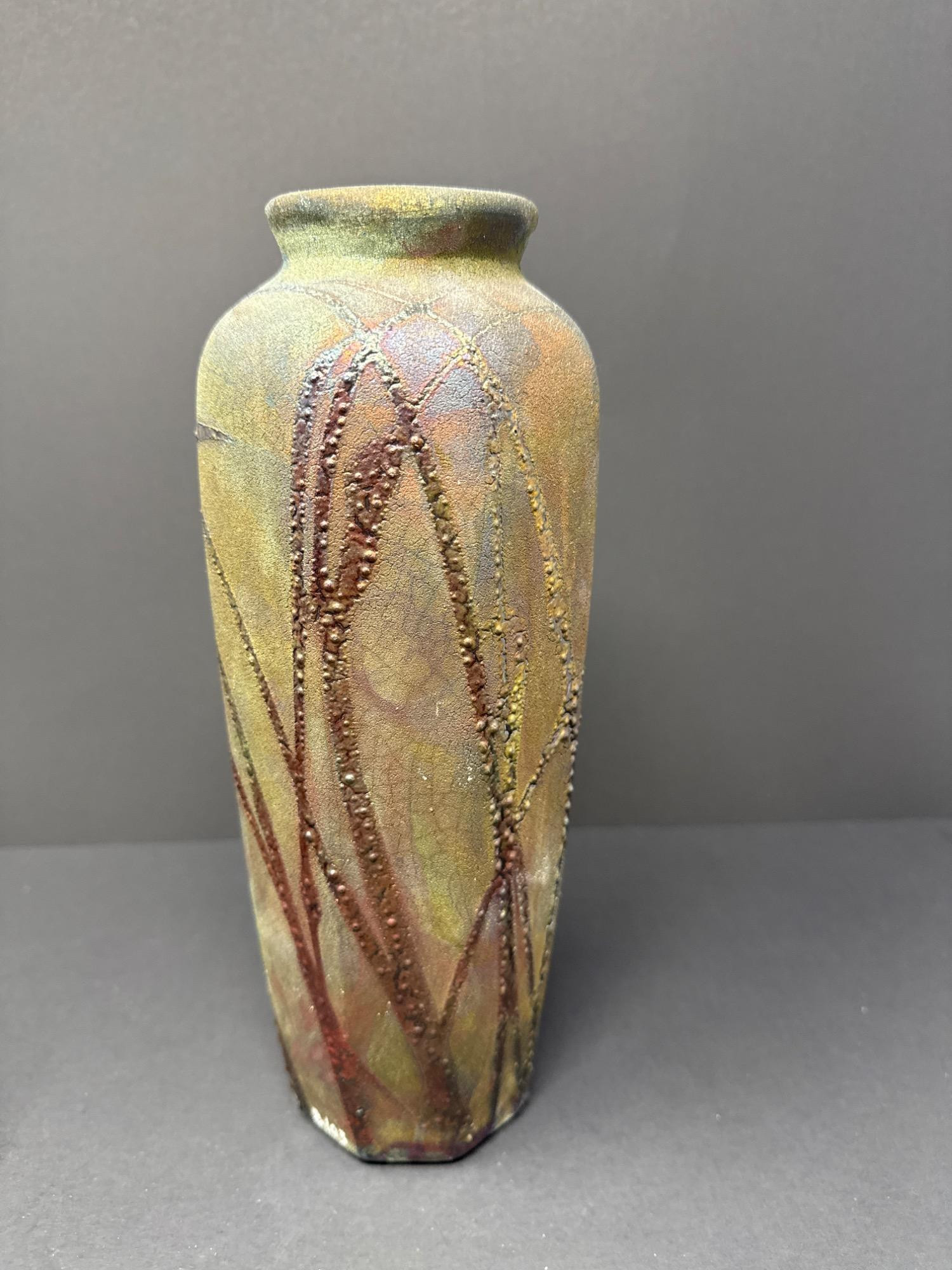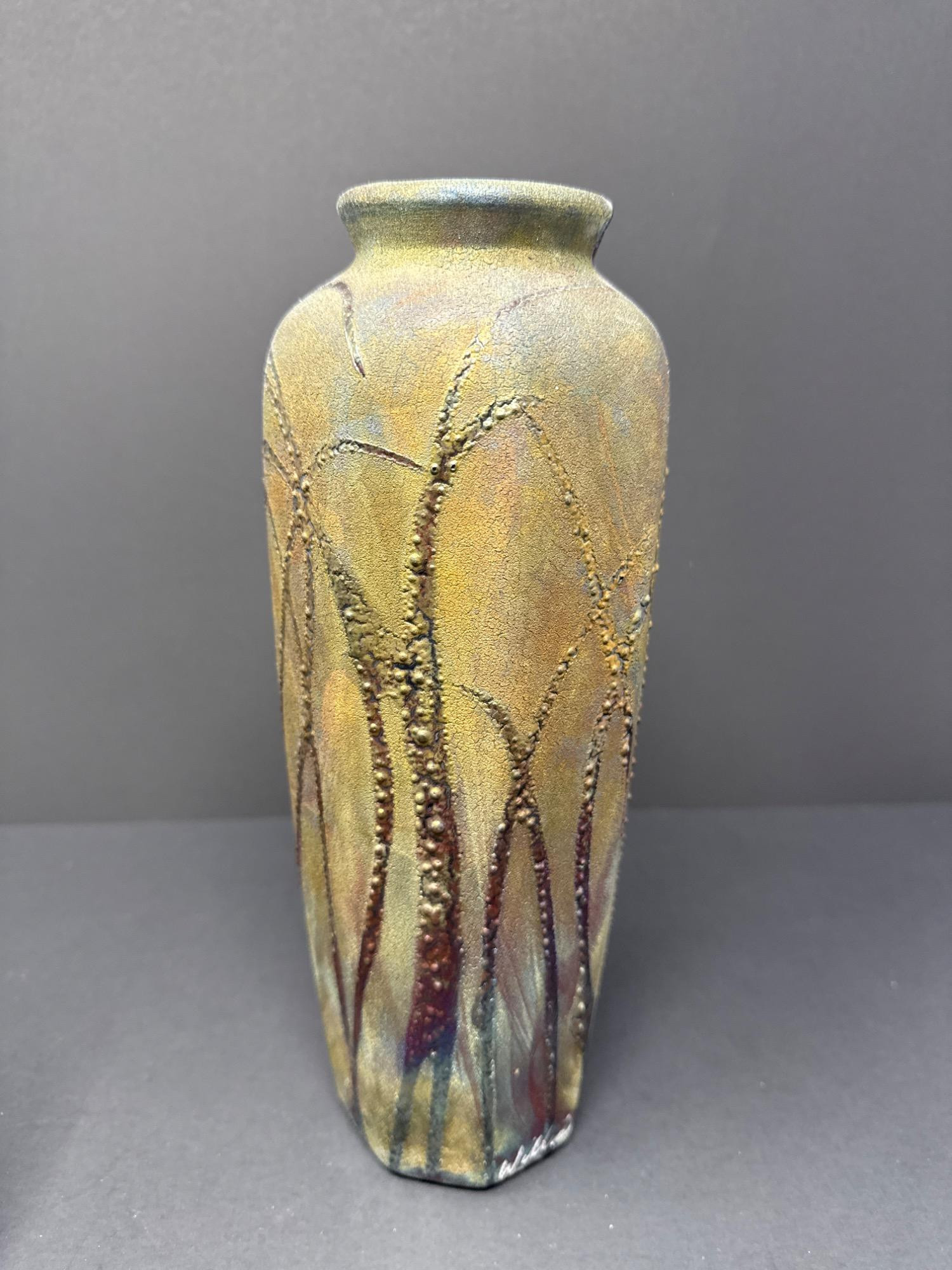This stunning pair of handcrafted Raku vases by acclaimed ceramic artist William K. Turner beautifully showcases the unique characteristics of the Raku firing process—dramatic textures, rich earthy colors, and organic patterns. Each piece is signed and comes with its original "Raku Art by William K. Turner" tag. Details: Artist: William K. Turner Type: Studio pottery, decorative vases Technique: Raku-fired ceramic Signed: Yes – signature on the base of the green vase Includes Tag: Yes – original artist tag with signature Condition: Excellent. No chips or cracks. Surface variations are intentional and inherent to the Raku process. Vase Dimensions: Taller vase (brown with vine texture): 10.5” H x 3.5” W Shorter, wide vase (green with copper tones): 9.5” H x 5” W Note: For decorative use only – will not hold water. Label on base advises to keep out of direct sunlight.