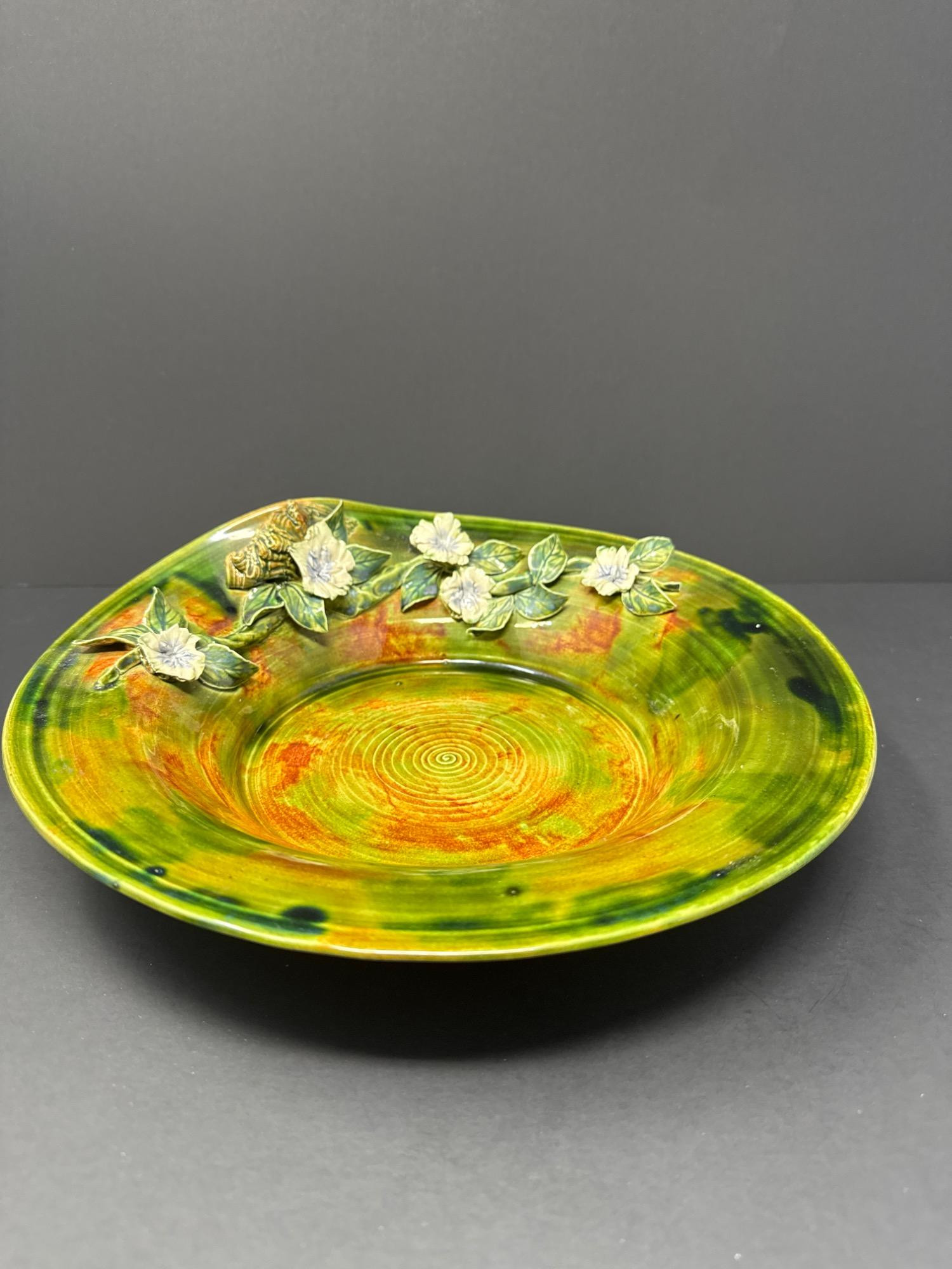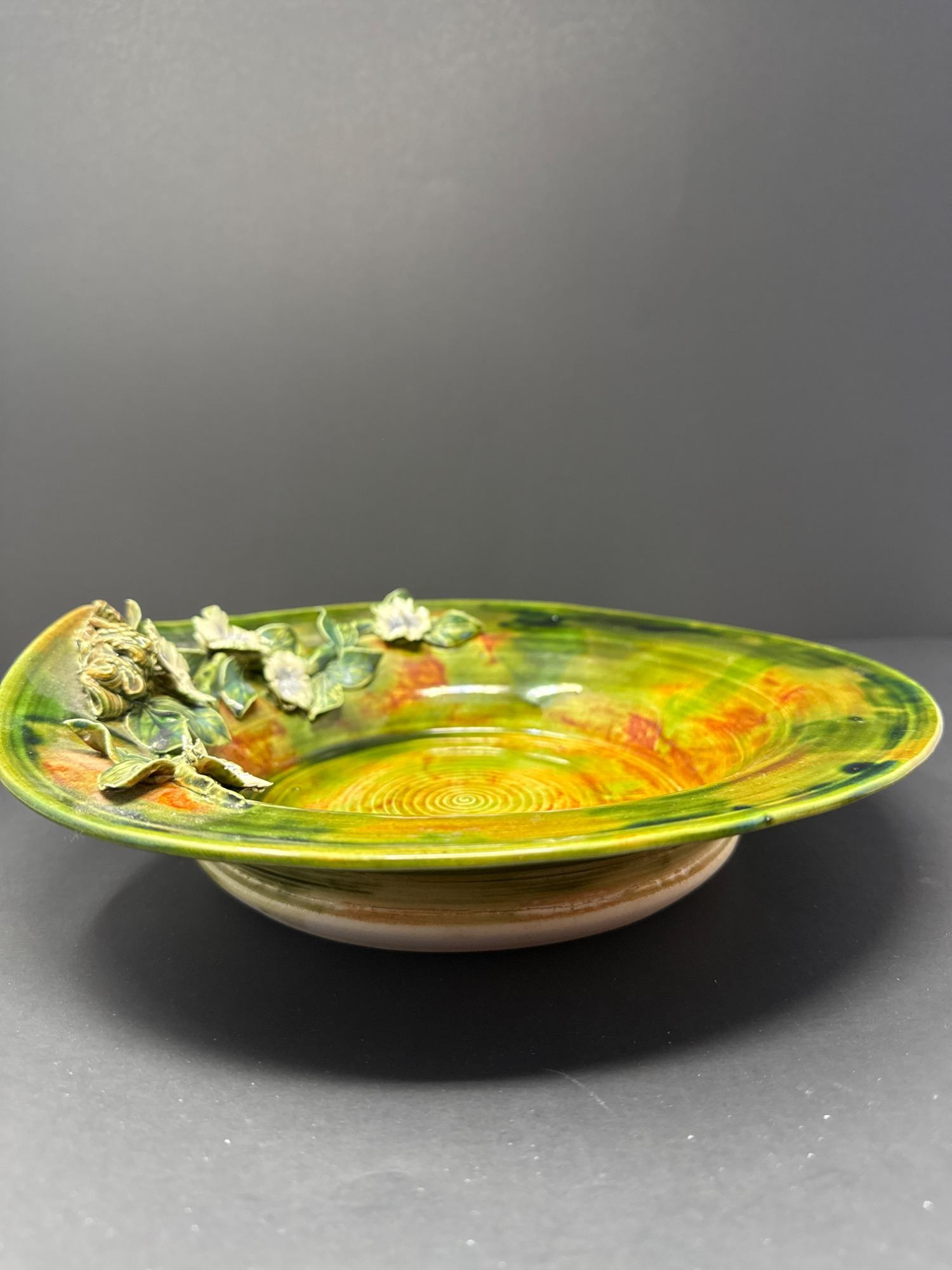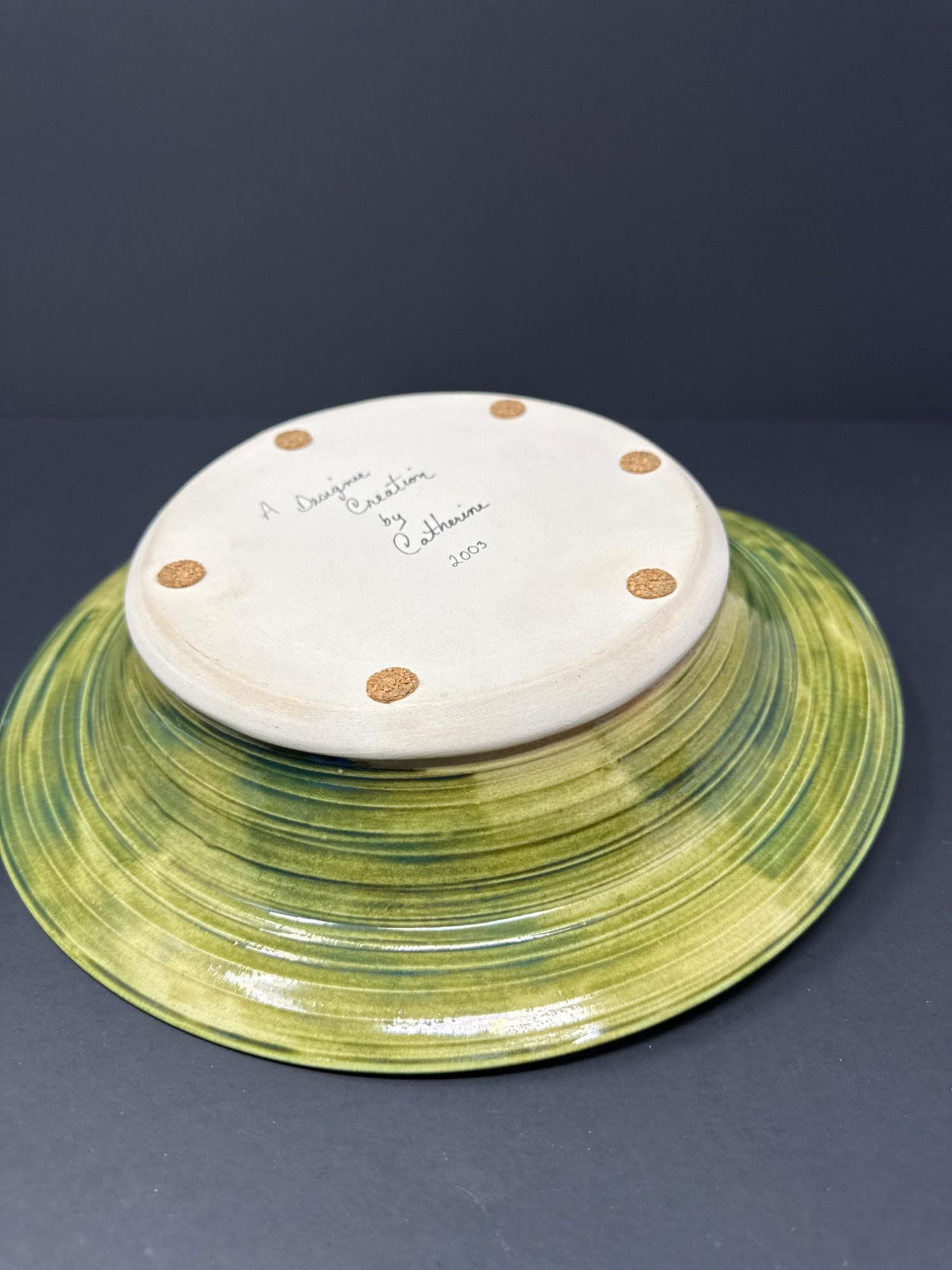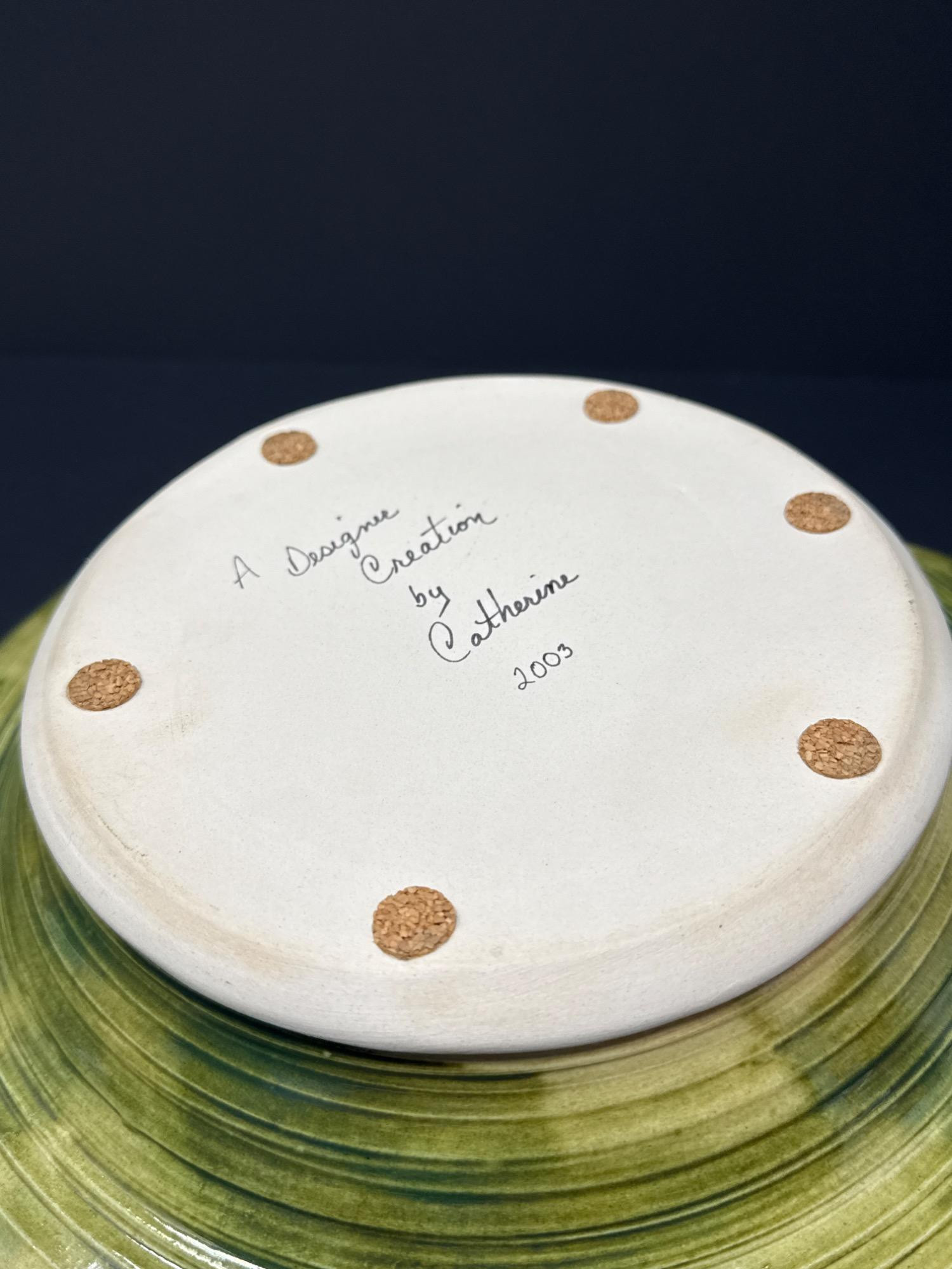 This eye-catching pottery bowl is a unique handmade piece created by artist Catherine in 2003. The bowl features: A vivid swirl of green, orange, and yellow glazes Detailed sculpted white flowers, leafy vines, and a butterfly embellishment along the rim A smooth, spiral-textured center A flat base with cork protectors to prevent surface scratching Dimensions: 10.5" W x 3" T Artist: Catherine Year: 2003 Title on Base: A Designer Creation by Catherine