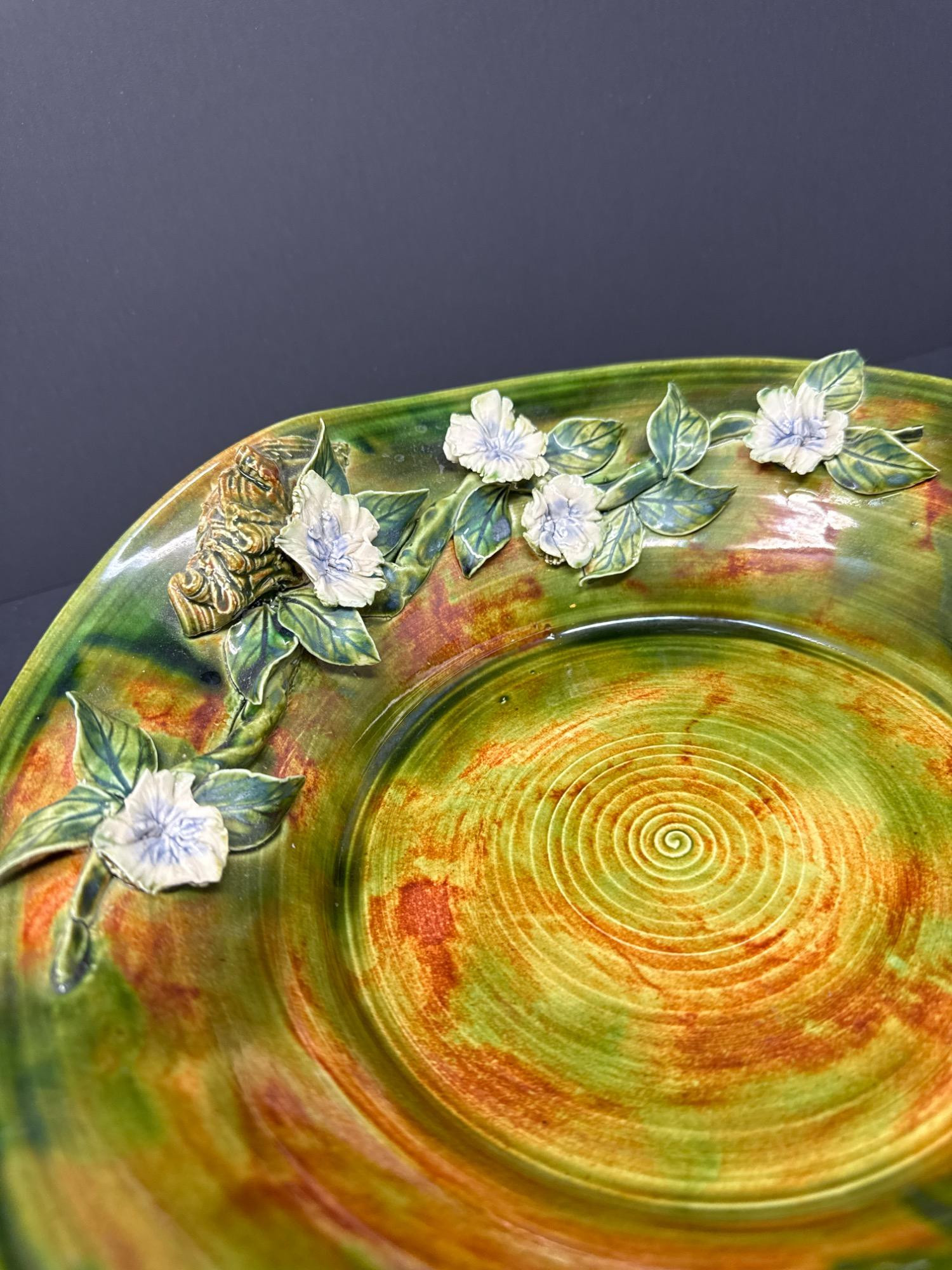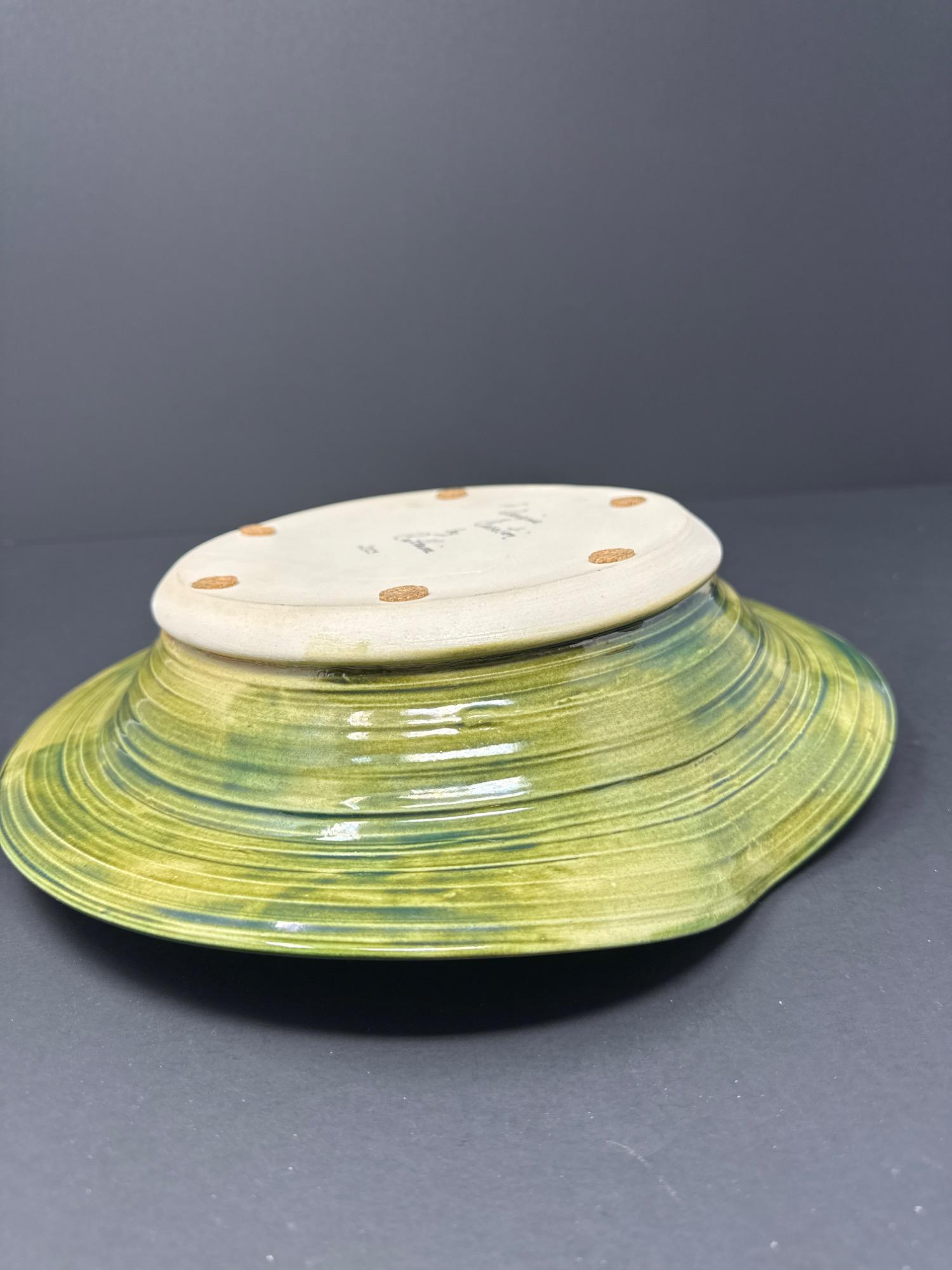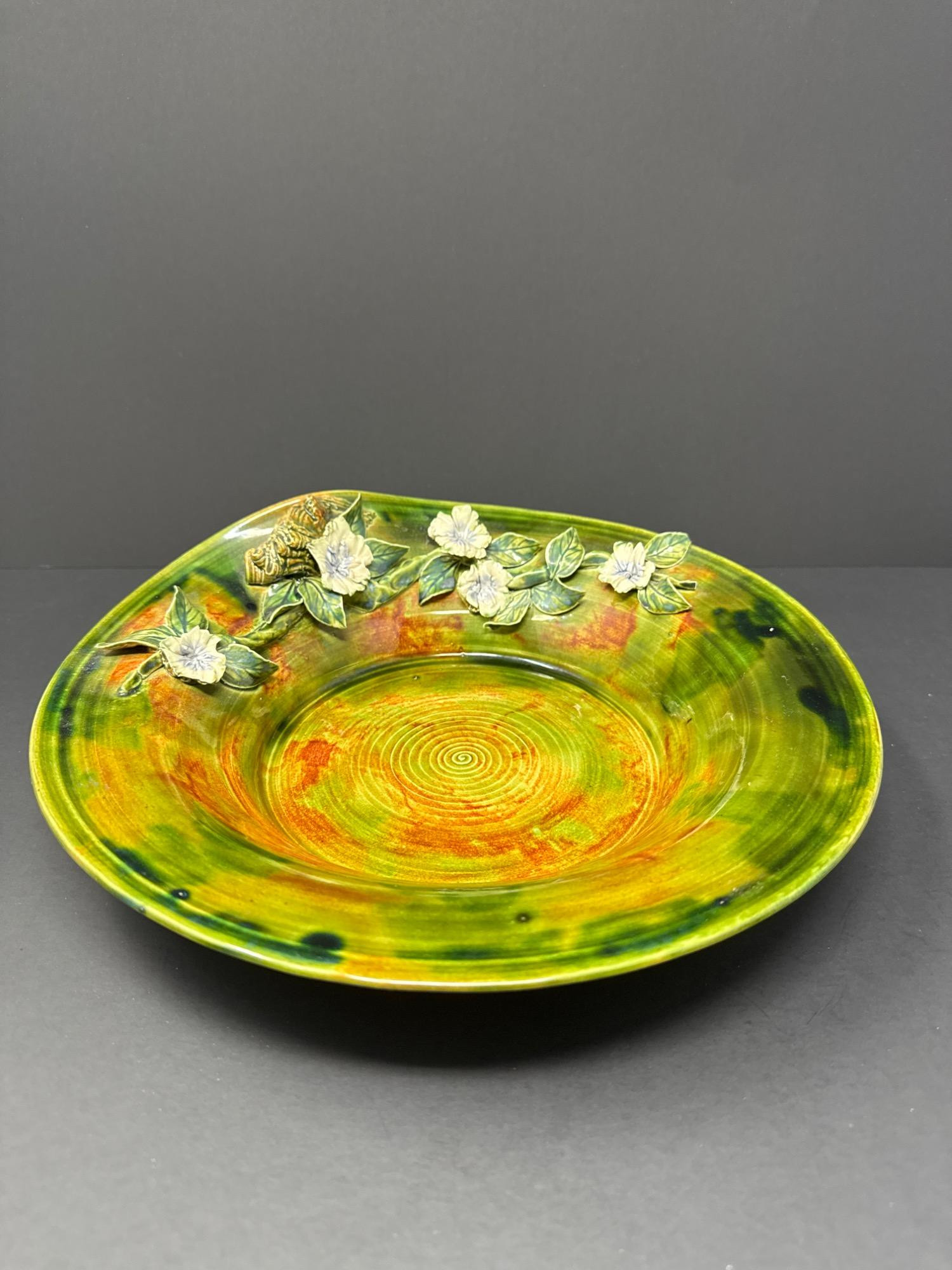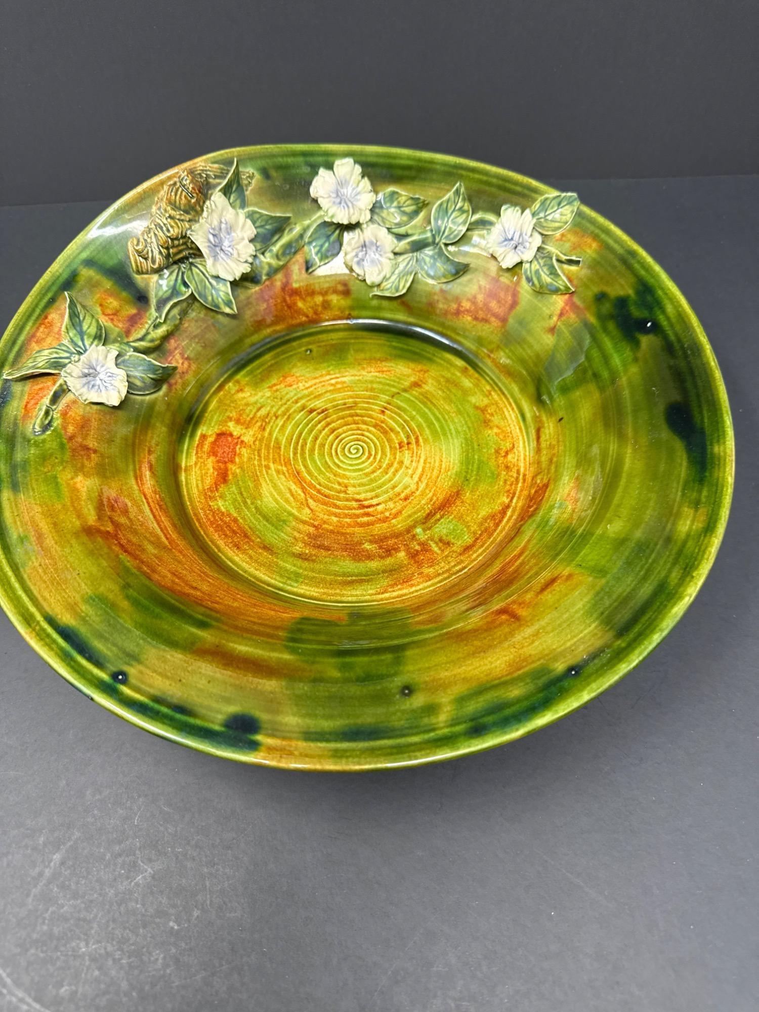 This eye-catching pottery bowl is a unique handmade piece created by artist Catherine in 2003. The bowl features: A vivid swirl of green, orange, and yellow glazes Detailed sculpted white flowers, leafy vines, and a butterfly embellishment along the rim A smooth, spiral-textured center A flat base with cork protectors to prevent surface scratching Dimensions: 10.5" W x 3" T Artist: Catherine Year: 2003 Title on Base: A Designer Creation by Catherine