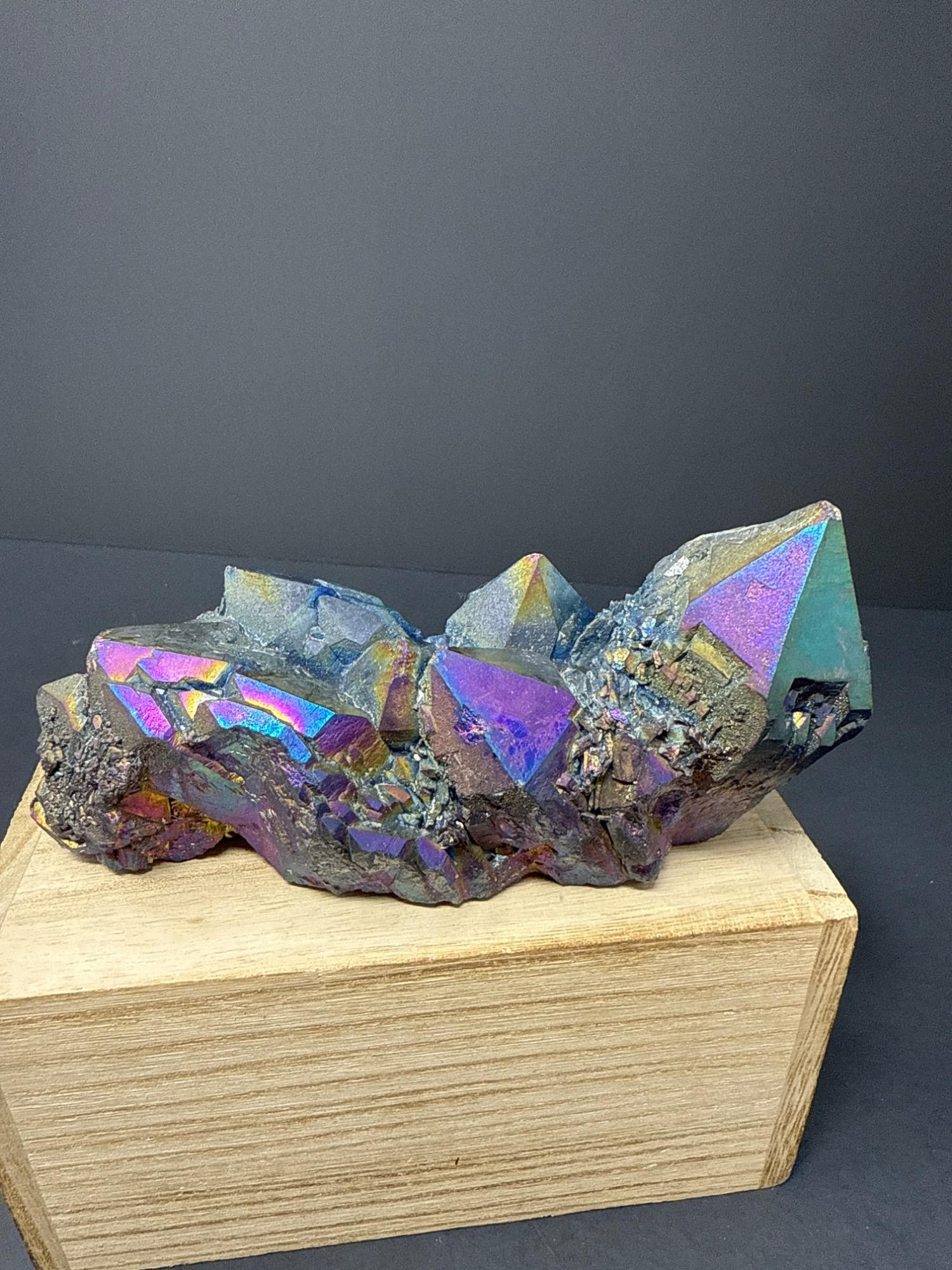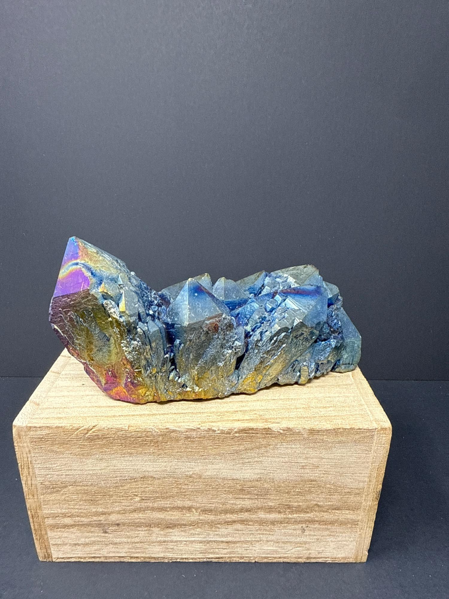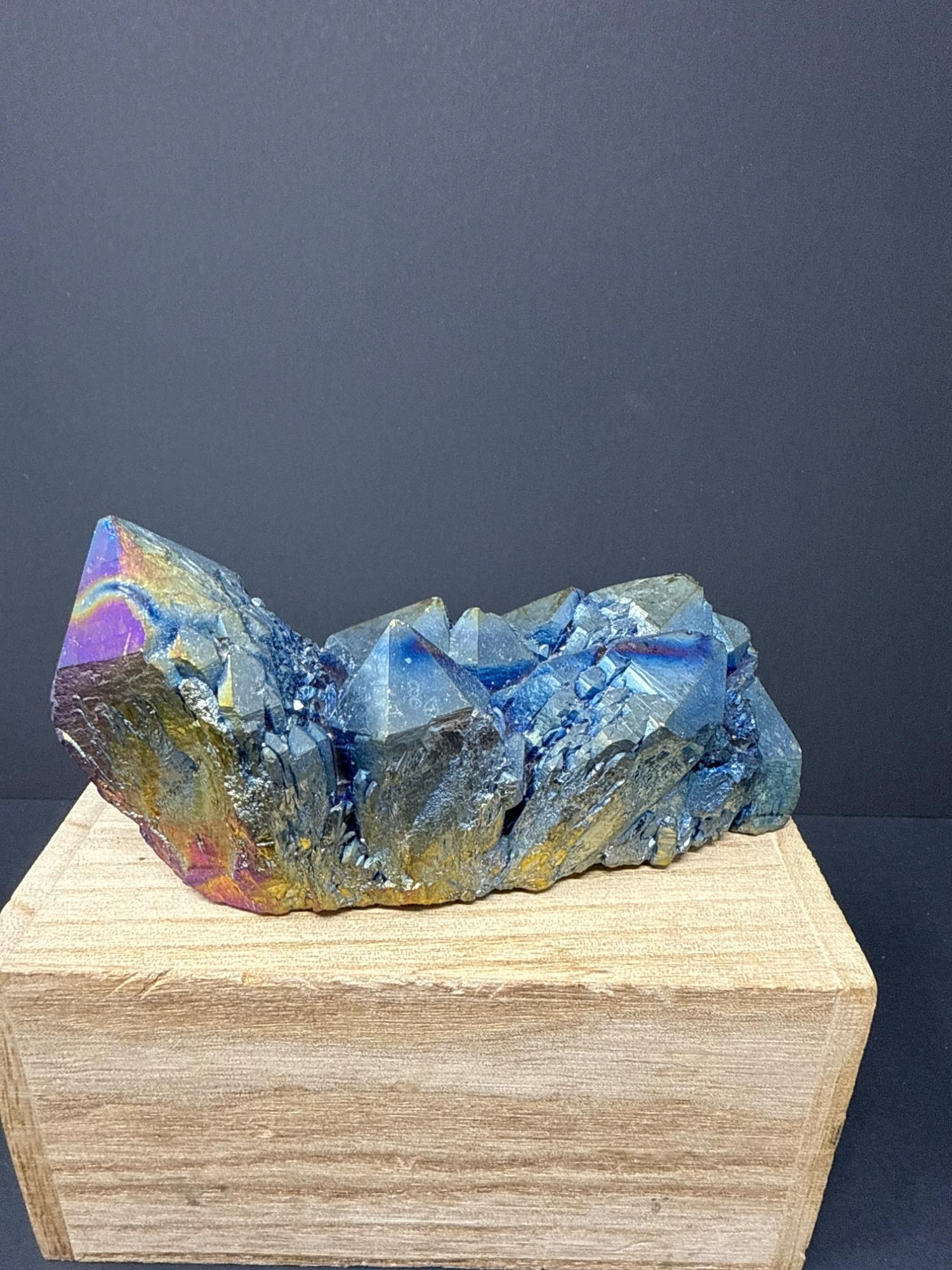 This striking titanium-coated crystal cluster shimmers in vibrant hues of electric blue, gold, purple, and iridescent rainbow tones. This stunning piece is perfect as a display specimen, altar stone, or for energy work. The cluster sits beautifully on a wooden base, showcasing its natural crystalline structure enhanced by the metallic sheen of the titanium treatment. Details: Item: Titanium Rainbow Crystal Cluster Material: Natural quartz treated with titanium Finish: Iridescent metallic sheen (rainbow effect) Measurements: 6 inches long by 2½ inches at its tallest point Price: $125.00 (as marked)