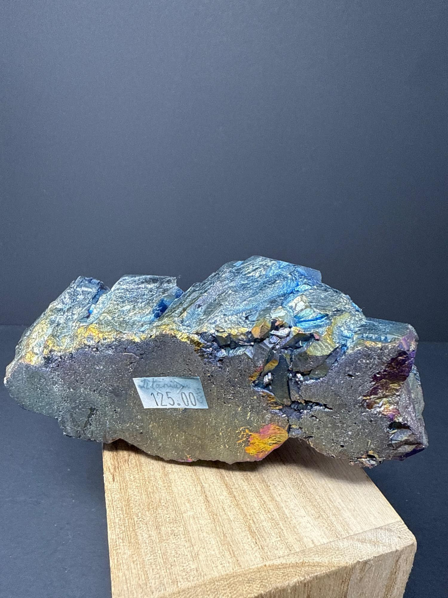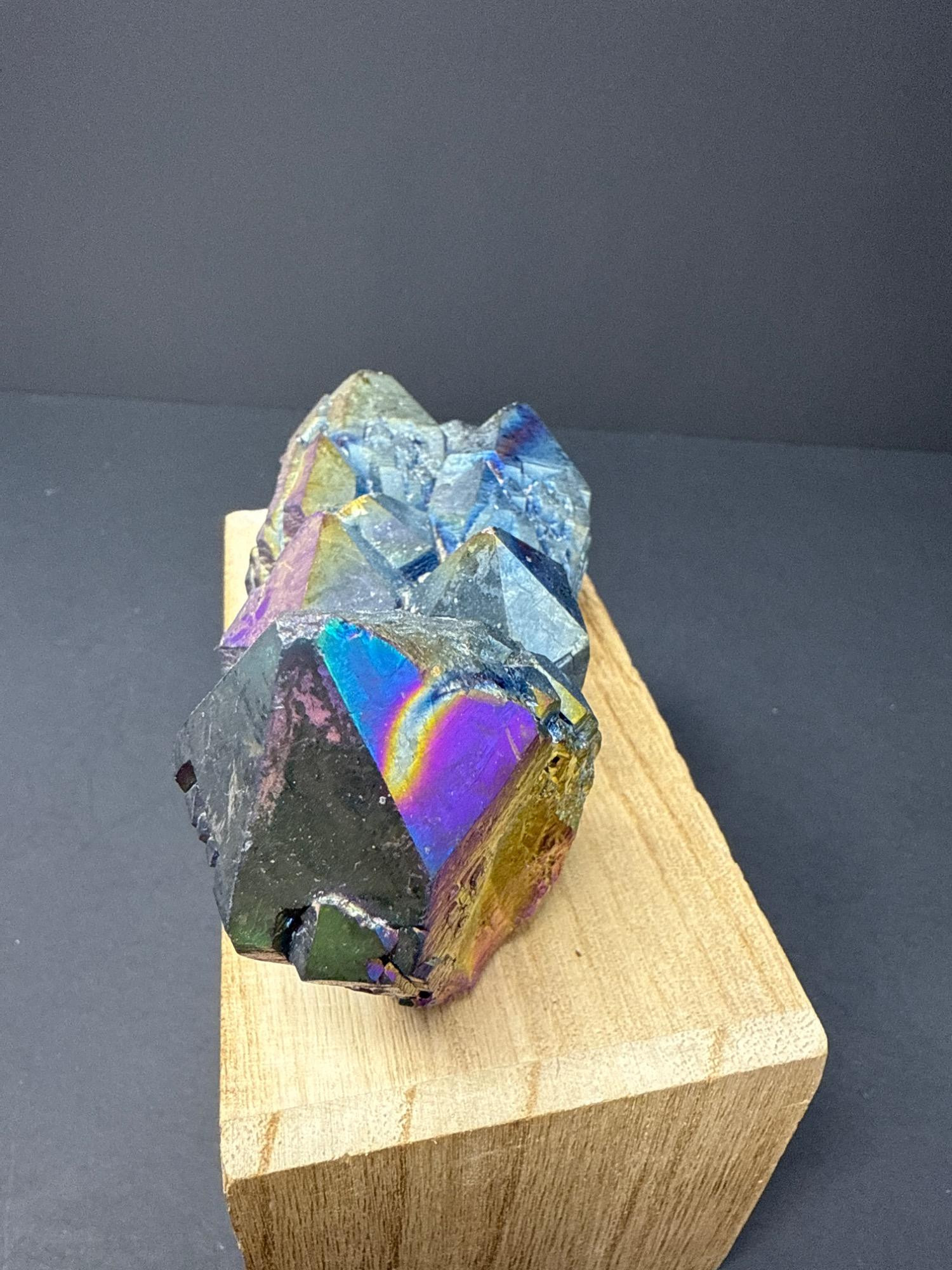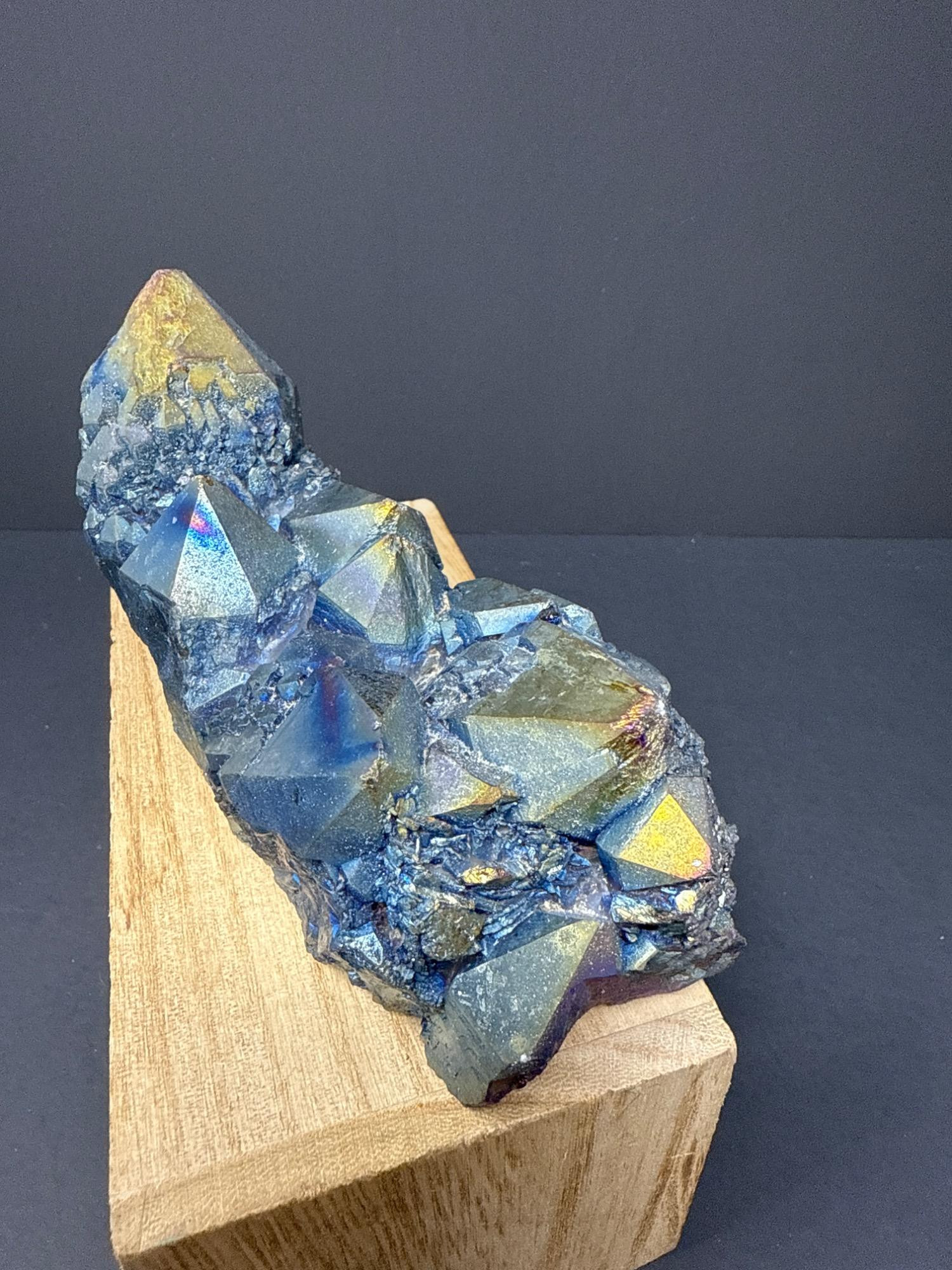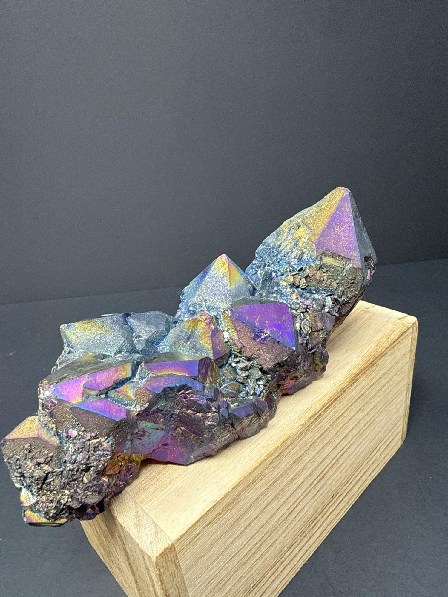 This striking titanium-coated crystal cluster shimmers in vibrant hues of electric blue, gold, purple, and iridescent rainbow tones. This stunning piece is perfect as a display specimen, altar stone, or for energy work. The cluster sits beautifully on a wooden base, showcasing its natural crystalline structure enhanced by the metallic sheen of the titanium treatment. Details: Item: Titanium Rainbow Crystal Cluster Material: Natural quartz treated with titanium Finish: Iridescent metallic sheen (rainbow effect) Measurements: 6 inches long by 2½ inches at its tallest point Price: $125.00 (as marked)