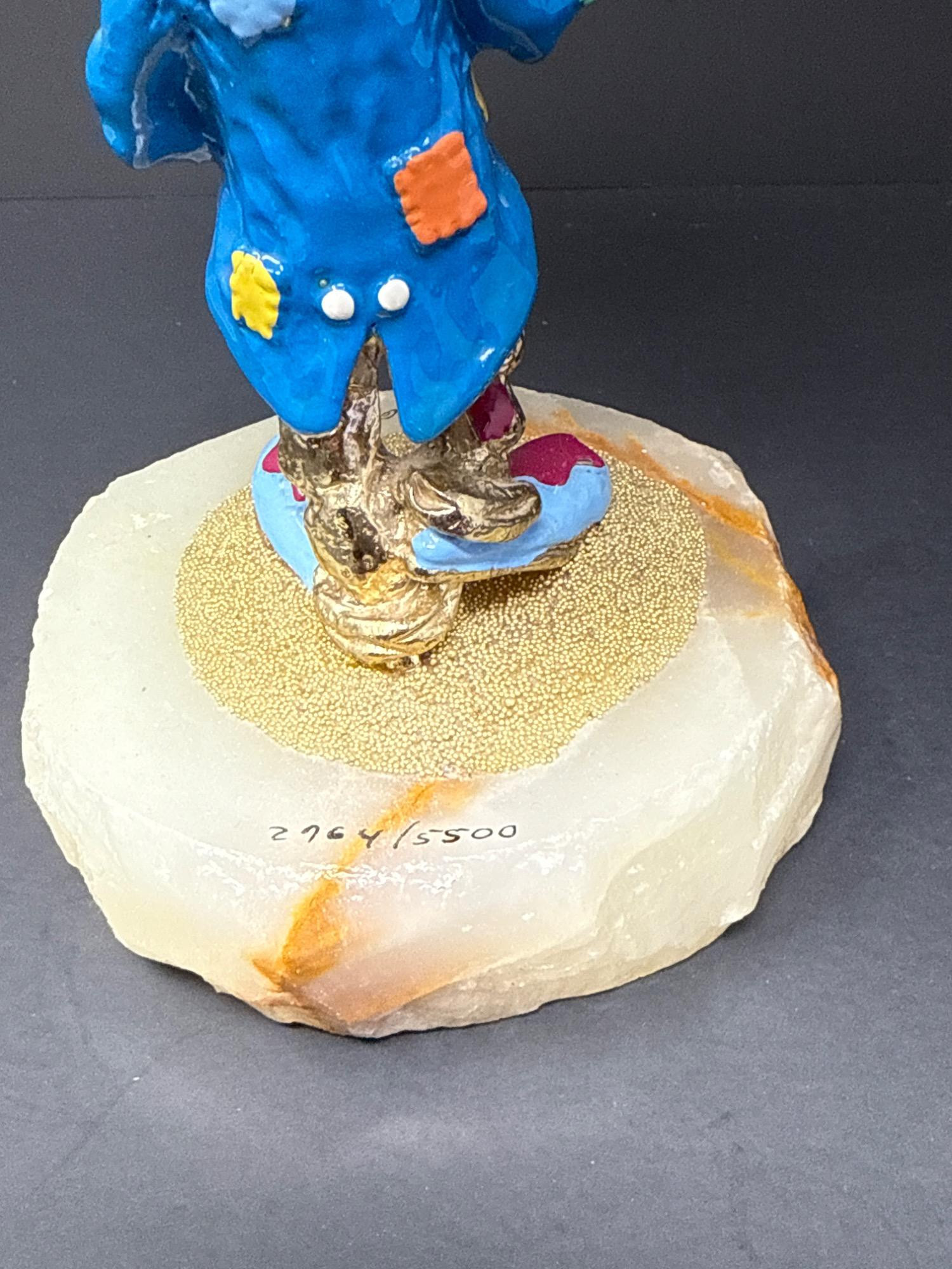 Add a pop of color and whimsy to your collection with this vibrant Ron Lee clown sculpture from 1989. Known for his expressive and playful figures, Ron Lee crafted this limited edition piece with his signature blend of hand-painted detail and solid construction. Title: Ron Lee Clown Sculpture Year: 1989 Dimensions: Approx. 9.5” tall x 4” wide Material: Hand-painted cast sculpture with a solid onyx base Features: Brightly colored clown holding three glossy balloons (red, green, blue) Signature: Signed "Ron 89" on the base Edition Number: 2764 of 5500