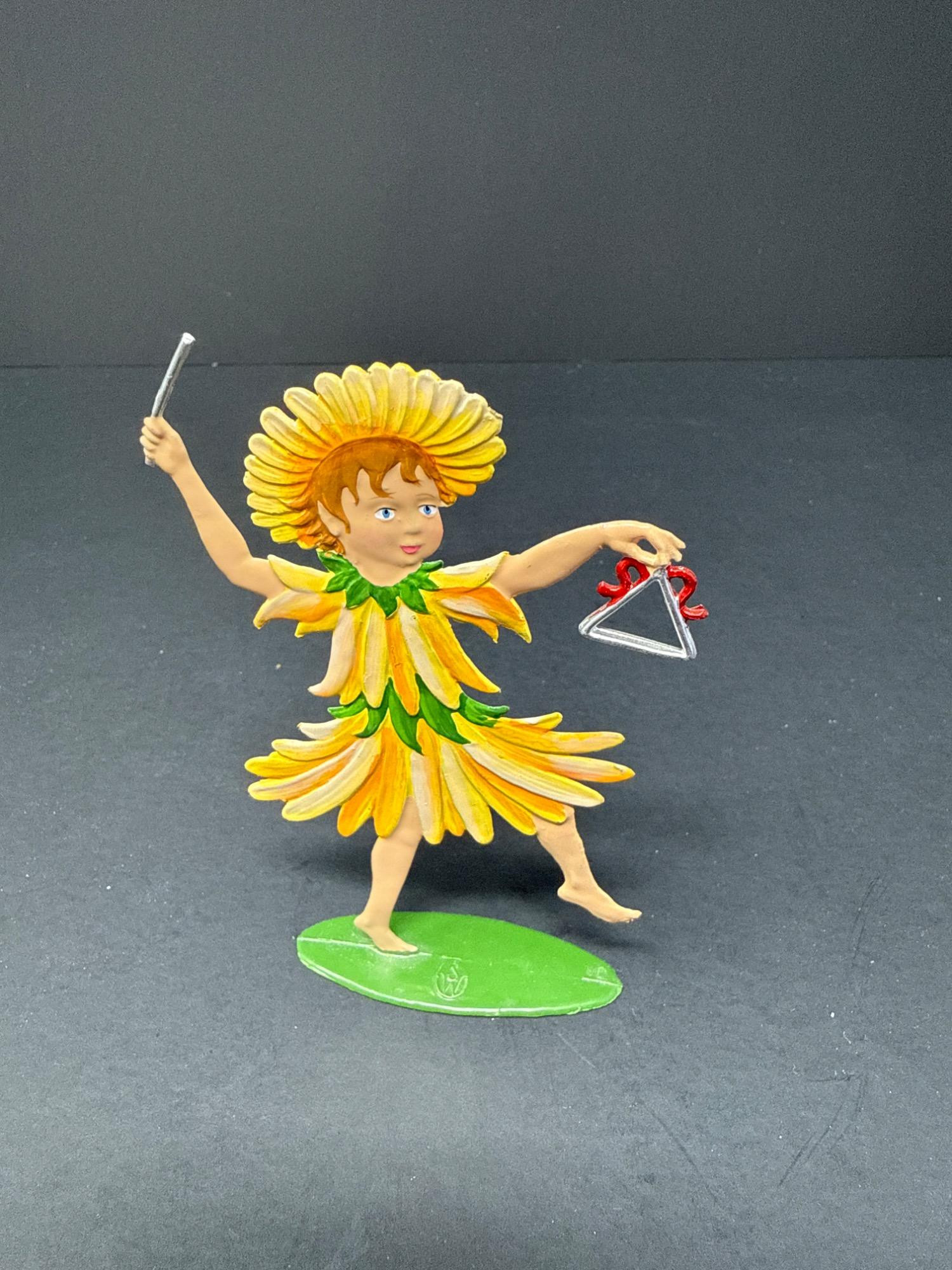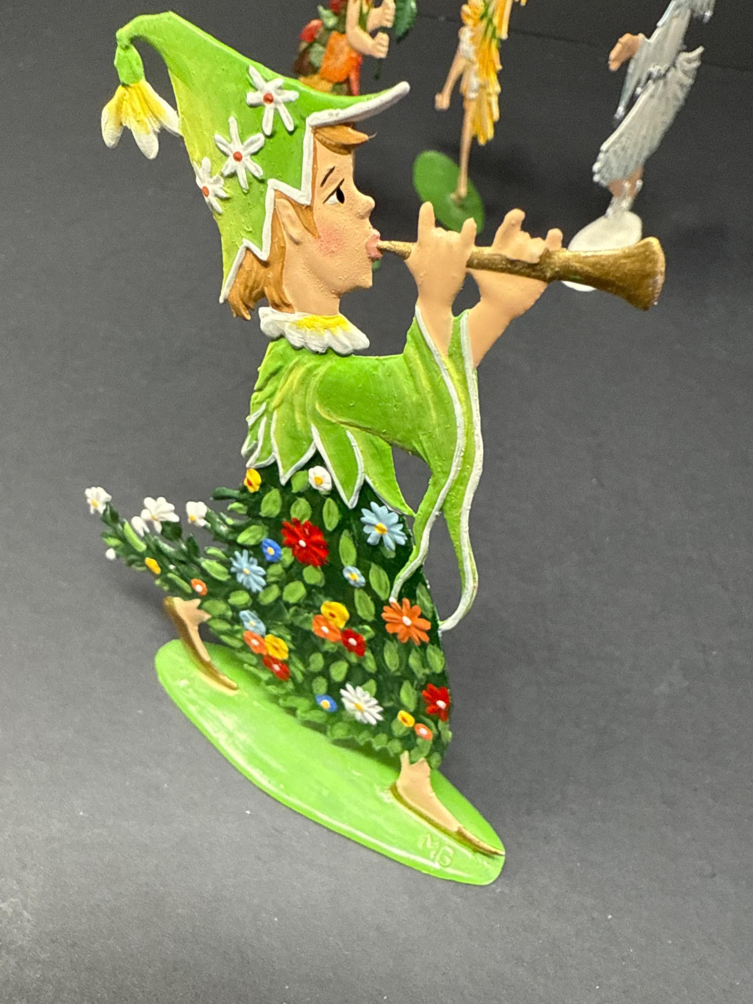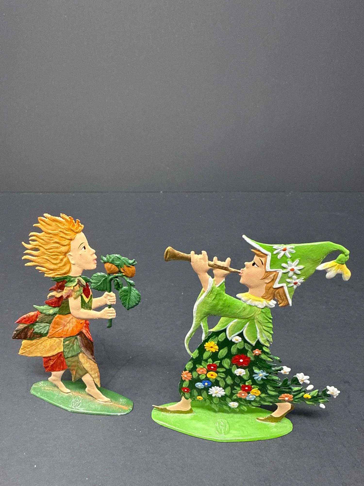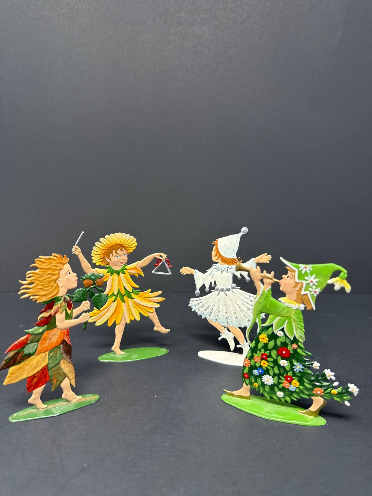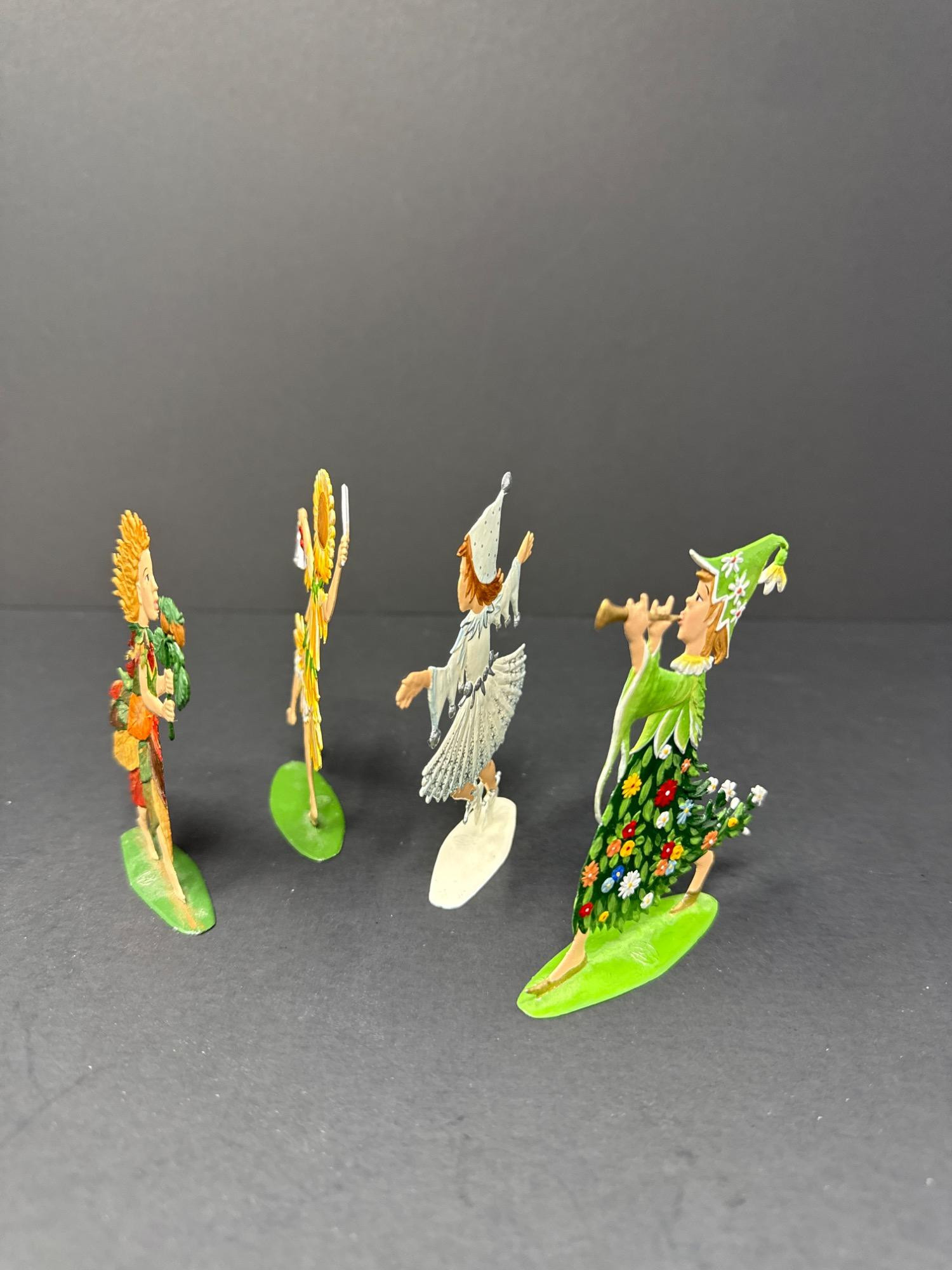 Add charm and elegance to your collection with this delightful set of Wilhelm Schweizer hand-painted pewter miniatures. This whimsical group features four seasonal fairy figures, each exquisitely detailed and hand-painted in vibrant colors. Details: Brand: Wilhelm Schweizer (authentic red seal stamp visible on the base) Material: Hand-cast pewter Hand-painted in Germany Theme: Seasonal Fairies / Flower Elves Quantity: 4 individual figurines Approximate Size: 4" x 3" Figures include: Autumn fairy in earthy tones Spring/Summer fairy dressed in a sunflower petal skirt with a triangle Winter fairy in a frosty white outfit with a pom-pom hat Green fairy adorned with flowers, playing a horn
