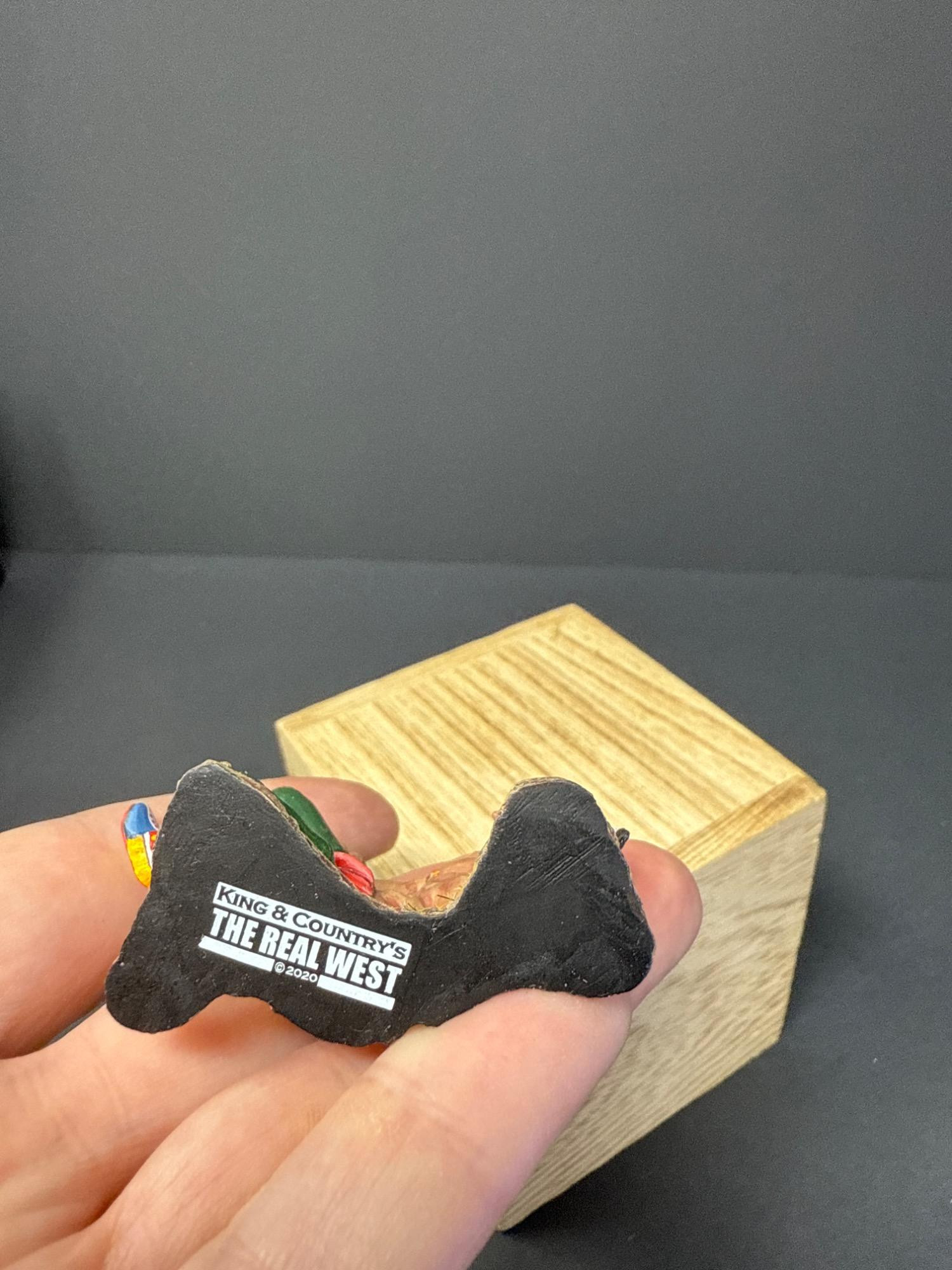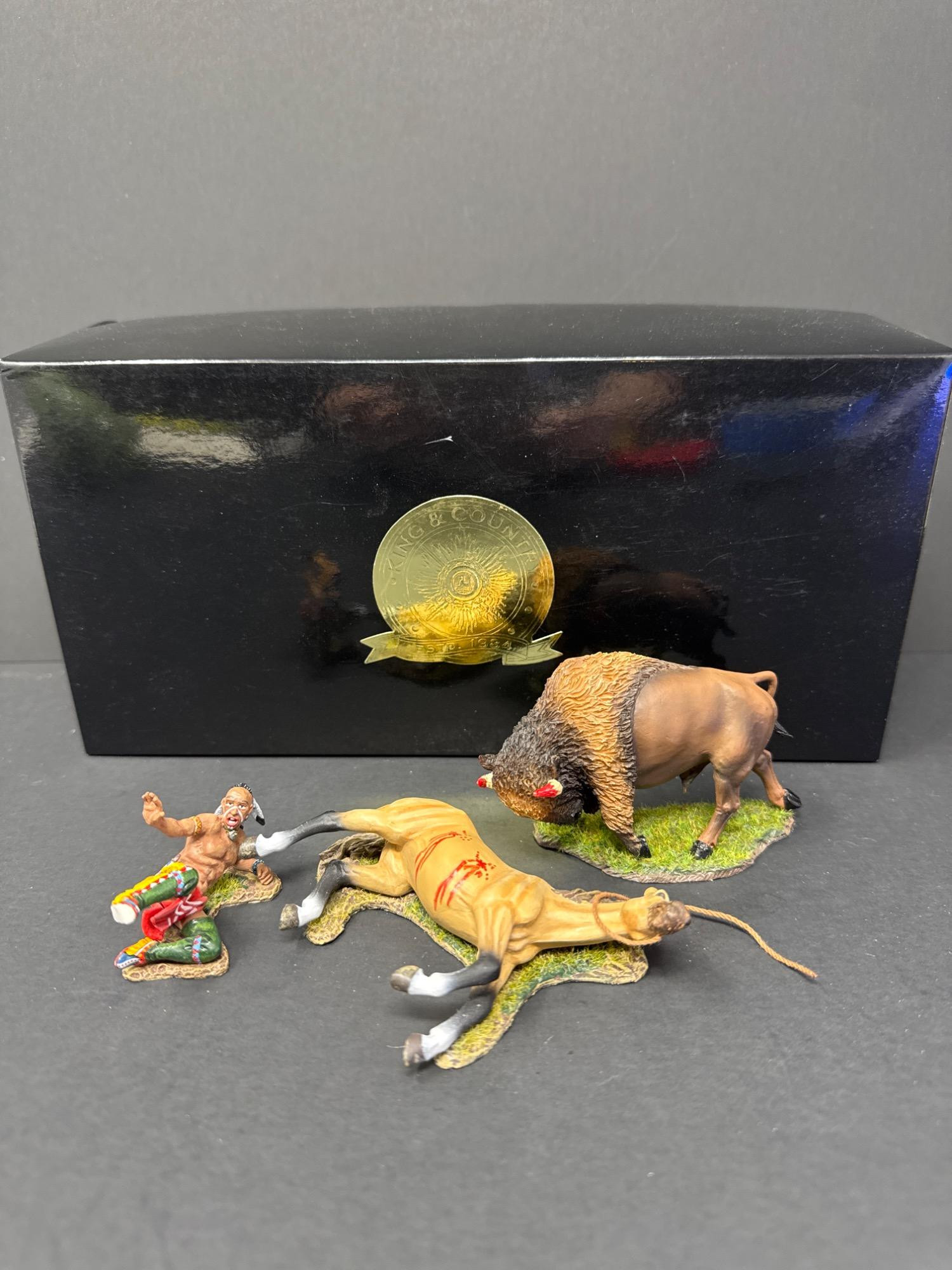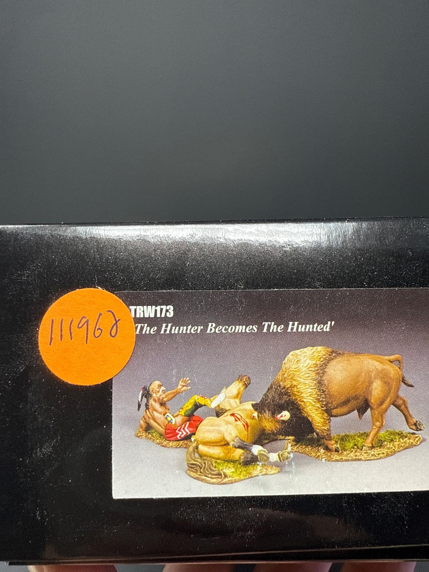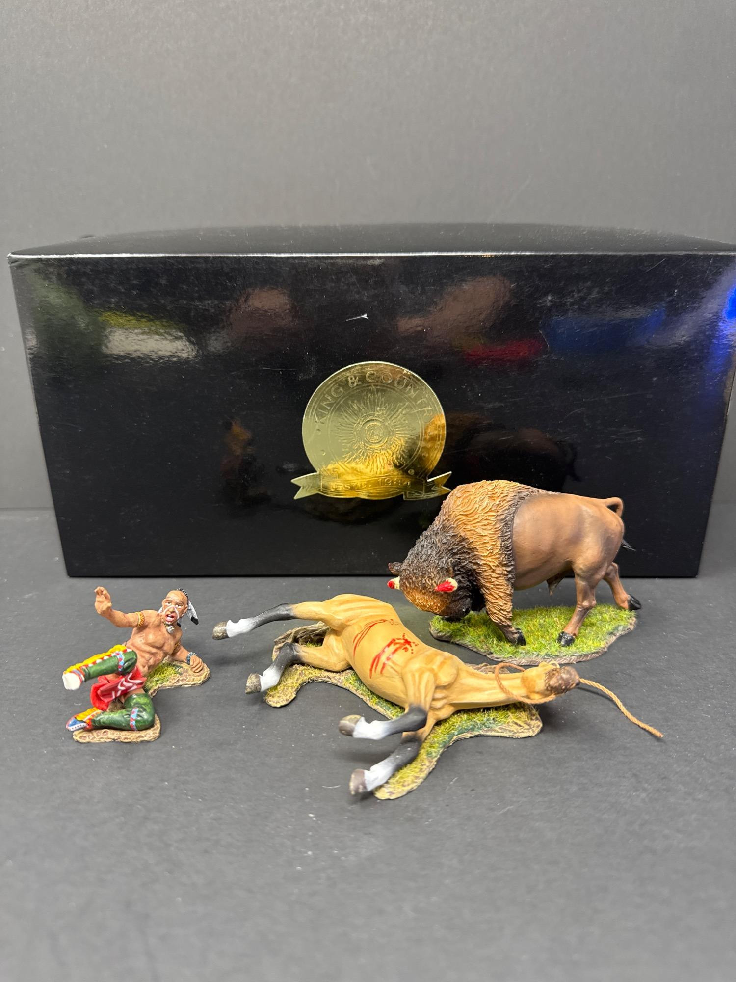 This dramatic three-piece hand-painted metal figure set from King & Country’s The Real West series captures a vivid and intense scene on the American frontier. Titled “The Hunter Becomes The Hunted”, this diorama-style set (TRW173) tells the story of a Native American warrior caught in a perilous encounter with a charging buffalo, after his horse has been struck down. Every figure features exquisite detailing and dynamic poses, from the bison’s muscular stance to the expressive, action-filled sculpt of the warrior. The base of each figure is stamped with King & Country’s THE REAL WEST ©2020. Comes with the original black King & Country box with gold seal and a product card featuring a color image of the full set. Set Includes: Size: Approximately 3.5–2” tall A buffalo in mid-charge A fallen Native American warrior in bright traditional attire A downed horse with war paint markings