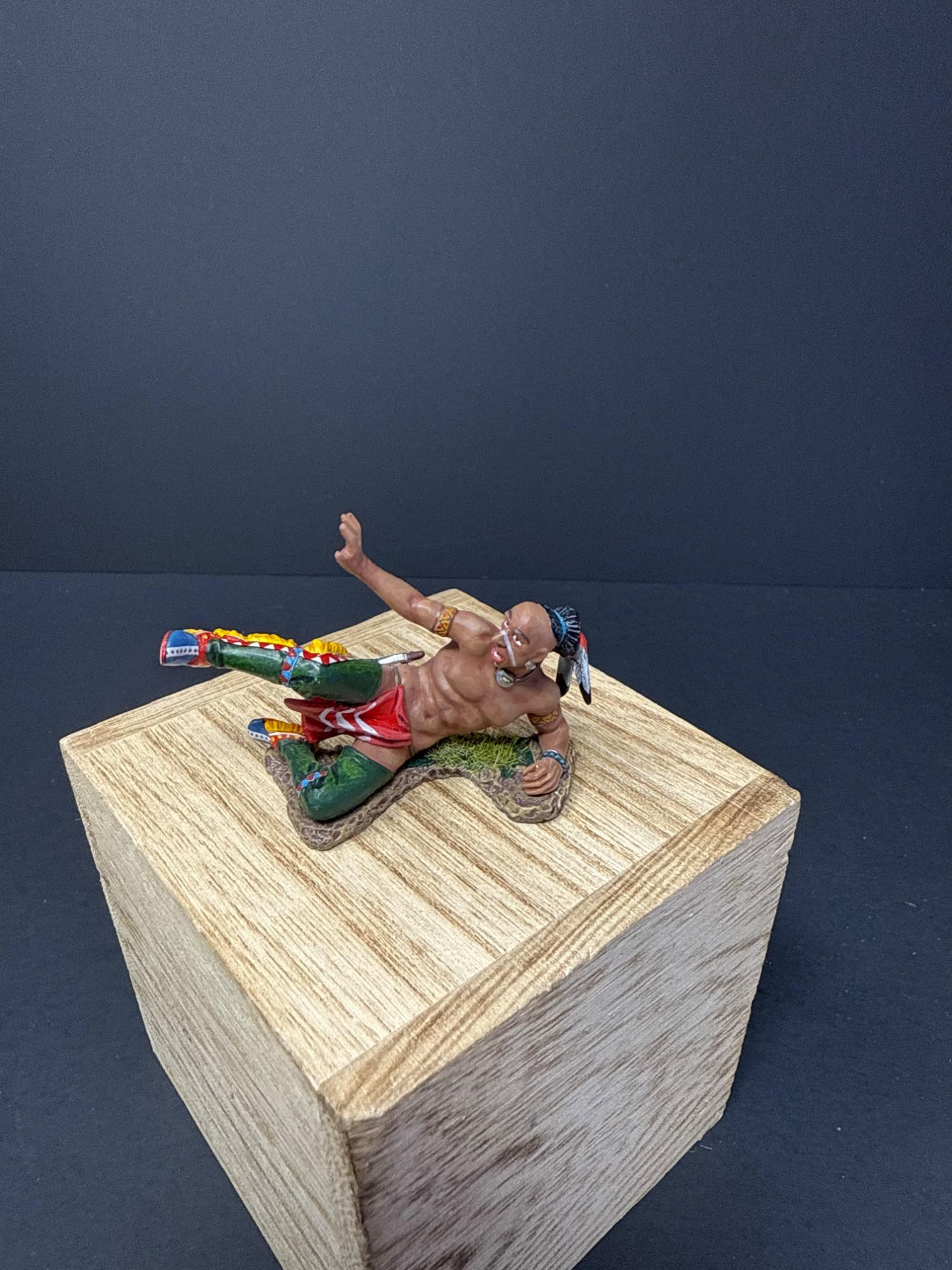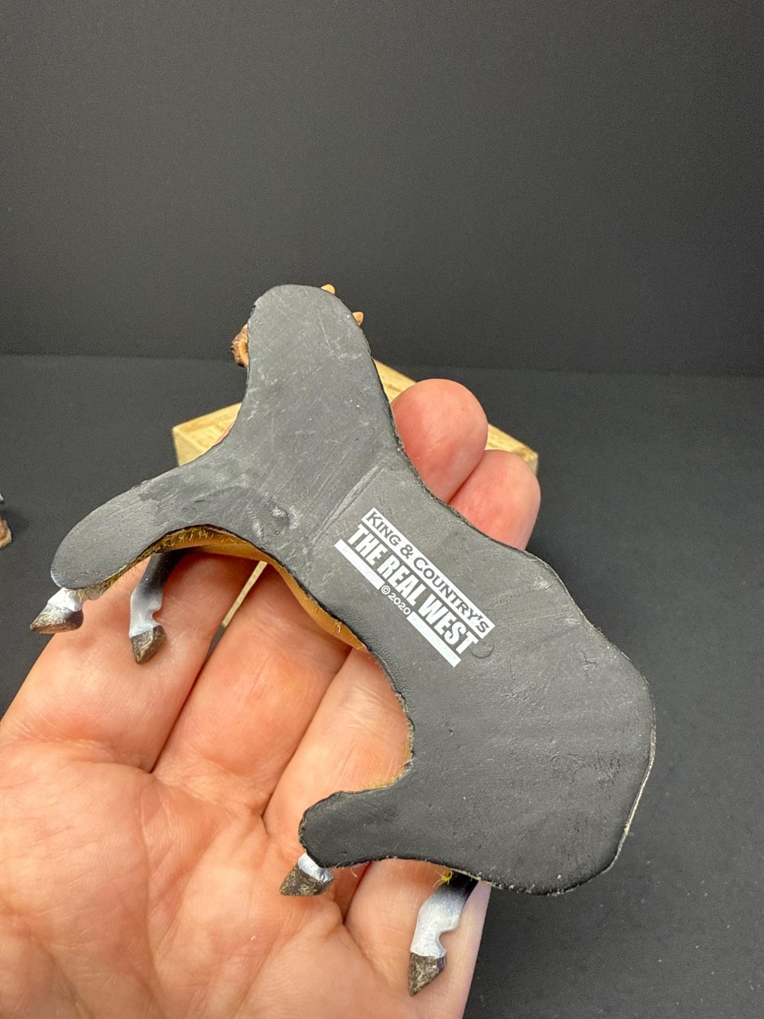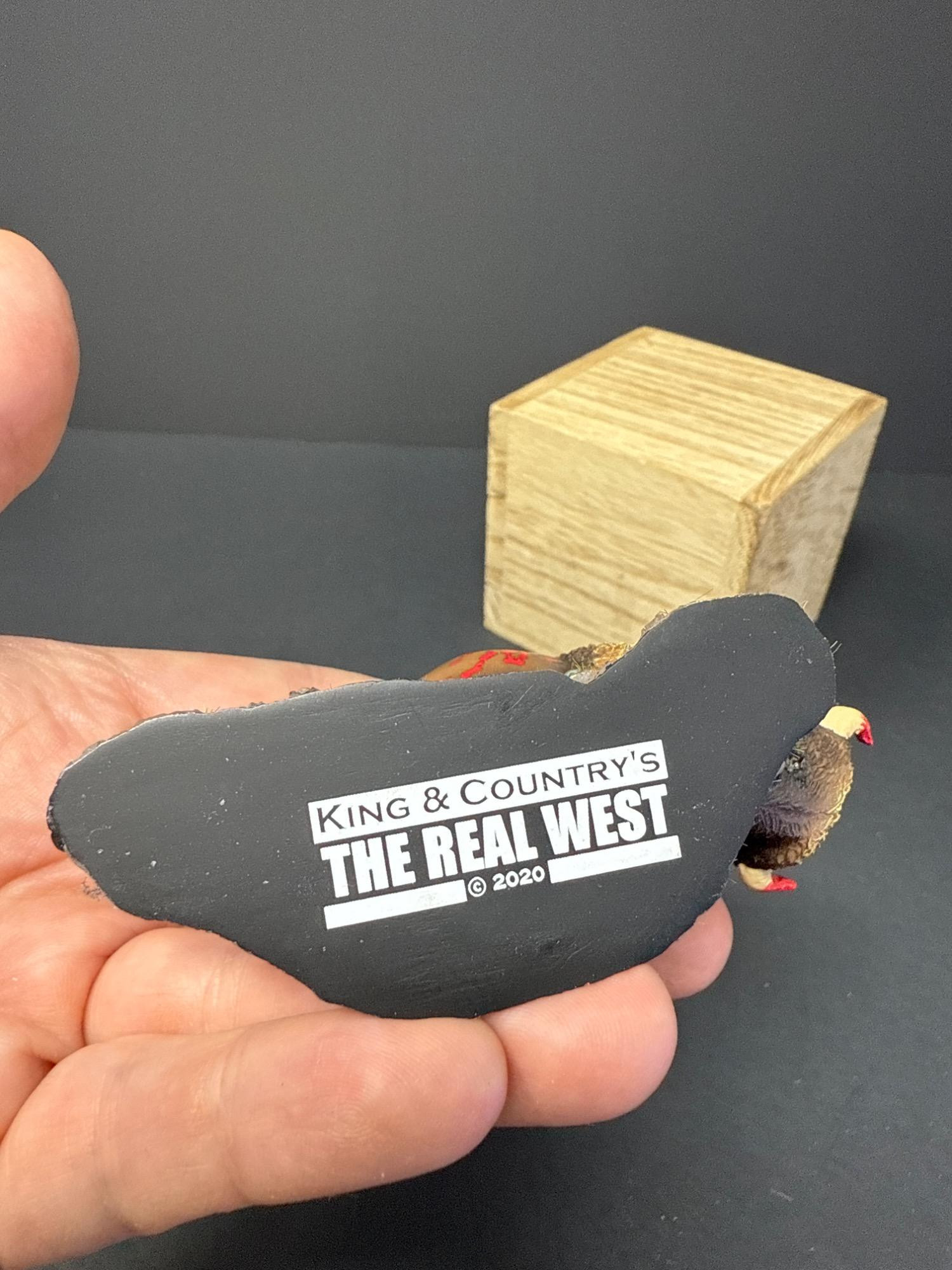 This dramatic three-piece hand-painted metal figure set from King & Country’s The Real West series captures a vivid and intense scene on the American frontier. Titled “The Hunter Becomes The Hunted”, this diorama-style set (TRW173) tells the story of a Native American warrior caught in a perilous encounter with a charging buffalo, after his horse has been struck down. Every figure features exquisite detailing and dynamic poses, from the bison’s muscular stance to the expressive, action-filled sculpt of the warrior. The base of each figure is stamped with King & Country’s THE REAL WEST ©2020. Comes with the original black King & Country box with gold seal and a product card featuring a color image of the full set. Set Includes: Size: Approximately 3.5–2” tall A buffalo in mid-charge A fallen Native American warrior in bright traditional attire A downed horse with war paint markings