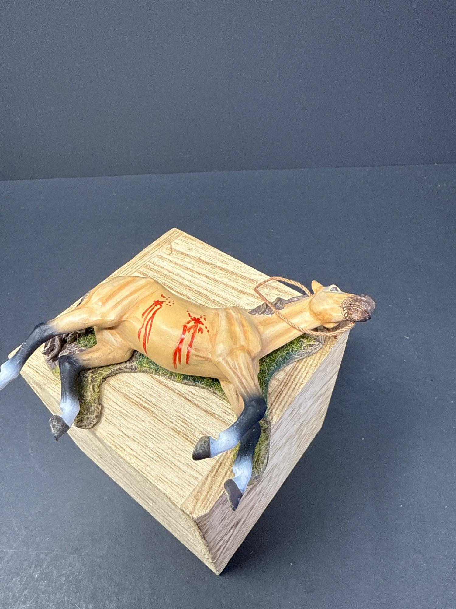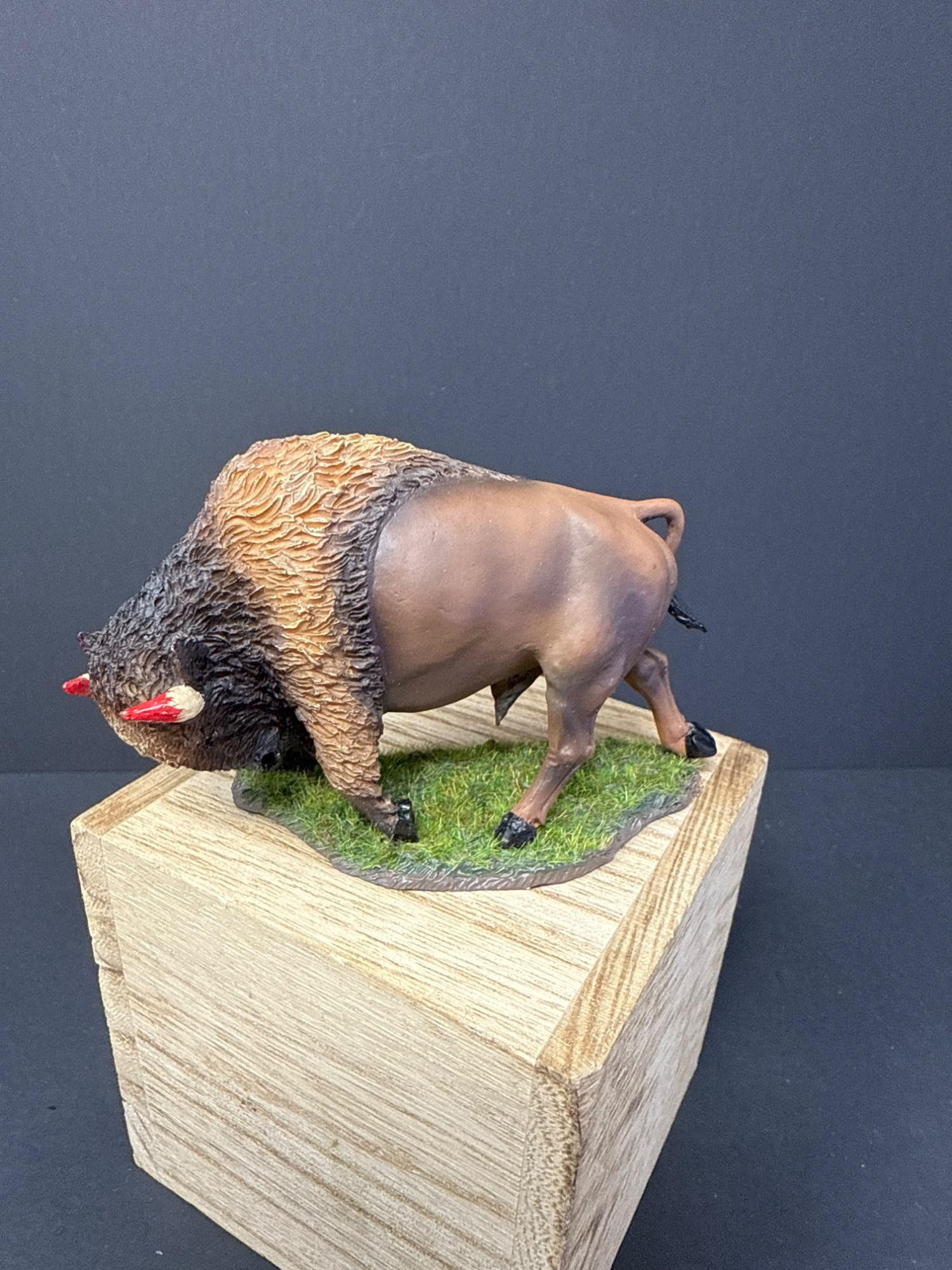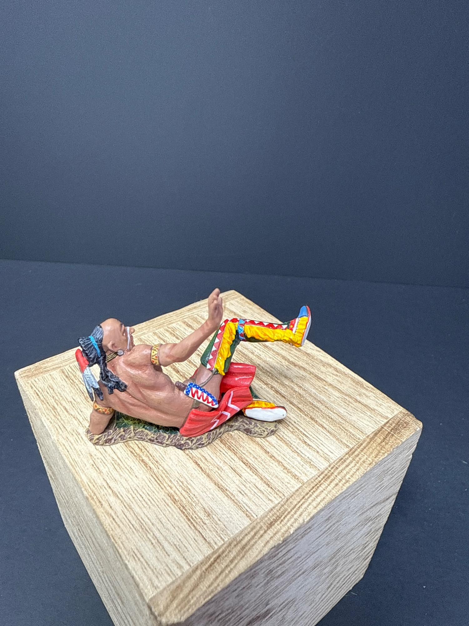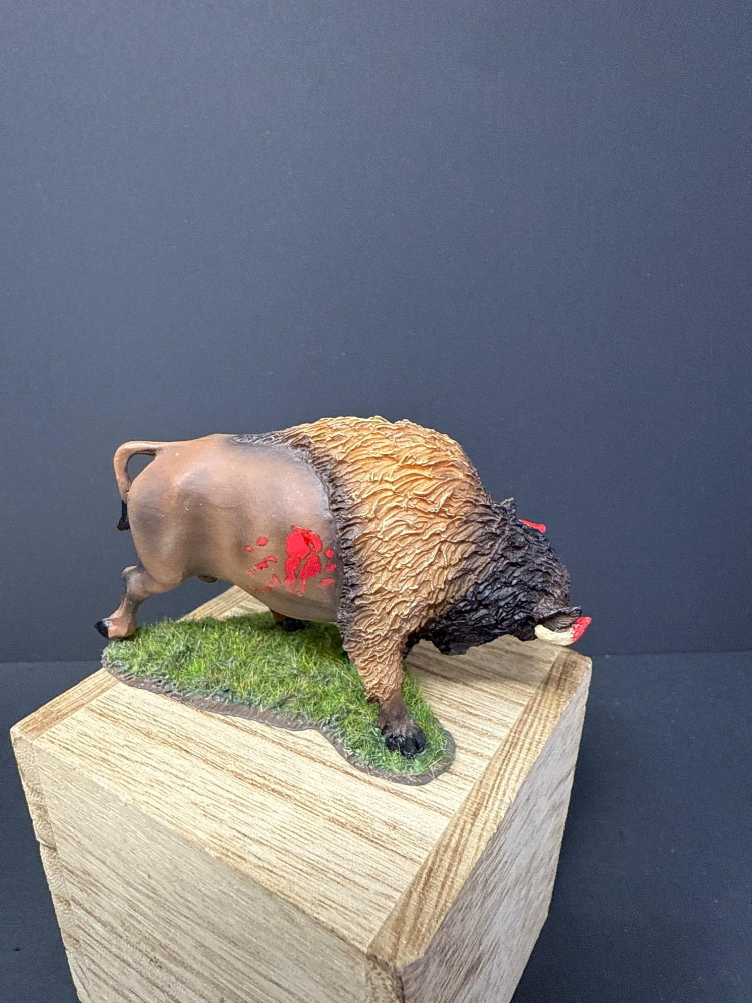 This dramatic three-piece hand-painted metal figure set from King & Country’s The Real West series captures a vivid and intense scene on the American frontier. Titled “The Hunter Becomes The Hunted”, this diorama-style set (TRW173) tells the story of a Native American warrior caught in a perilous encounter with a charging buffalo, after his horse has been struck down. Every figure features exquisite detailing and dynamic poses, from the bison’s muscular stance to the expressive, action-filled sculpt of the warrior. The base of each figure is stamped with King & Country’s THE REAL WEST ©2020. Comes with the original black King & Country box with gold seal and a product card featuring a color image of the full set. Set Includes: Size: Approximately 3.5–2” tall A buffalo in mid-charge A fallen Native American warrior in bright traditional attire A downed horse with war paint markings