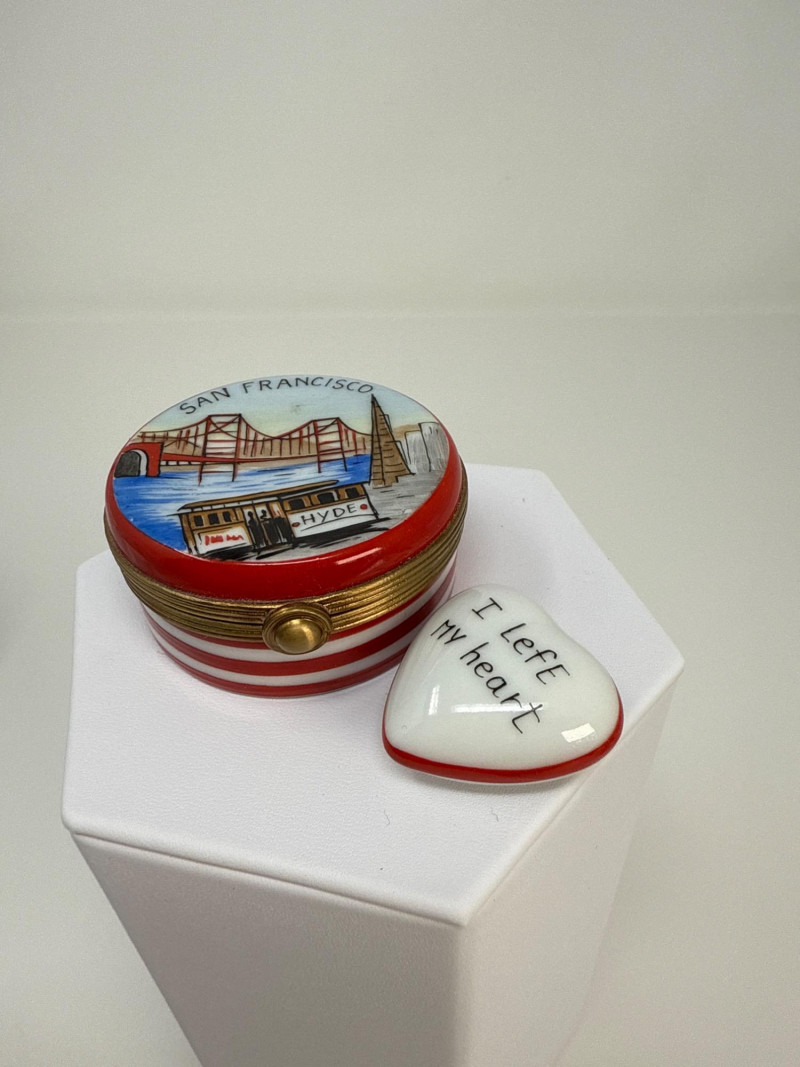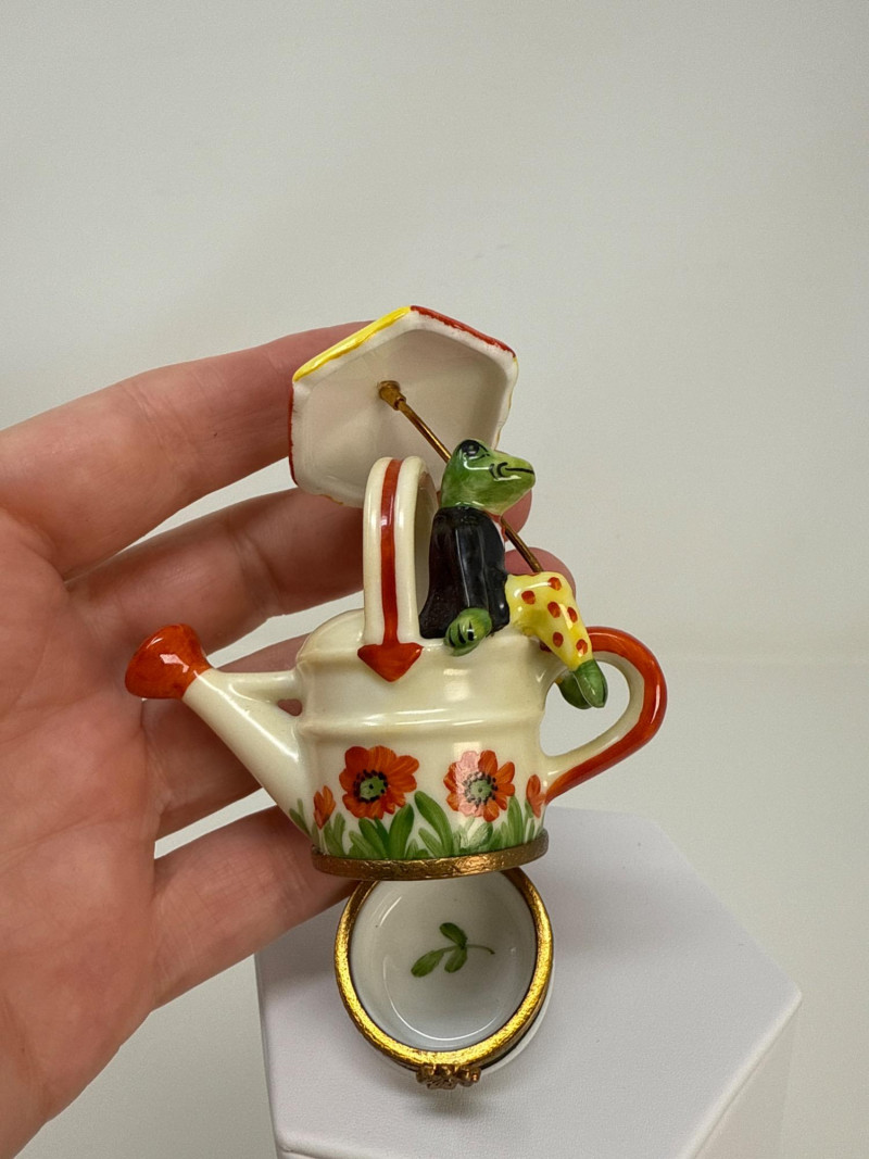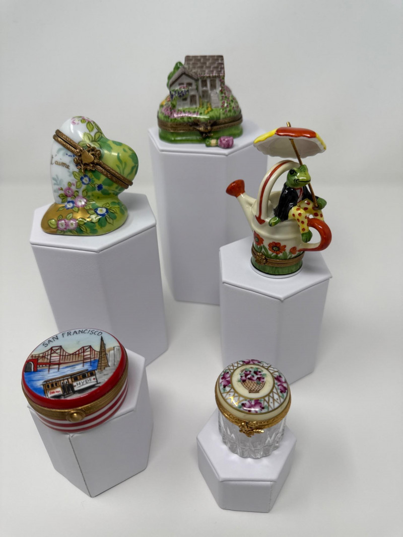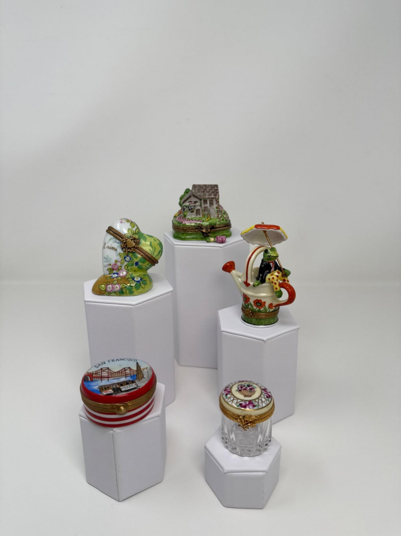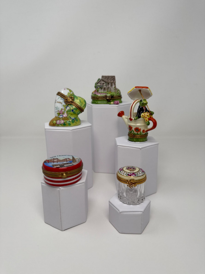 A 5-piece collection of hand-painted Limoges France Peint Main porcelain trinket boxes, each featuring unique designs and fine detailing. All boxes are marked on the underside and include functioning brass clasps and hinges. Included in this set: Frog in Watering Can – A whimsical frog figure holding an umbrella sits inside a teapot-style watering can. Interior features a painted green leaf. Garden Cottage Box – A house and garden scene with a removable miniature turnip. Interior painted with a floral motif. Heart-Shaped Floral Box – Decorated with blue and pink flowers, opens to a golden heart and the message “Je t’aime.” San Francisco Cable Car – Round red and white striped box with painted San Francisco scene. Includes a porcelain heart insert with the message “I left my heart ♥.” Crystal & Porcelain Floral Round Box – Clear faceted crystal base with a hand-painted porcelain lid featuring pink flowers and gold detailing. Size: Each piece measures between 2 to 3 inches
