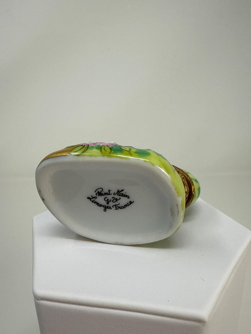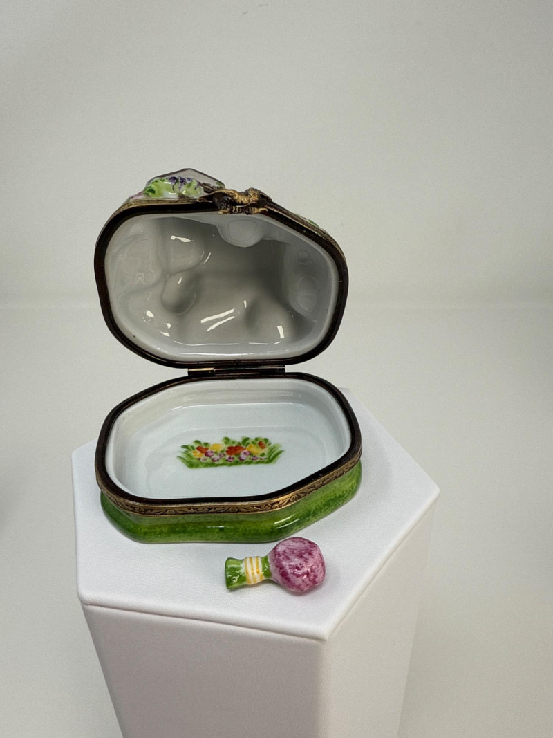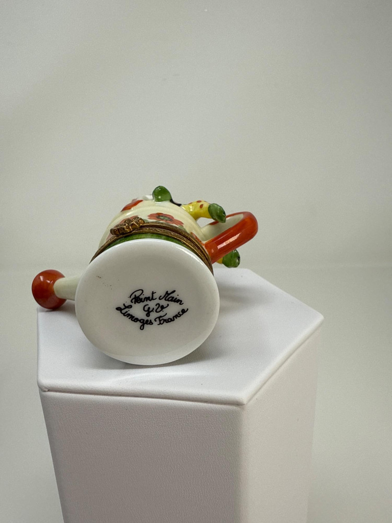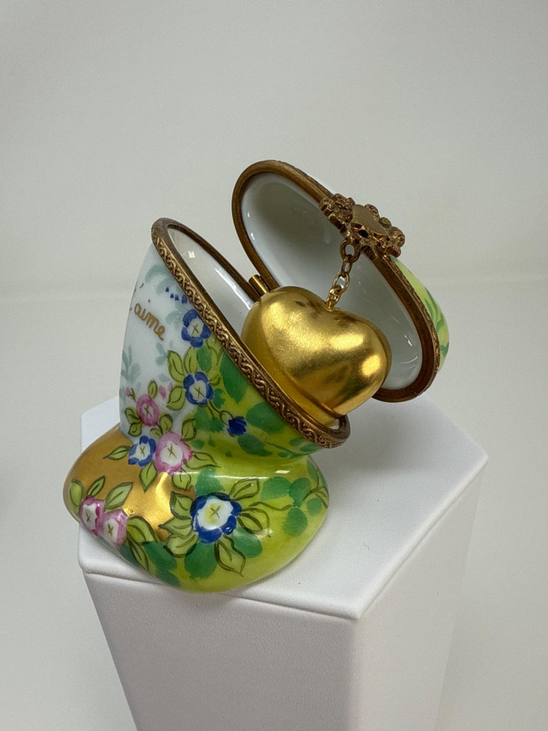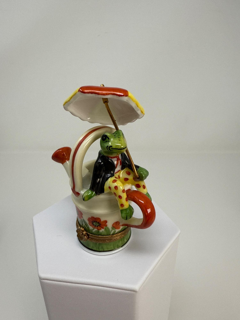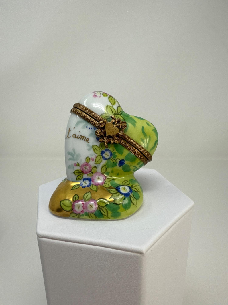 A 5-piece collection of hand-painted Limoges France Peint Main porcelain trinket boxes, each featuring unique designs and fine detailing. All boxes are marked on the underside and include functioning brass clasps and hinges. Included in this set: Frog in Watering Can – A whimsical frog figure holding an umbrella sits inside a teapot-style watering can. Interior features a painted green leaf. Garden Cottage Box – A house and garden scene with a removable miniature turnip. Interior painted with a floral motif. Heart-Shaped Floral Box – Decorated with blue and pink flowers, opens to a golden heart and the message “Je t’aime.” San Francisco Cable Car – Round red and white striped box with painted San Francisco scene. Includes a porcelain heart insert with the message “I left my heart ♥.” Crystal & Porcelain Floral Round Box – Clear faceted crystal base with a hand-painted porcelain lid featuring pink flowers and gold detailing. Size: Each piece measures between 2 to 3 inches