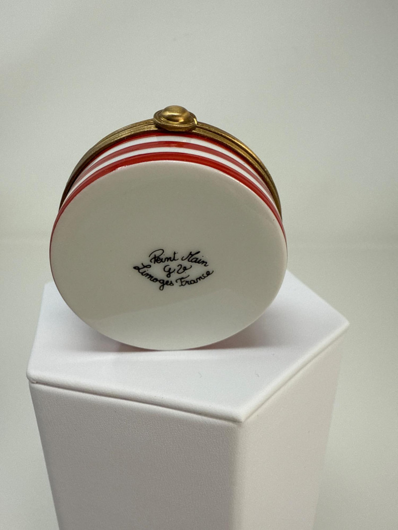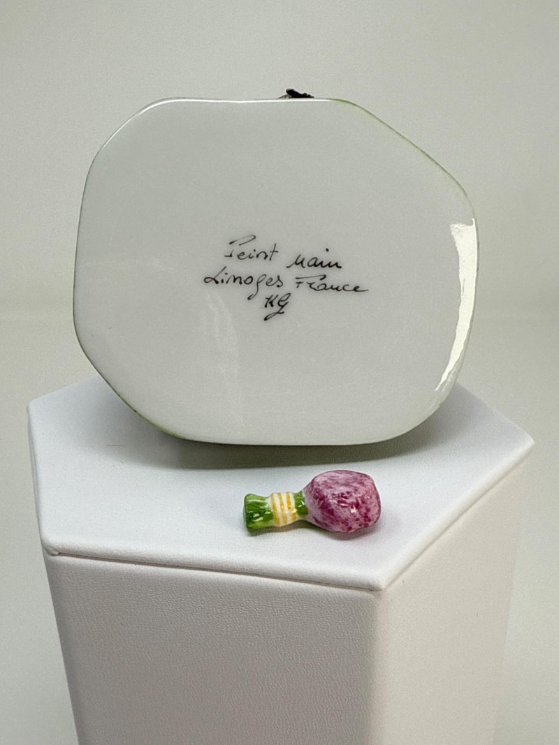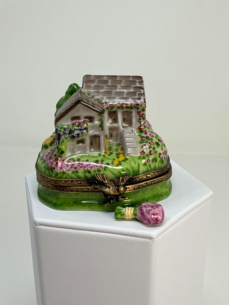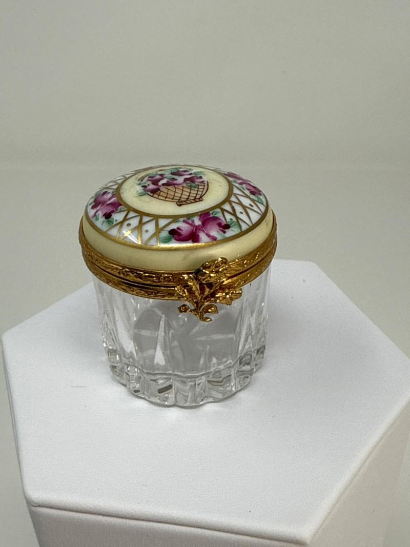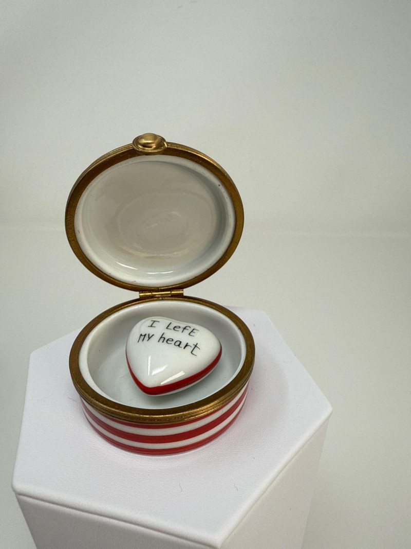 A 5-piece collection of hand-painted Limoges France Peint Main porcelain trinket boxes, each featuring unique designs and fine detailing. All boxes are marked on the underside and include functioning brass clasps and hinges. Included in this set: Frog in Watering Can – A whimsical frog figure holding an umbrella sits inside a teapot-style watering can. Interior features a painted green leaf. Garden Cottage Box – A house and garden scene with a removable miniature turnip. Interior painted with a floral motif. Heart-Shaped Floral Box – Decorated with blue and pink flowers, opens to a golden heart and the message “Je t’aime.” San Francisco Cable Car – Round red and white striped box with painted San Francisco scene. Includes a porcelain heart insert with the message “I left my heart ♥.” Crystal & Porcelain Floral Round Box – Clear faceted crystal base with a hand-painted porcelain lid featuring pink flowers and gold detailing. Size: Each piece measures between 2 to 3 inches