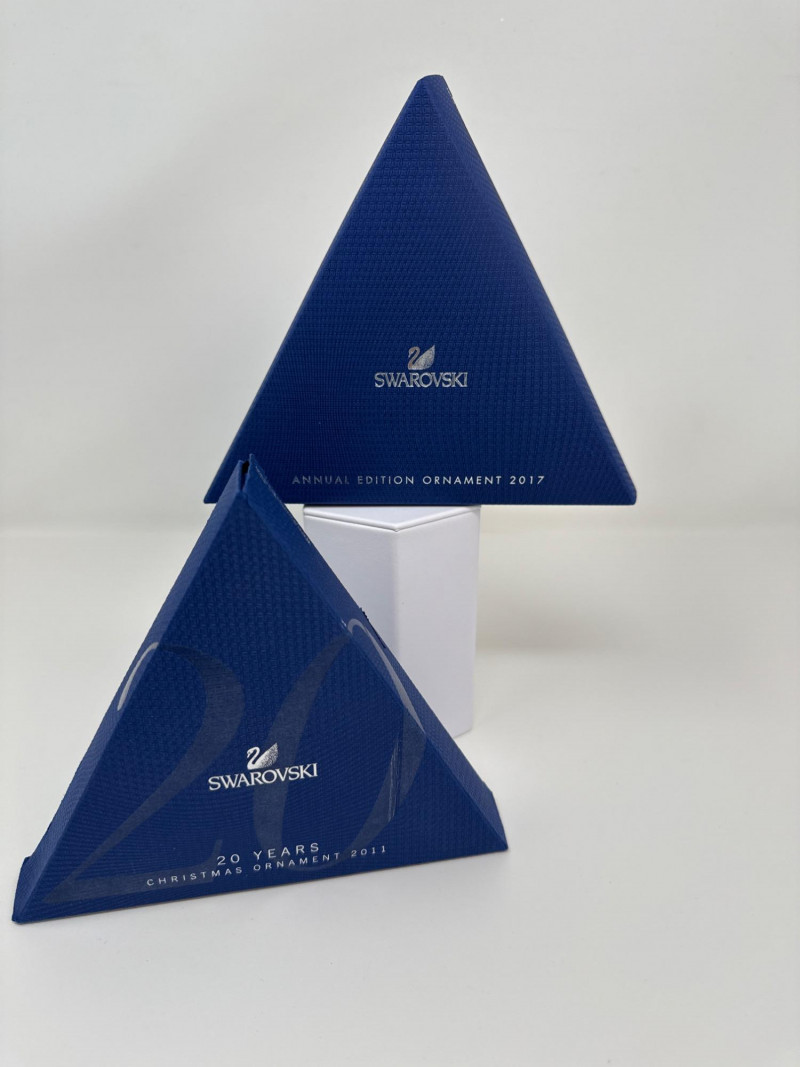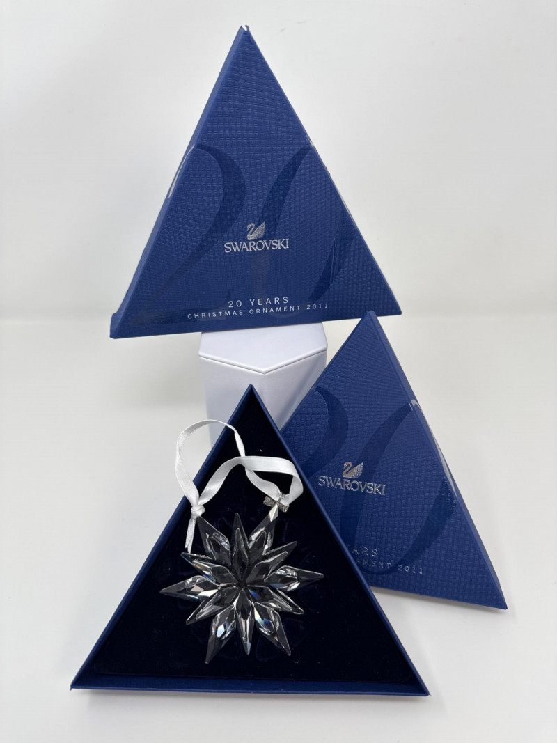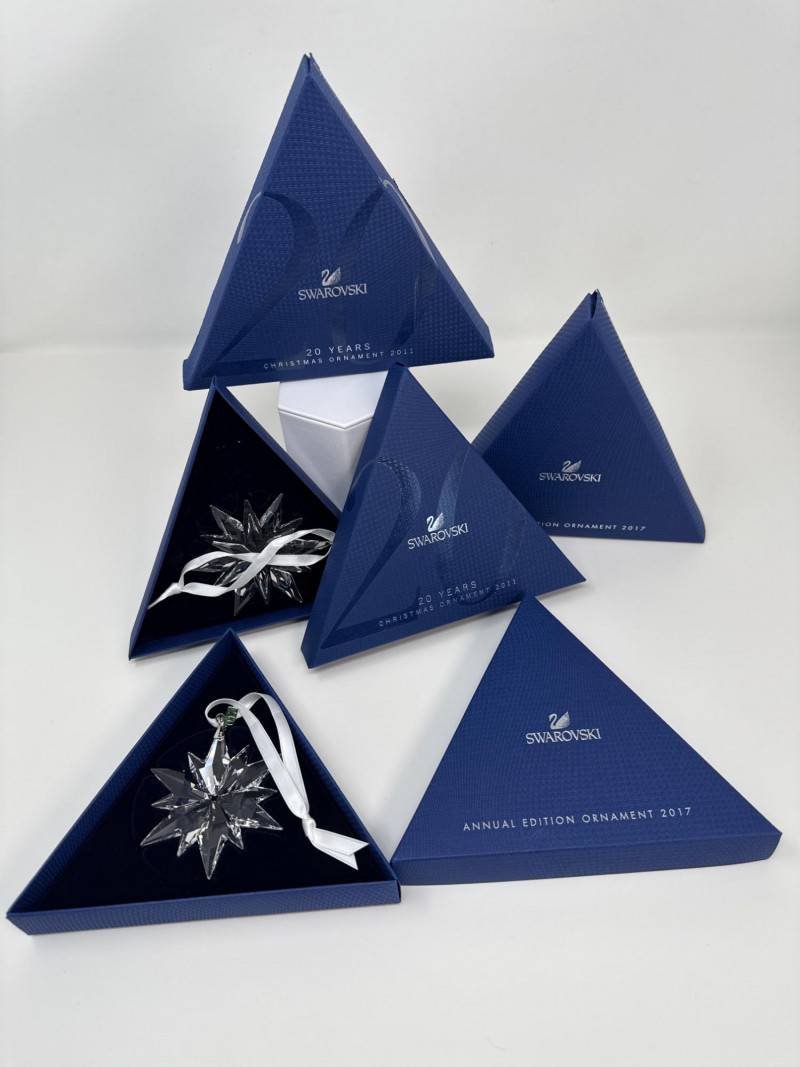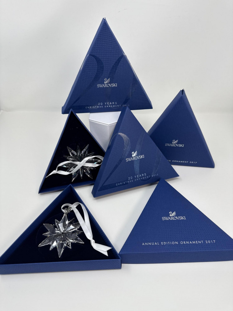 Add timeless sparkle to your holiday décor with this elegant set of two Swarovski crystal snowflake ornaments from the 2011 and 2017 Annual Edition collections. Each ornament features a dazzling multi-faceted star design crafted in clear crystal and comes with a white satin ribbon for hanging. These collectible pieces are presented in their original signature blue triangular boxes, marked respectively with: 2011 – 20 Years Christmas Ornament 2017 – Annual Edition Ornament 2