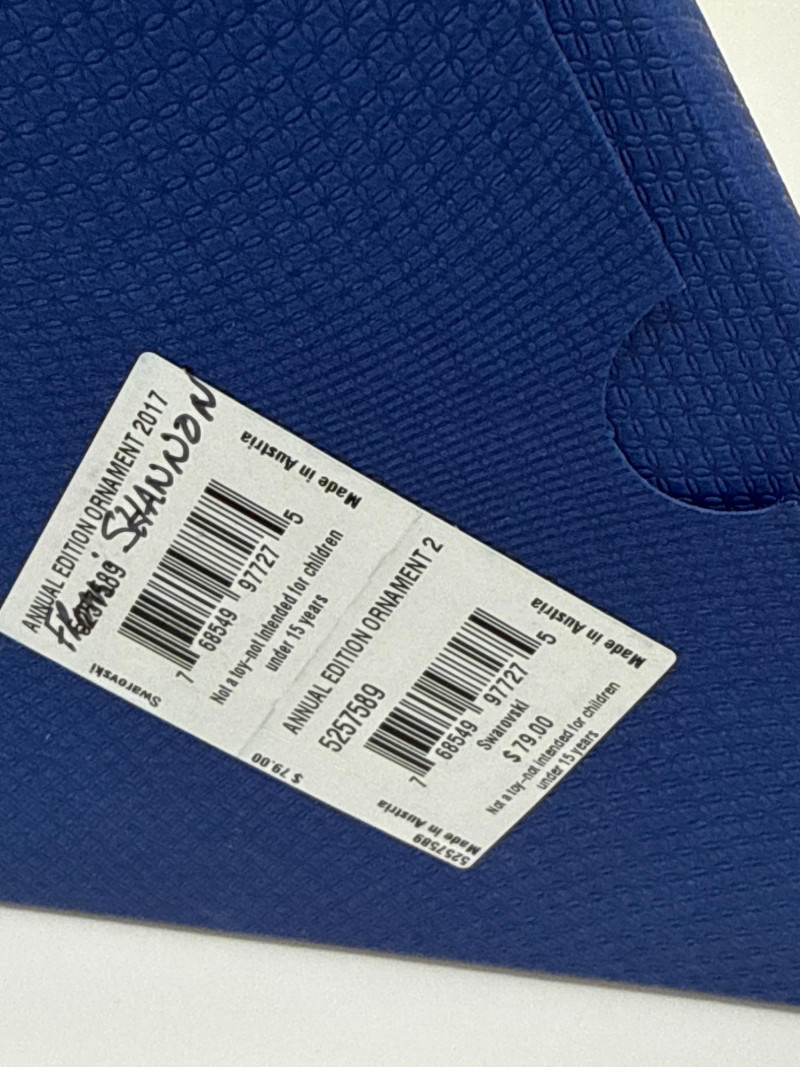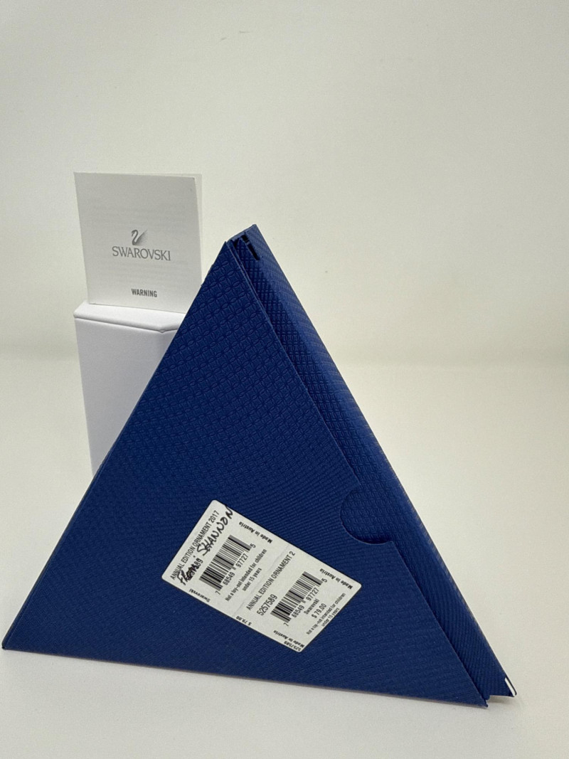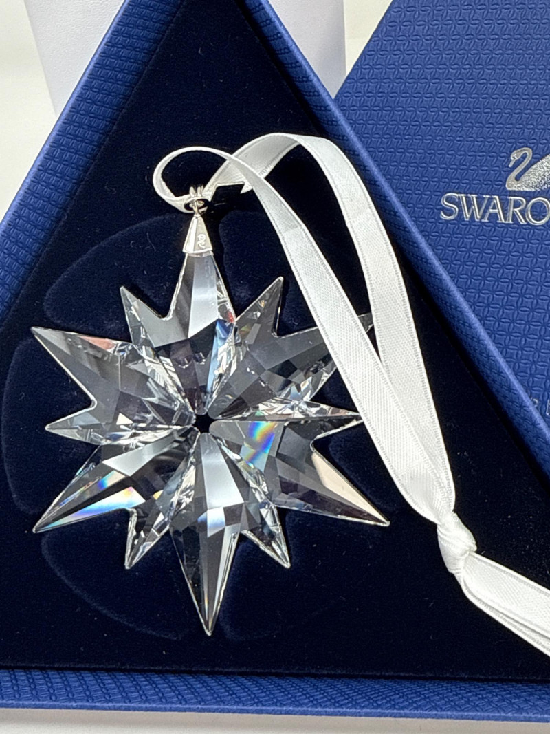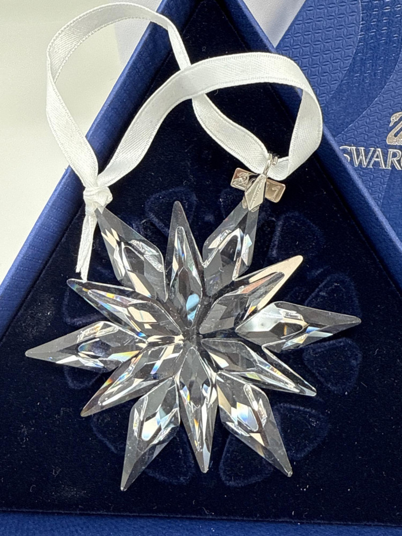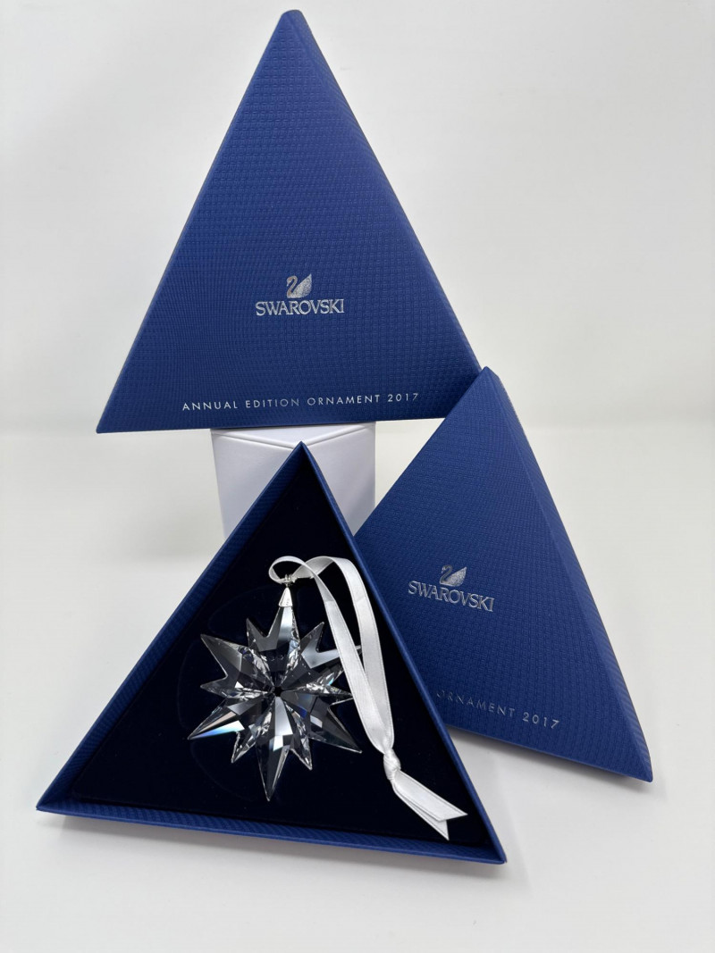 Add timeless sparkle to your holiday décor with this elegant set of two Swarovski crystal snowflake ornaments from the 2011 and 2017 Annual Edition collections. Each ornament features a dazzling multi-faceted star design crafted in clear crystal and comes with a white satin ribbon for hanging. These collectible pieces are presented in their original signature blue triangular boxes, marked respectively with: 2011 – 20 Years Christmas Ornament 2017 – Annual Edition Ornament 2