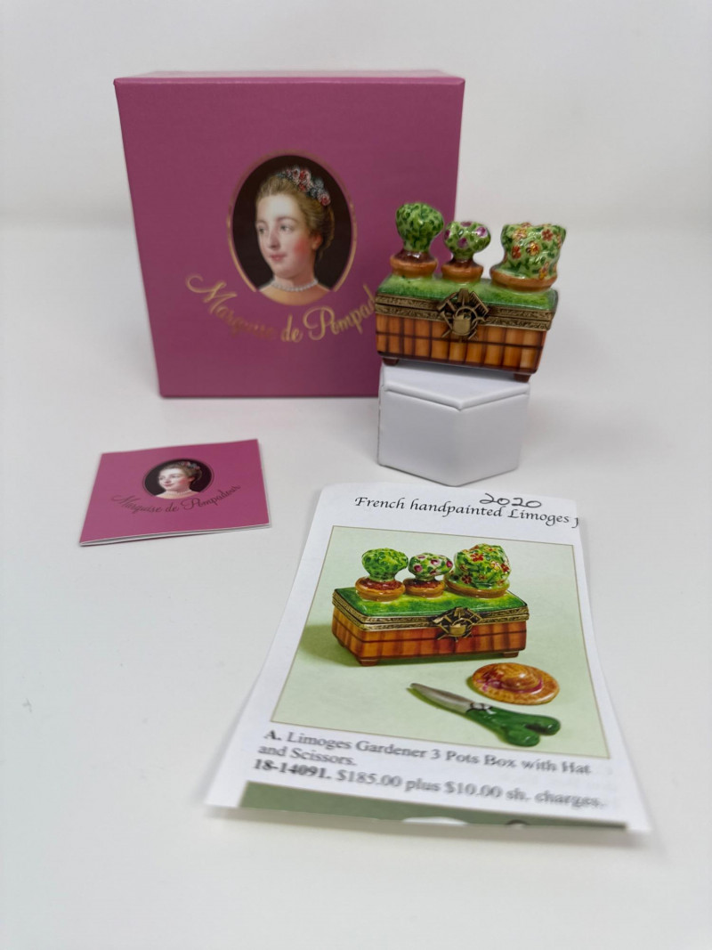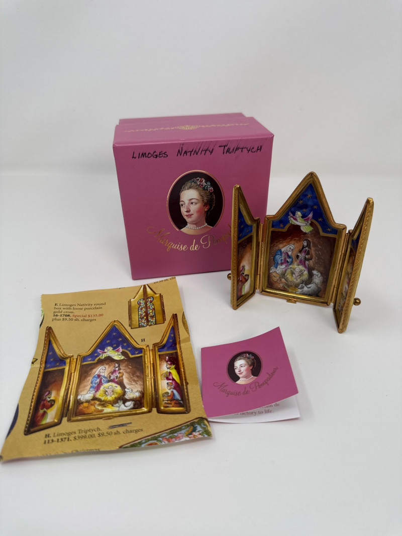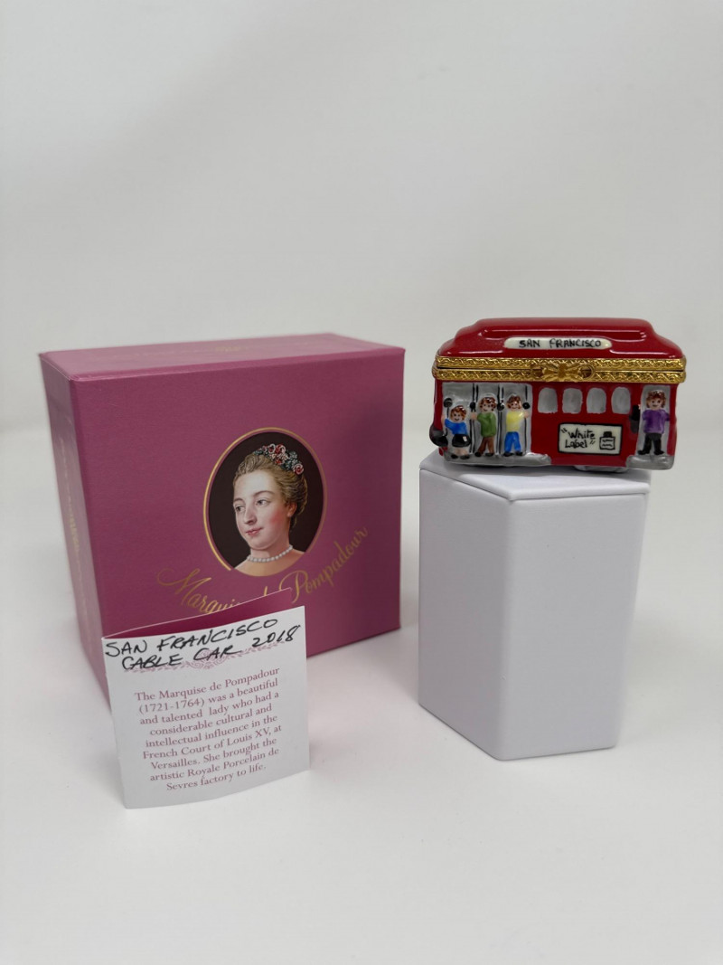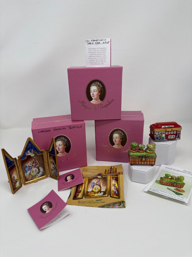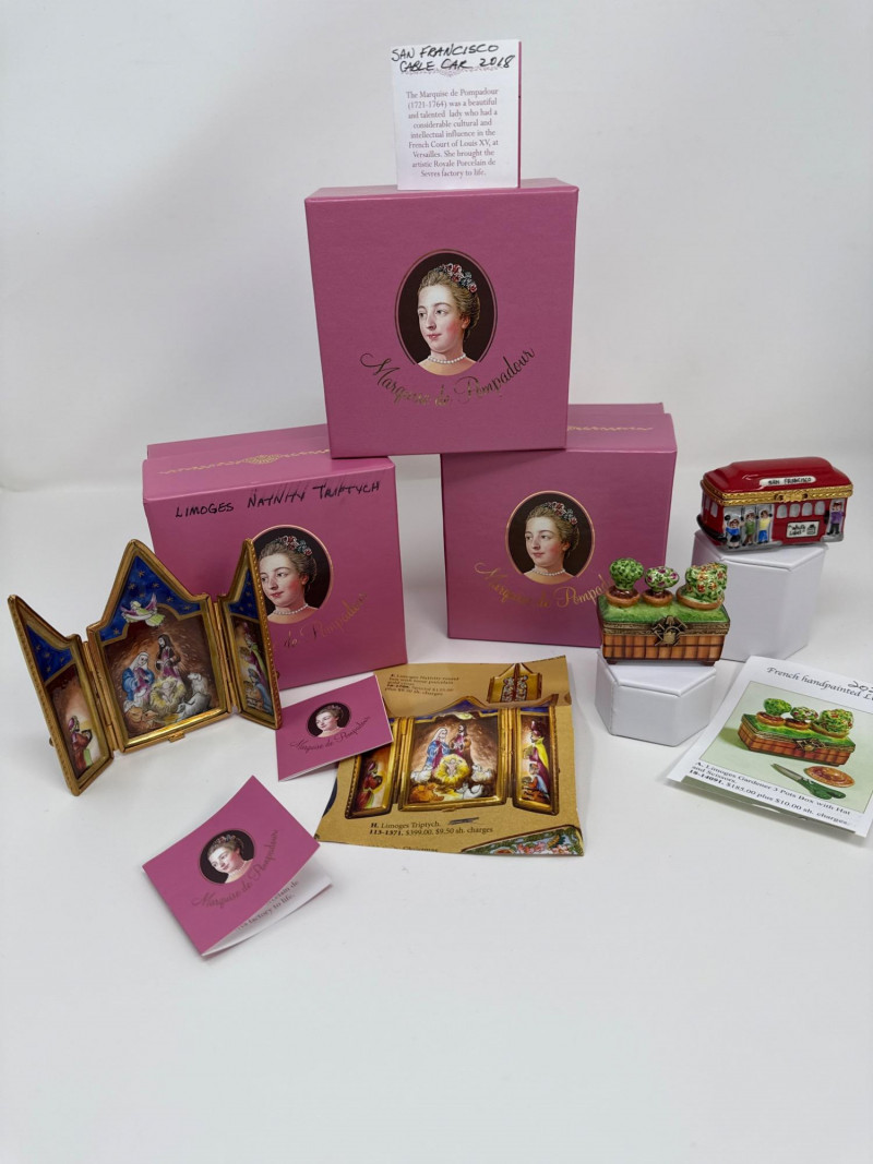 A stunning trio of hand-painted Limoges porcelain boxes from the prestigious Marquise de Pompadour collection. These exquisite French collectibles, each between 2.5" and 4" tall, celebrate craftsmanship, history, and whimsical storytelling through miniature art. Included in this lot: 2020 Limoges Gardener Box Features three potted topiaries in a wooden crate design. Comes with miniature scissors and hat. Signed "Peint Main Limoges France" – a mark of authentic, hand-painted craftsmanship. Limoges Nativity Triptych A breathtaking, cathedral-style fold-out depicting the nativity scene. Gold-accented with stained-glass-style back detail. A standout display piece for collectors or a holiday heirloom. 2018 San Francisco Cable Car Box Vibrantly painted red trolley with passengers and signage. Includes a mini tile accessory and informative insert about the Marquise de Pompadour. A delightful blend of French artistry and American charm. Each piece comes in its original pink Marquise de Pompadour gift box
