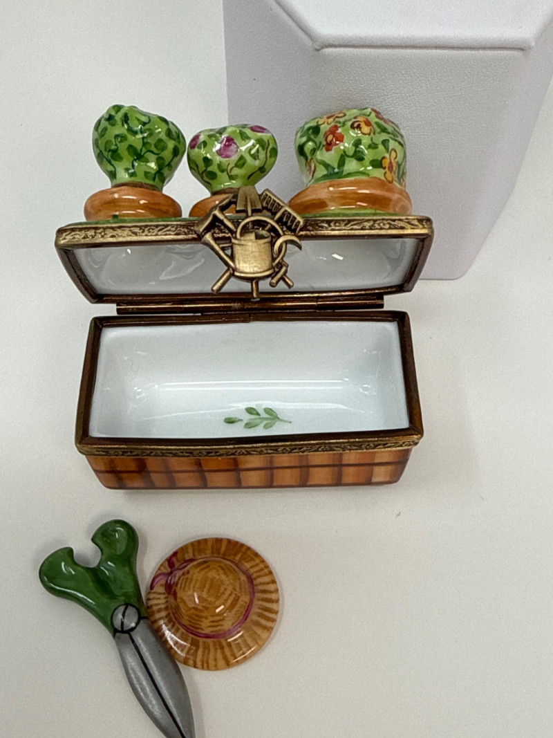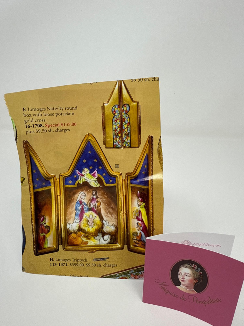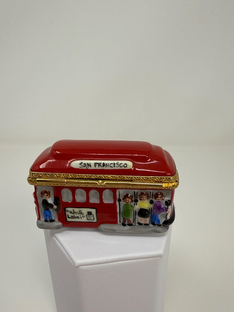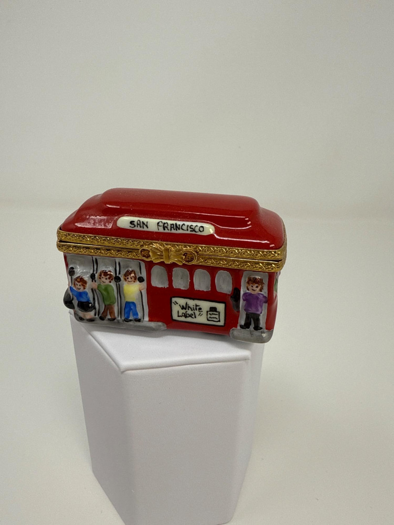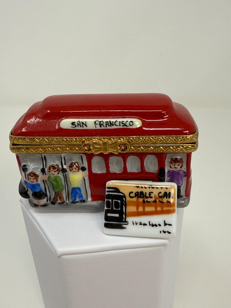 A stunning trio of hand-painted Limoges porcelain boxes from the prestigious Marquise de Pompadour collection. These exquisite French collectibles, each between 2.5" and 4" tall, celebrate craftsmanship, history, and whimsical storytelling through miniature art. Included in this lot: 2020 Limoges Gardener Box Features three potted topiaries in a wooden crate design. Comes with miniature scissors and hat. Signed "Peint Main Limoges France" – a mark of authentic, hand-painted craftsmanship. Limoges Nativity Triptych A breathtaking, cathedral-style fold-out depicting the nativity scene. Gold-accented with stained-glass-style back detail. A standout display piece for collectors or a holiday heirloom. 2018 San Francisco Cable Car Box Vibrantly painted red trolley with passengers and signage. Includes a mini tile accessory and informative insert about the Marquise de Pompadour. A delightful blend of French artistry and American charm. Each piece comes in its original pink Marquise de Pompadour gift box