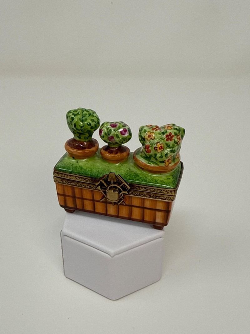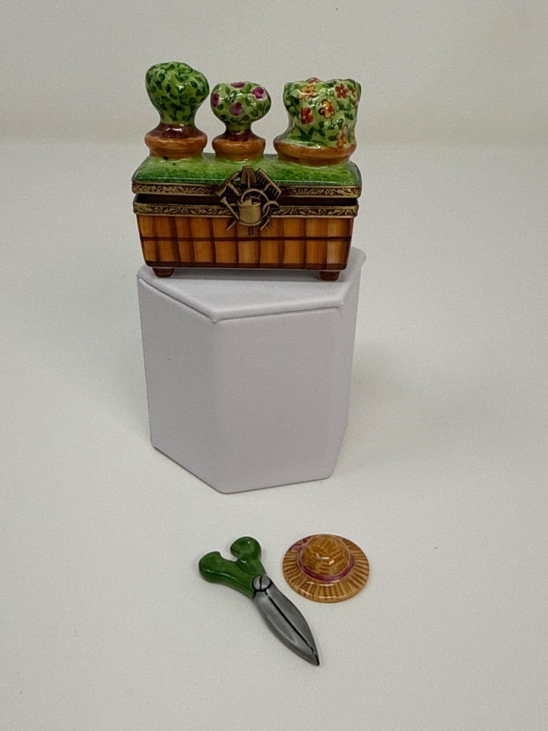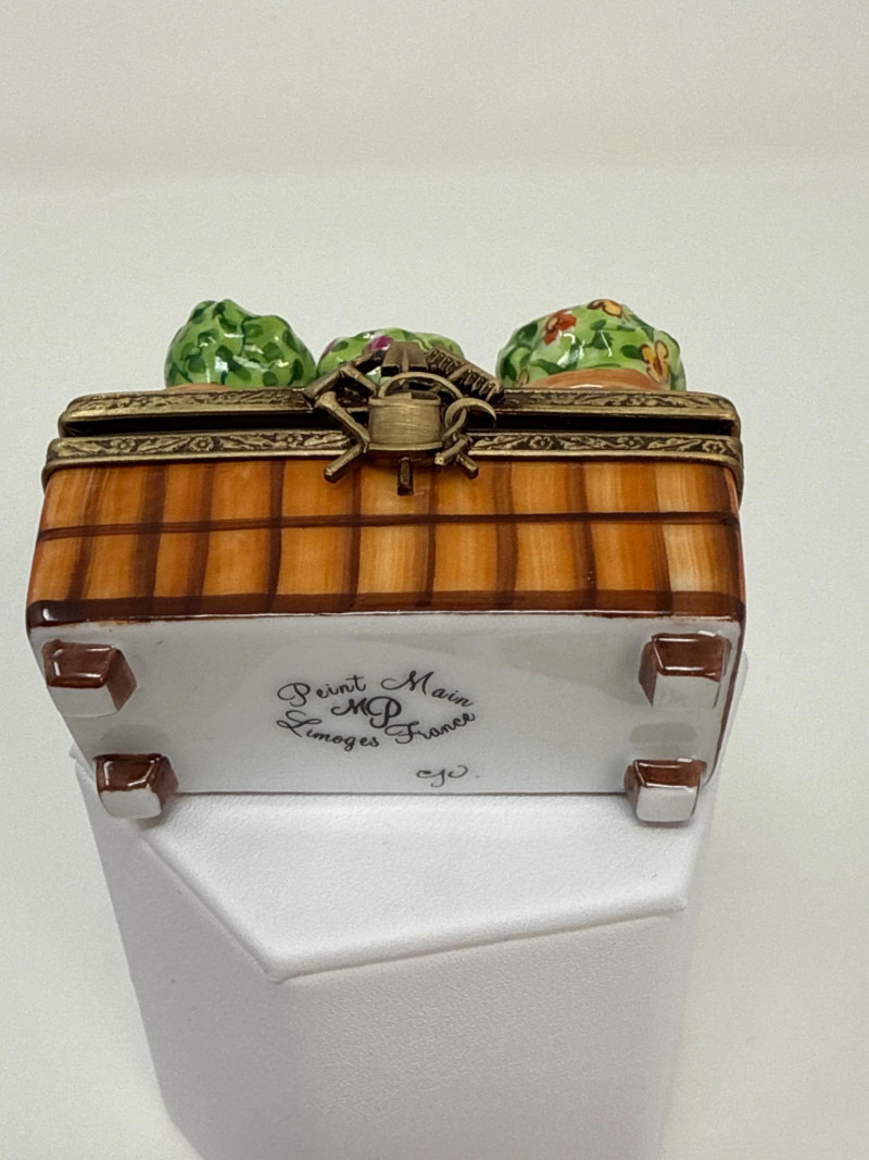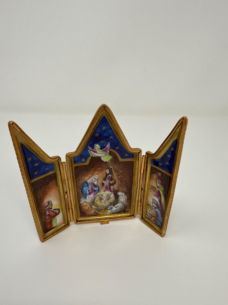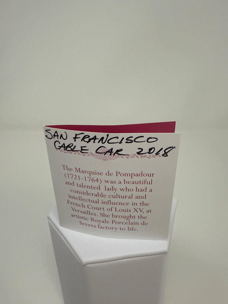 A stunning trio of hand-painted Limoges porcelain boxes from the prestigious Marquise de Pompadour collection. These exquisite French collectibles, each between 2.5" and 4" tall, celebrate craftsmanship, history, and whimsical storytelling through miniature art. Included in this lot: 2020 Limoges Gardener Box Features three potted topiaries in a wooden crate design. Comes with miniature scissors and hat. Signed "Peint Main Limoges France" – a mark of authentic, hand-painted craftsmanship. Limoges Nativity Triptych A breathtaking, cathedral-style fold-out depicting the nativity scene. Gold-accented with stained-glass-style back detail. A standout display piece for collectors or a holiday heirloom. 2018 San Francisco Cable Car Box Vibrantly painted red trolley with passengers and signage. Includes a mini tile accessory and informative insert about the Marquise de Pompadour. A delightful blend of French artistry and American charm. Each piece comes in its original pink Marquise de Pompadour gift box