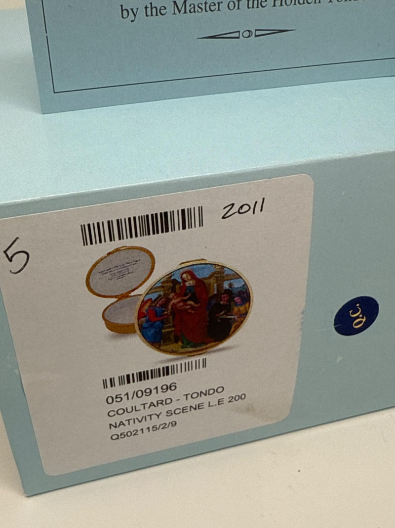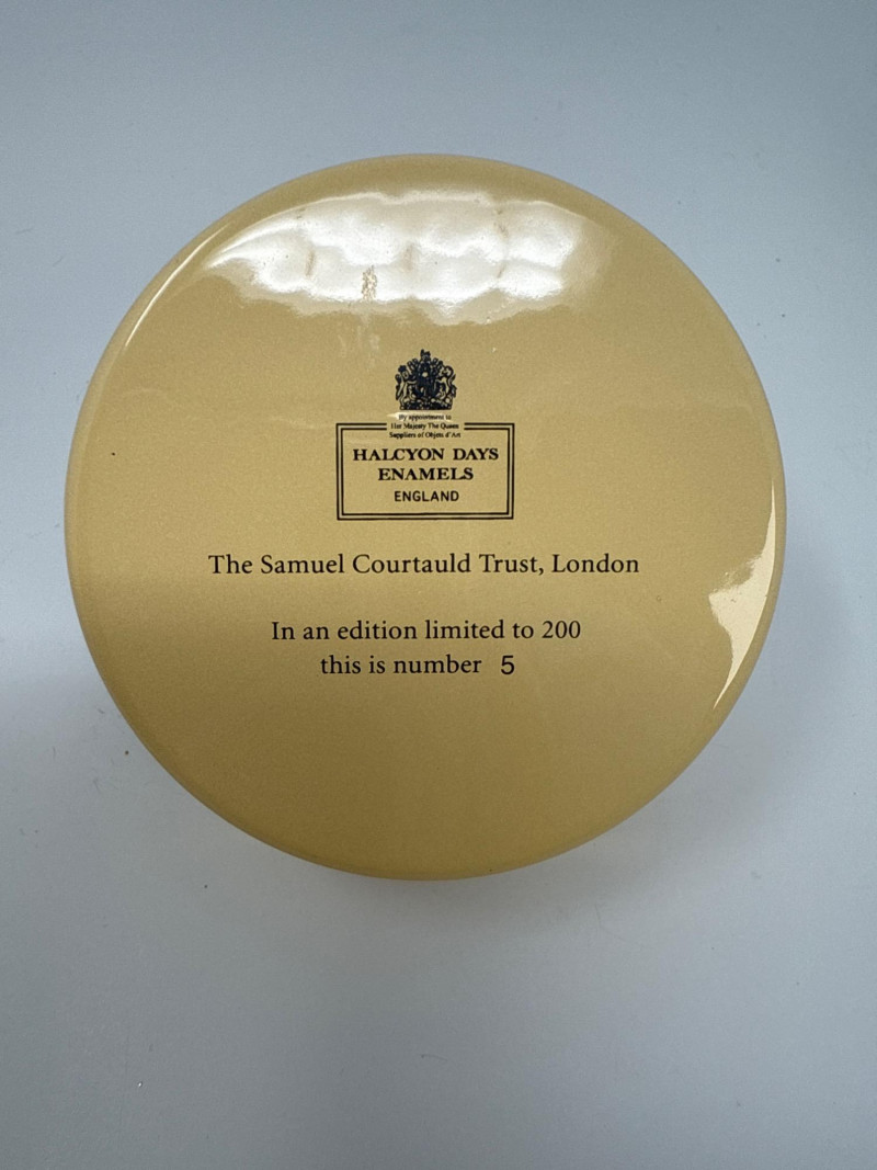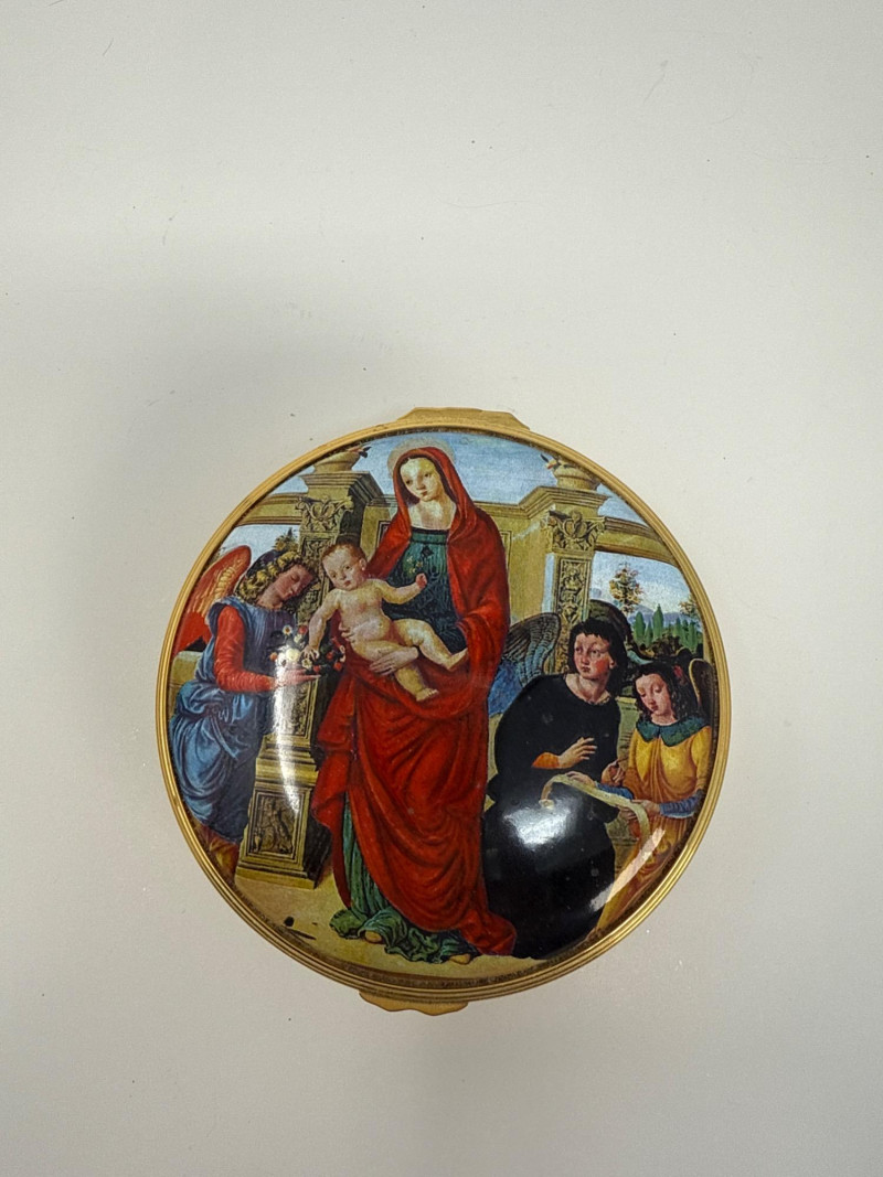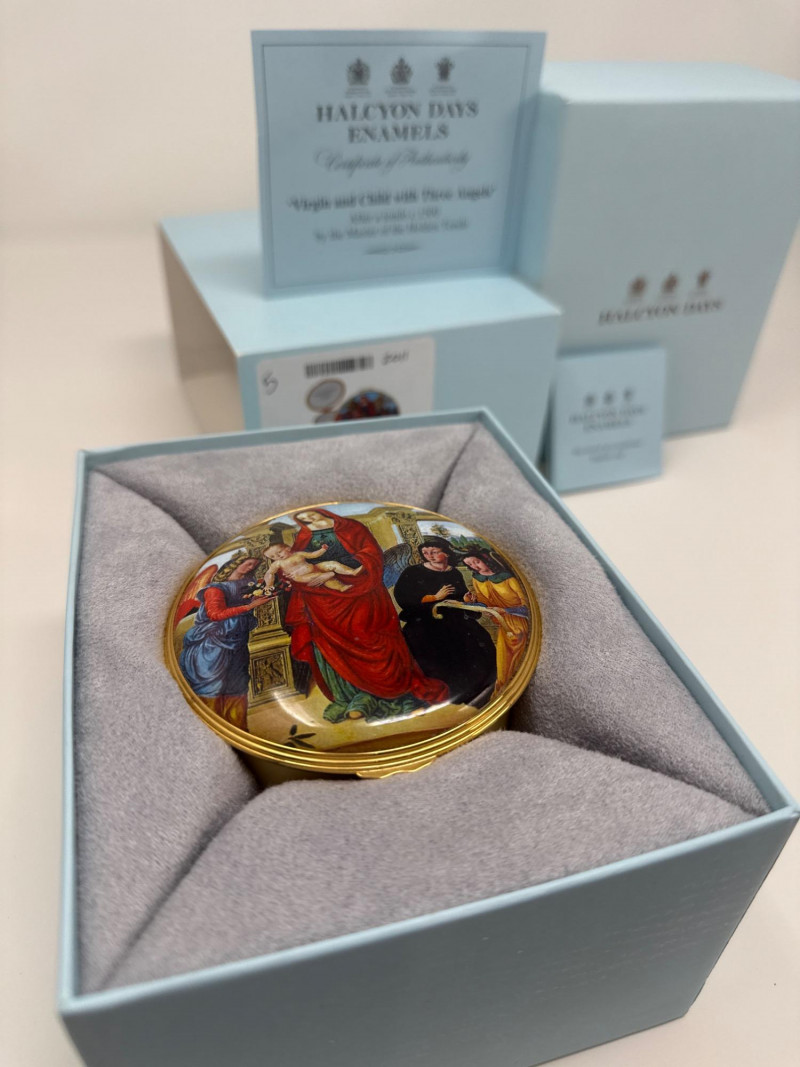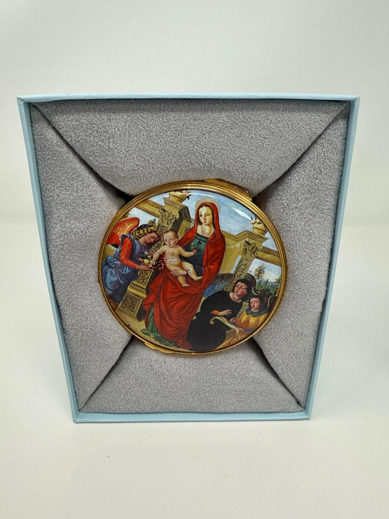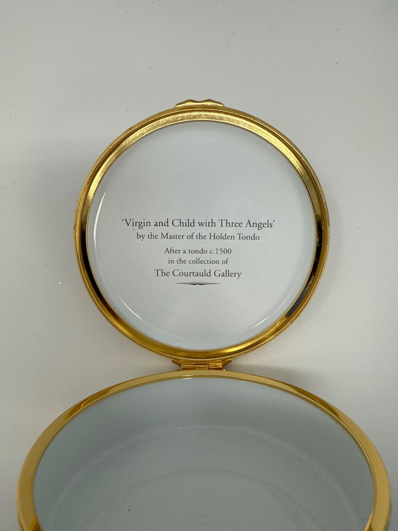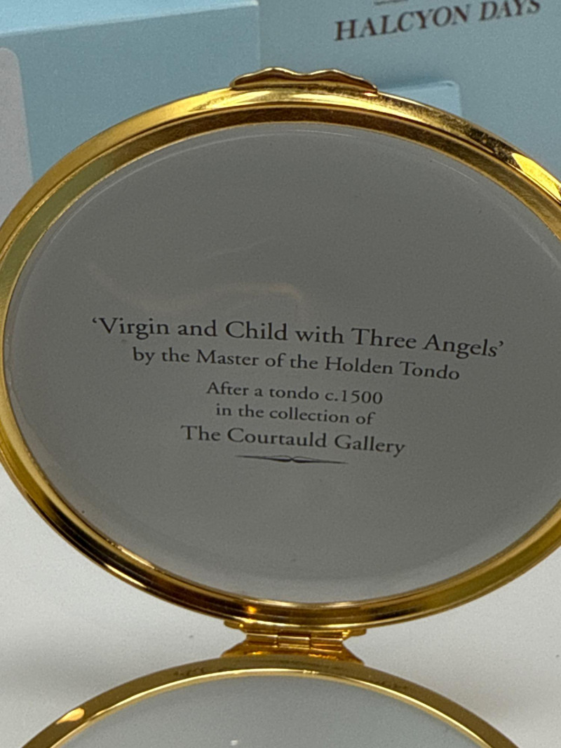 This Halcyon Days Enamels trinket box features a detailed enamel painting titled "Virgin and Child with Three Angels," inspired by a c.1500 tondo by the Master of the Holden Tondo. The artwork is beautifully recreated on a round enamel lid, surrounded by an elegant gold-tone trim. This collectible piece comes from a limited edition of only 200 and is individually numbered—this one being number 5. It was created in collaboration with The Samuel Courtauld Trust, London, and includes a certificate of authenticity. Features: Diameter: 3 inches Height: 1 inch Year: 2011 Edition: No. 5 of 200 Includes original box and certificate of authenticity Interior lid inscription referencing the artwork and gallery collection