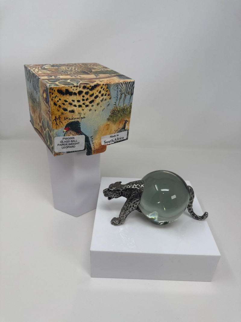 Add a touch of elegance and wild charm to your workspace with this beautifully crafted leopard paperweight. Featuring a striking design, the leopard’s body is crafted from metal with intricate detailing, while a smooth glass orb forms its midsection, giving it both weight and visual appeal. Features: Material: Metal and glass Design: Leopard with glass orb body Dimensions: 6 inches in length, 2.5 inches tall Origin: Made in South Africa Comes in a colorful box with wildlife illustrations and product labeling