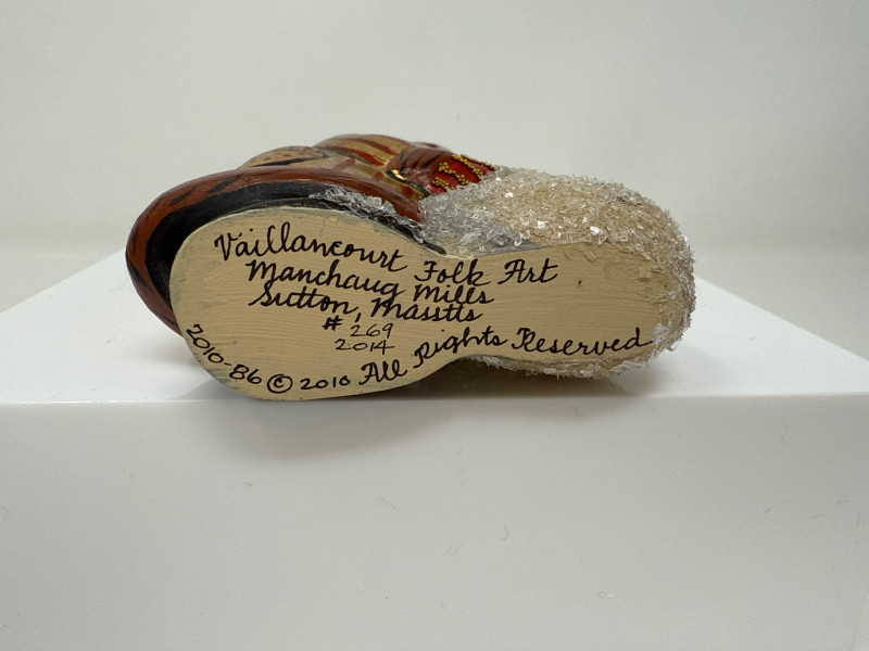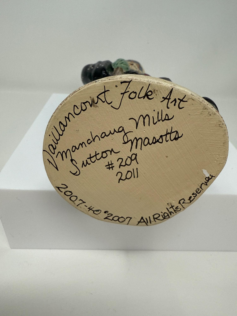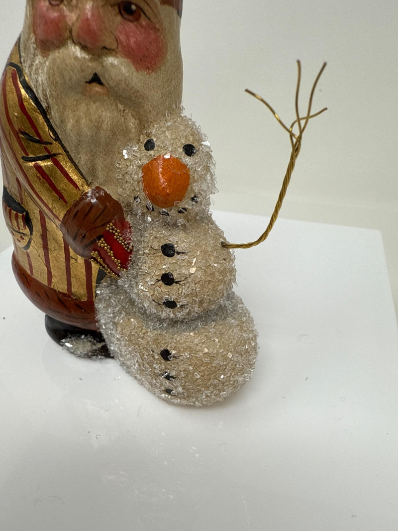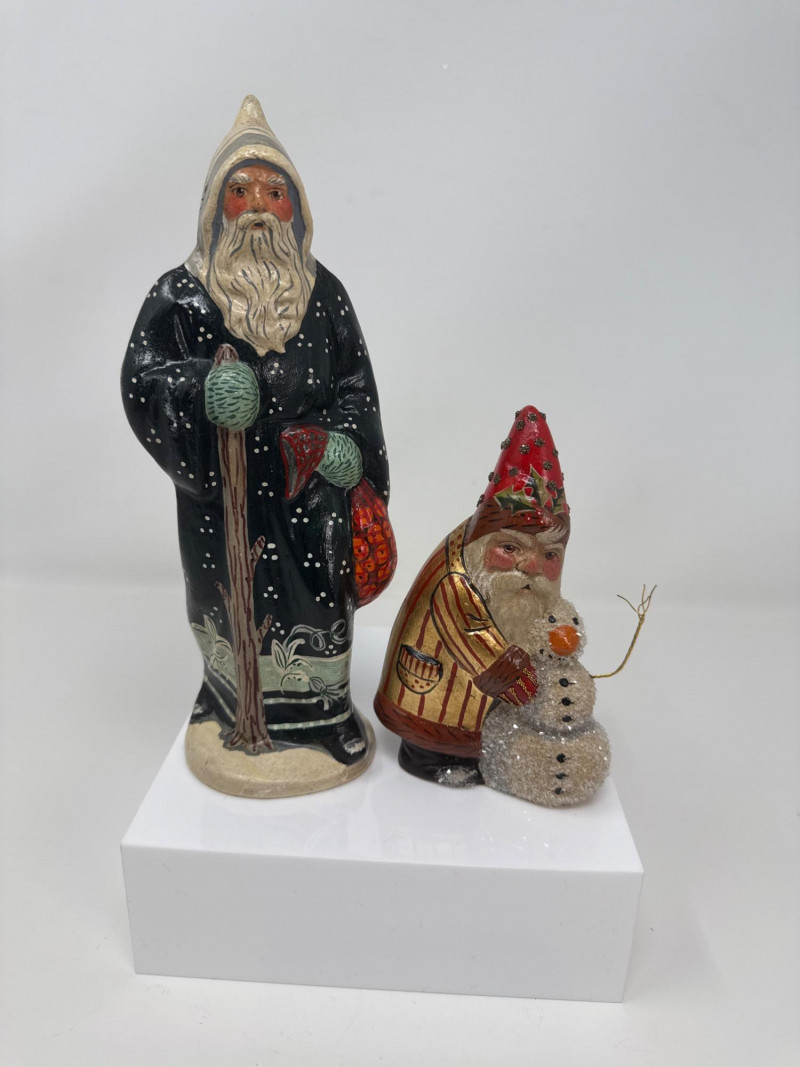A delightful set of two hand-painted Santa figurines by Vaillancourt Folk Art, known for their collectible chalkware pieces made in Sutton, Massachusetts. Each figure is intricately detailed and individually signed on the base. Set Includes: Tall Santa (2011 – #209): Height: 8 inches tall Outfit: Black coat with green mittens and cream hood Accessories: Wooden staff and red sack Markings: Signed on base, marked 2011, copyright 2007 Santa with Snowman (2014 – #269): Height: 5 inches tall Outfit: Red and gold striped coat with red hat adorned with holly Accessories: Holding a glittery snowman with twig arms Markings: Signed on base, marked 2014, copyright 2016 Features: Made of chalkware Hand-painted in the USA Individually numbered and dated