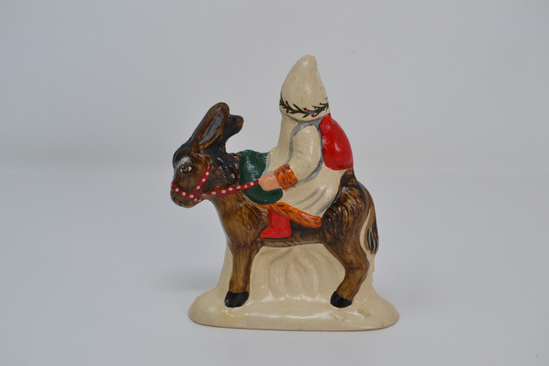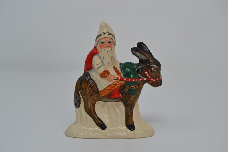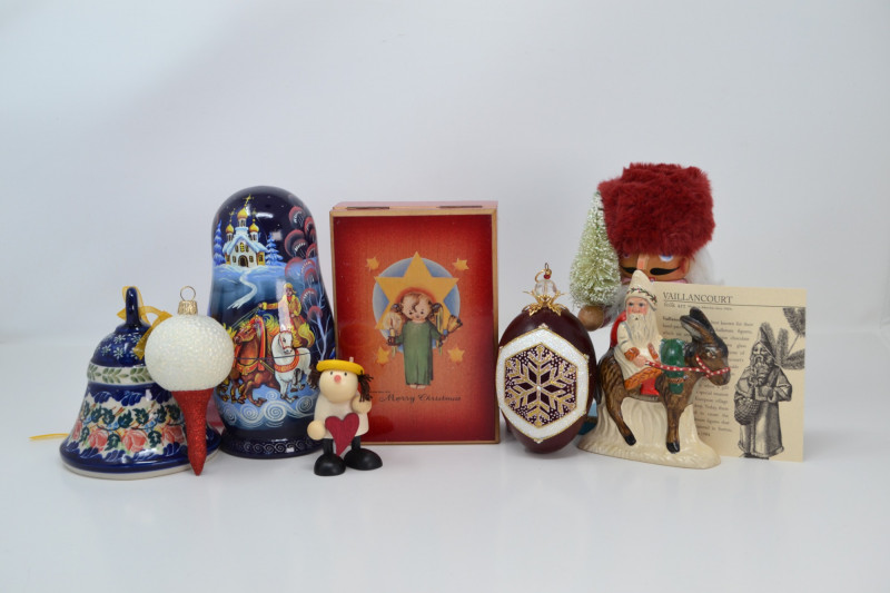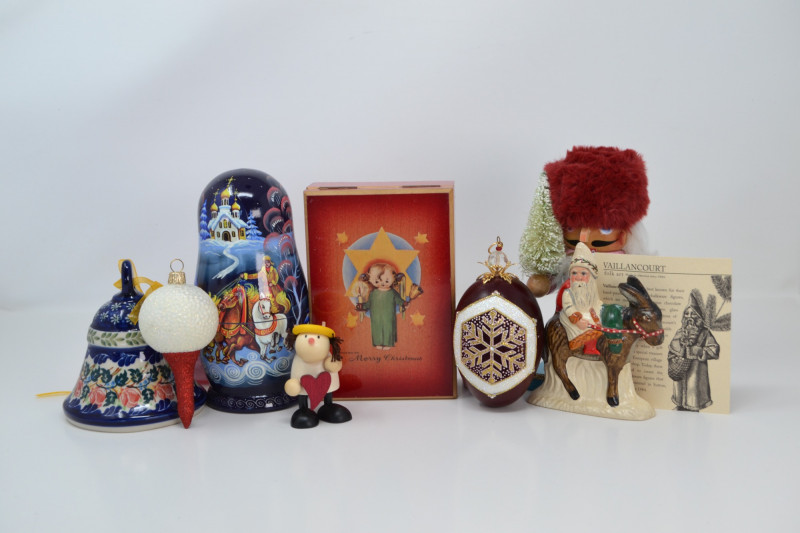 A delightful and diverse Christmas collection, combining traditional European craftsmanship and whimsical holiday charm—perfect for collectors or festive decorators. Includes: Set of 6 Hand-Painted Russian Nesting Dolls Vaillancourt Chalkware Santa on Donkey Figurine Schmid Music Box – “Herald Angel” by Sister Berta Hummel Polish Pottery Bell Ornament by Kalich Burgundy Egg Ornament White & Red Glittered Icicle Ornament Wooden Nutcracker with Tree Wooden Angel Holding a Heart