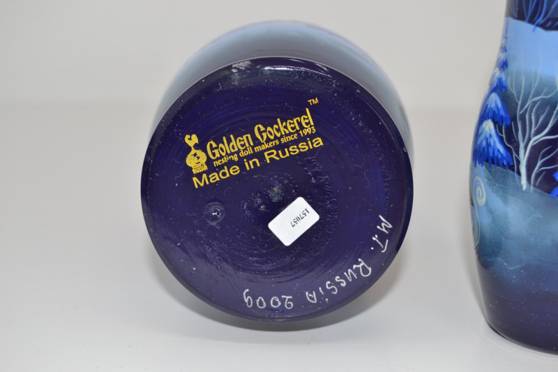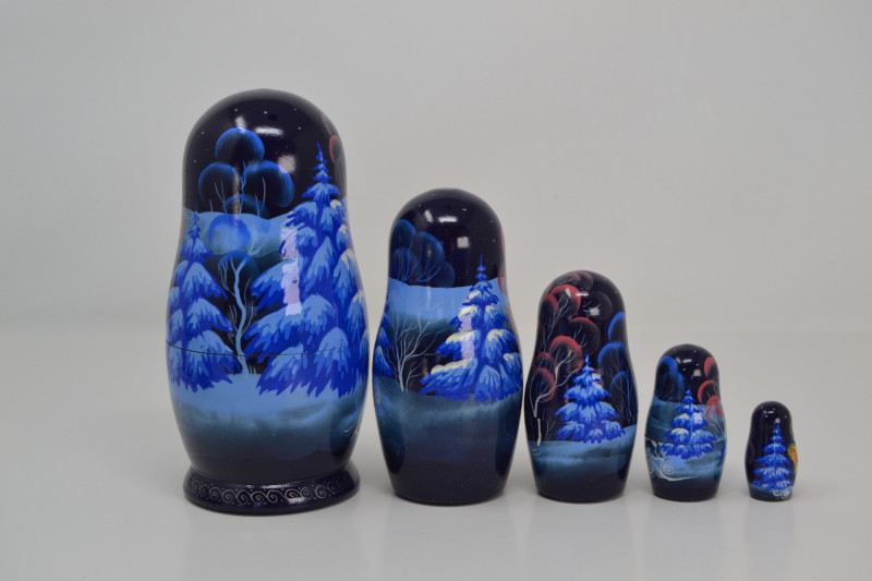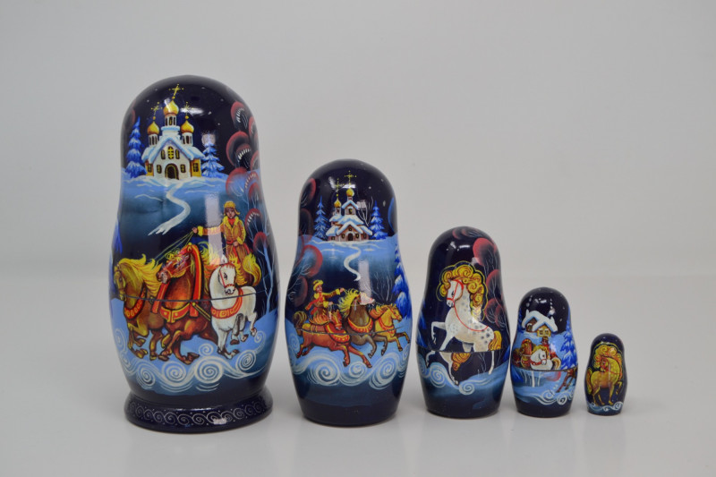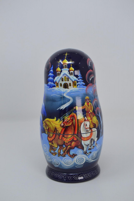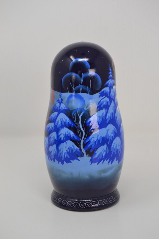 Created by Golden Cockerel (Made in Russia, 2009), this stunning set features vivid winter scenes with sleigh rides and ornate churches. Ranges in height from 1 1/2 inches to 6 1/4 inches.
