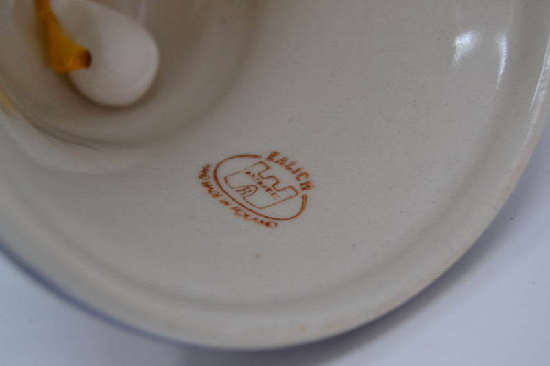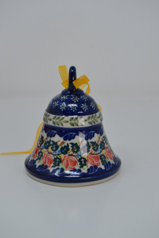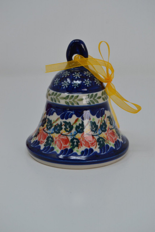 Beautifully hand-painted ceramic bell with floral design and yellow ribbon. Marked “Hand Made in Poland” by Kalich.