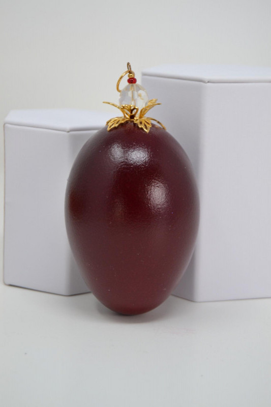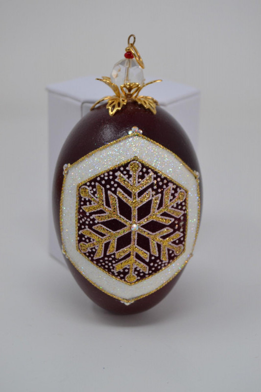 Rich burgundy glass ornament with an intricate snowflake design in gold and white beading, with a decorative top.
