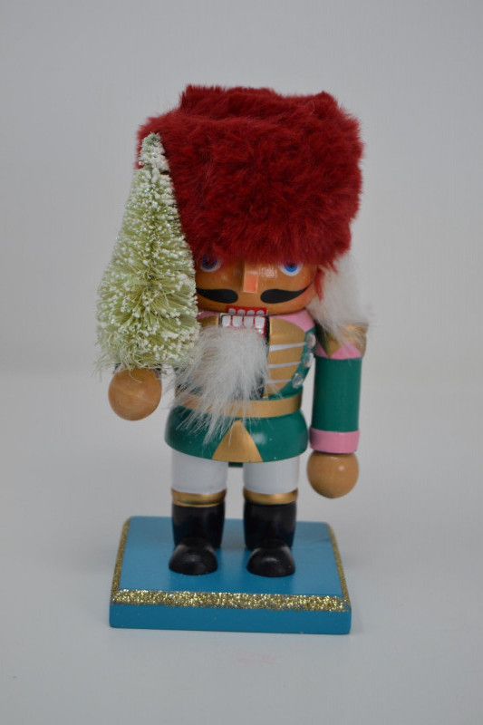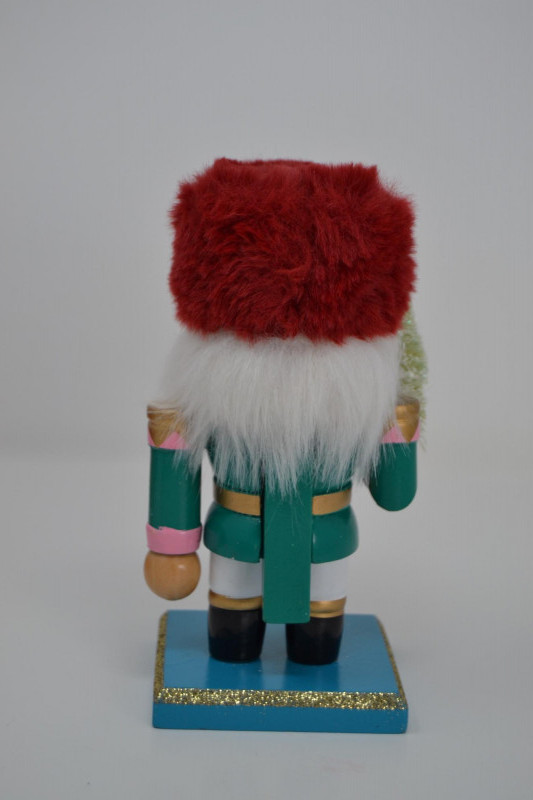 Handcrafted nutcracker figure with a red faux fur hat, green outfit, and a miniature bottle-brush tree.