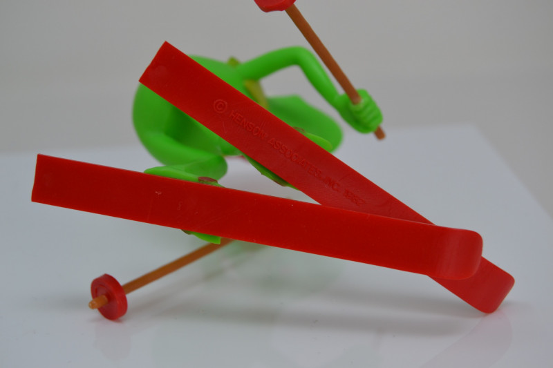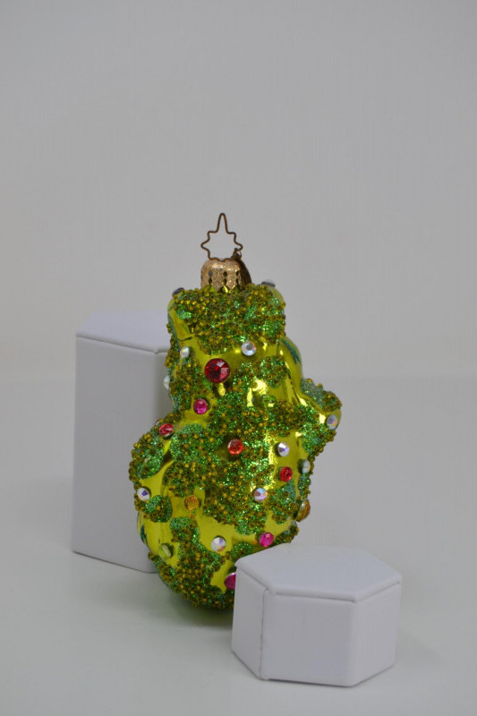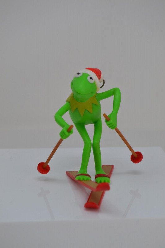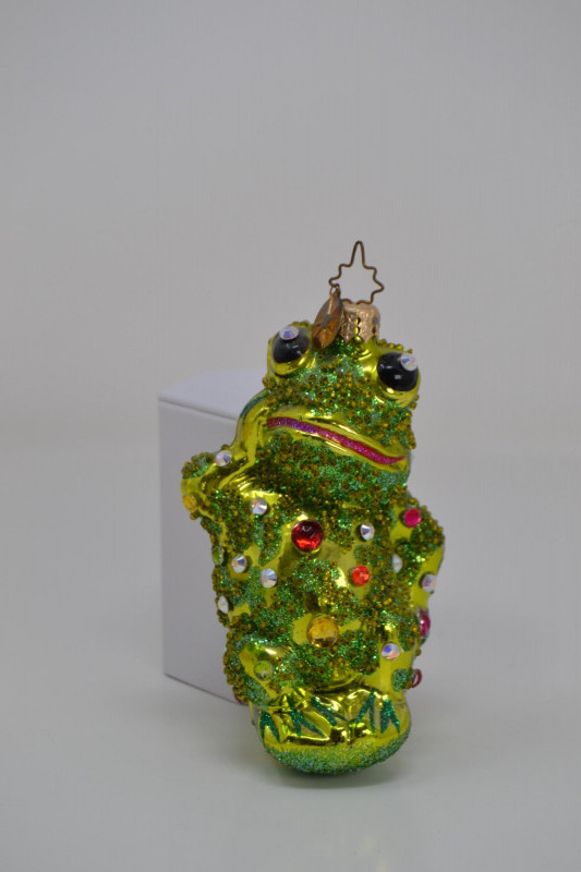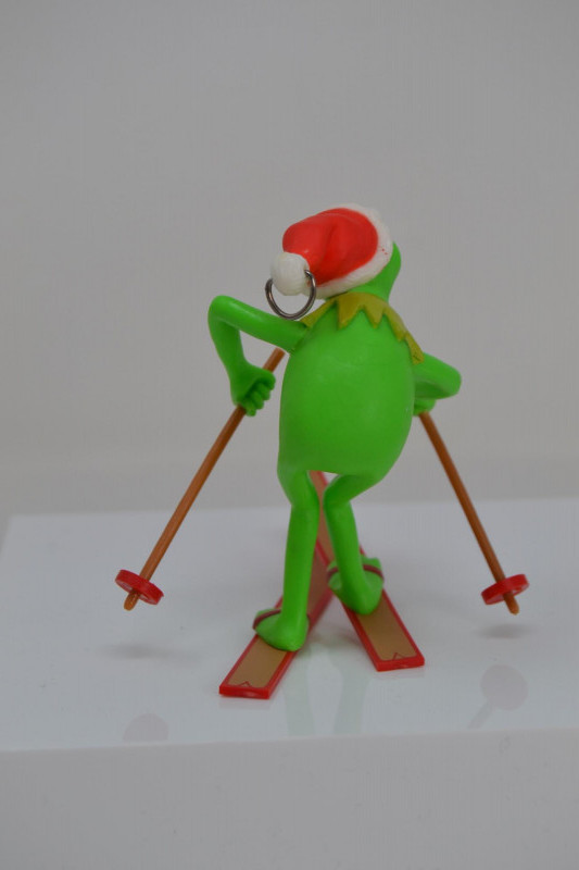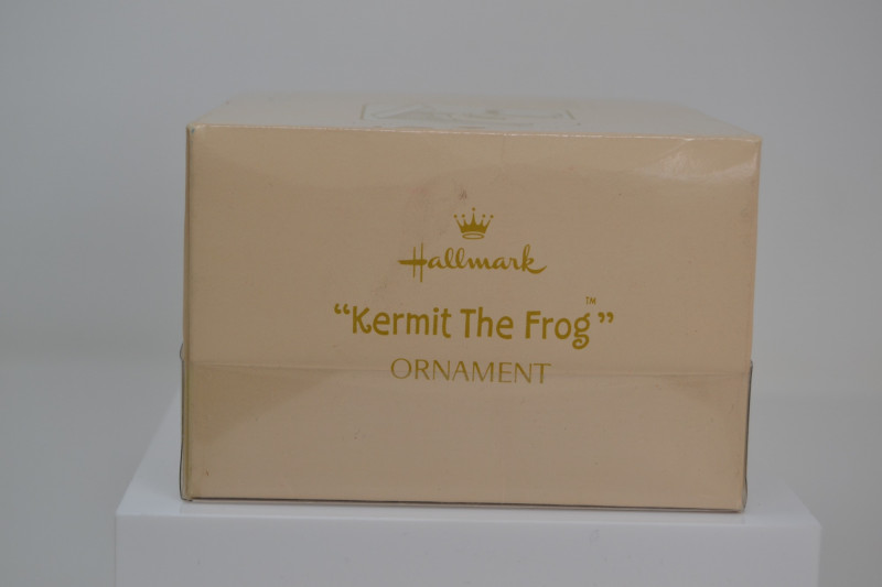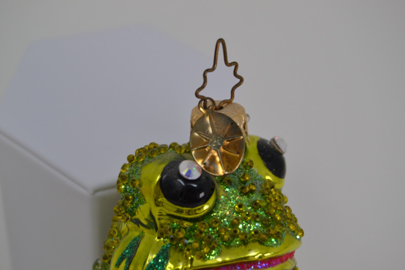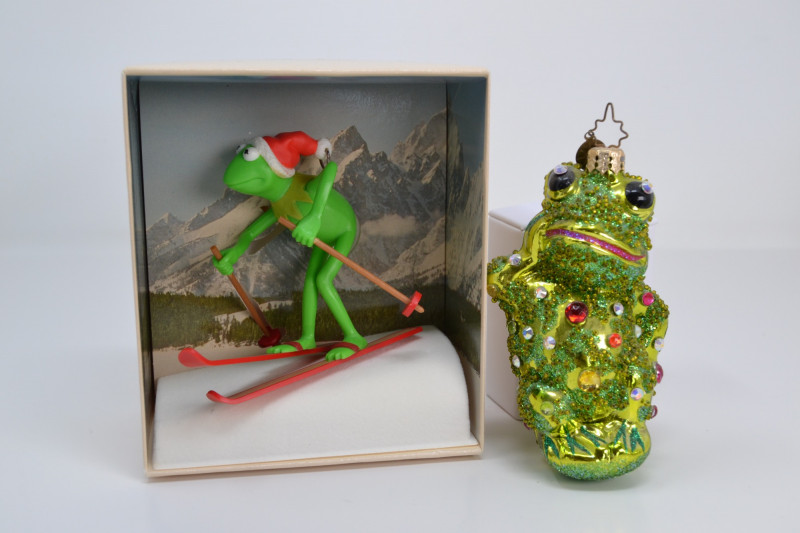 A charming Frog Ornament Collection featuring two unique holiday pieces: The 1982 Hallmark Kermit the Frog Keepsake Ornament, designed by artist Donna Lee, showcases Kermit skiing in a festive Santa hat. It comes in its original Hallmark display box with scenic background. The Christopher Radko “Froggy Sparkle” Christmas Ornament is a vibrant hand-blown glass frog adorned with colorful glitter and jewel accents, topped with a signature Radko star crown. Kermit Ornament: 3 3/16" H Radko Ornament: 4 1/2" H