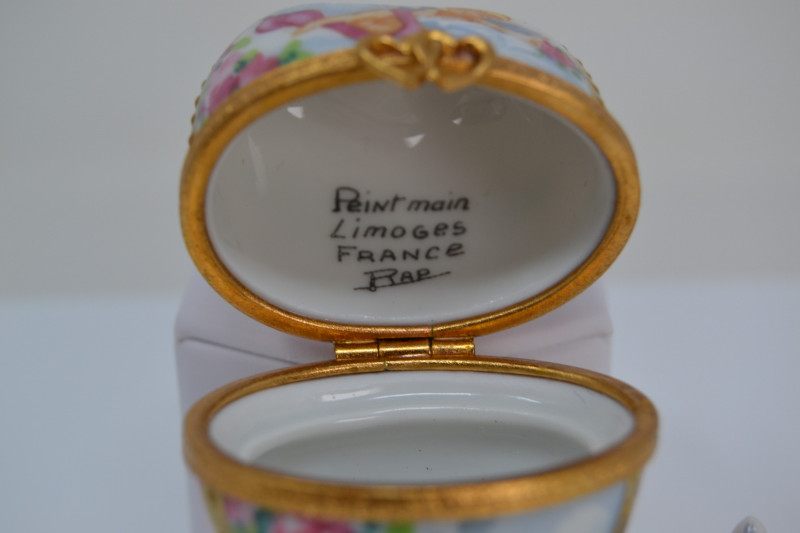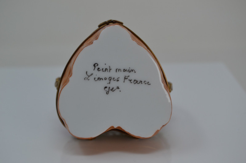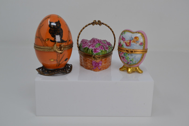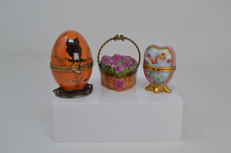 A delightful trio of hand-painted Limoges trinket boxes from France, each showcasing exquisite detail and charm: Halloween Owl Egg – 3 1/4" H Rose Basket with Love Note – 2 3/4" H Heart with Love Birds – 2 1/2" H