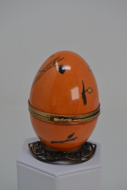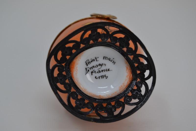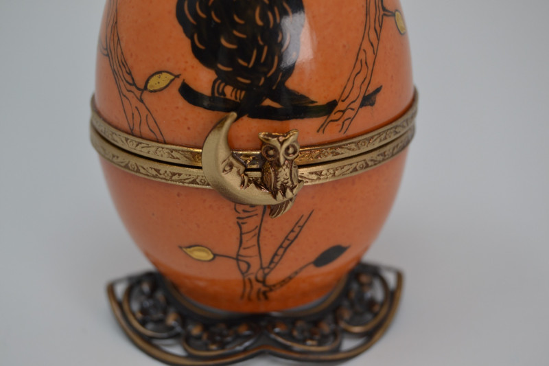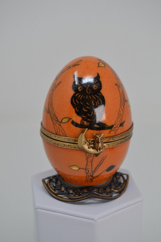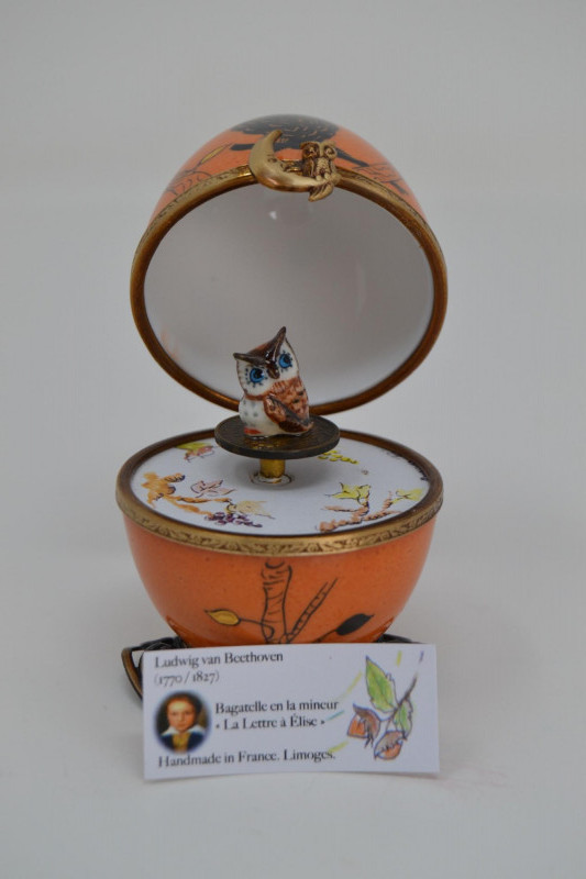 A striking orange egg-shaped box featuring a perched black owl amidst tree branches. When opened, it reveals a miniature owl figure that rotates to the tune of Beethoven’s Für Elise. Beautifully painted inside with floral accents and marked Peint Main, Limoges France.