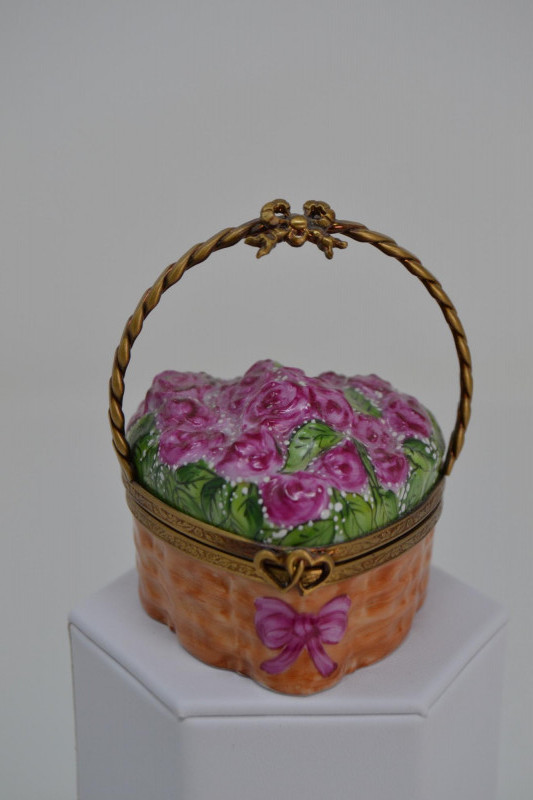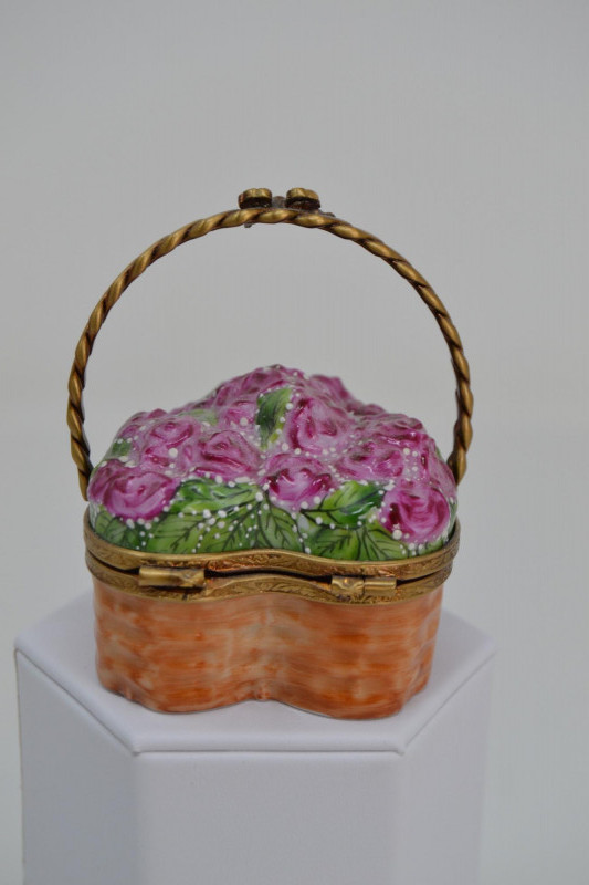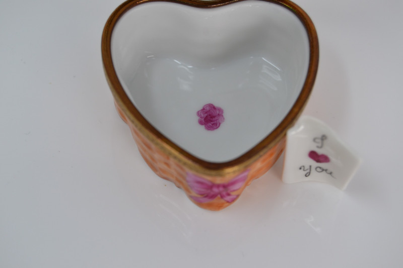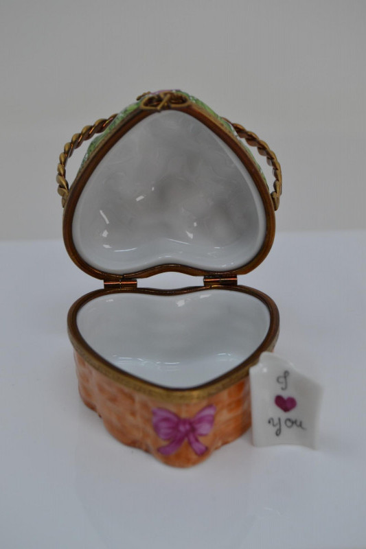 Shaped like a heart and styled as a woven basket, this piece overflows with hand-painted pink roses and features a twisted handle. Inside is a painted rose and a sweet tag reading “I ♥ you.” Signed Peint Main, Limoges France.