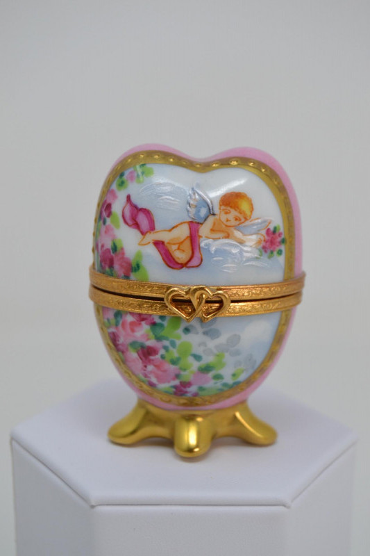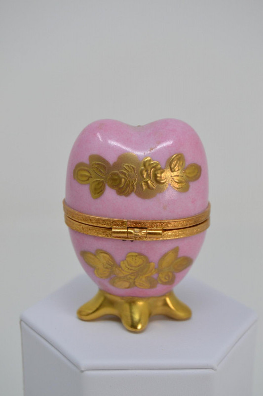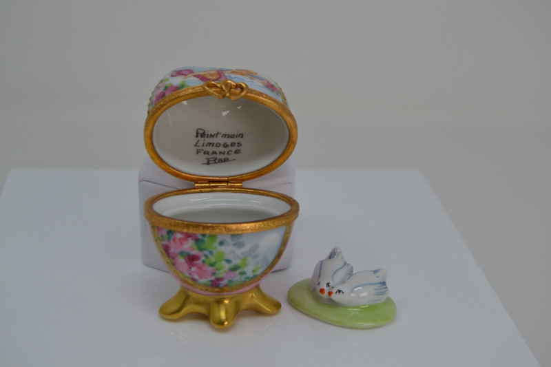 A lovely pink egg with golden floral accents and base, decorated with a romantic love bird scene. Inside is a removable white dove figurine resting on a green base. Marked Peint Main, Limoges France R.P.