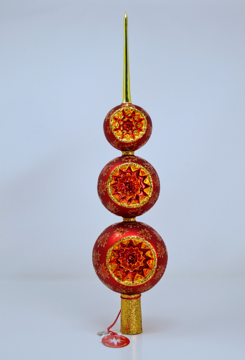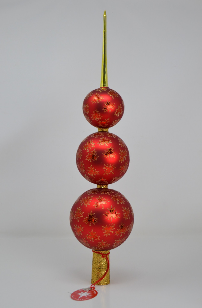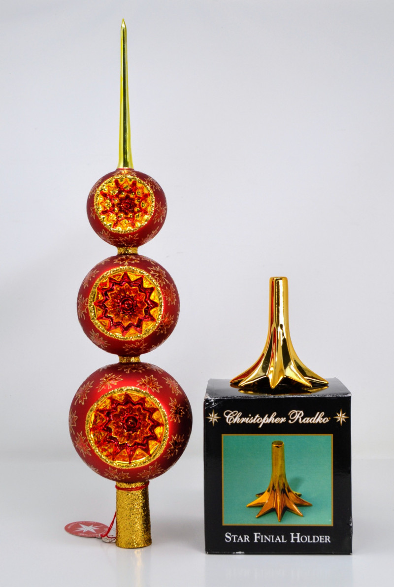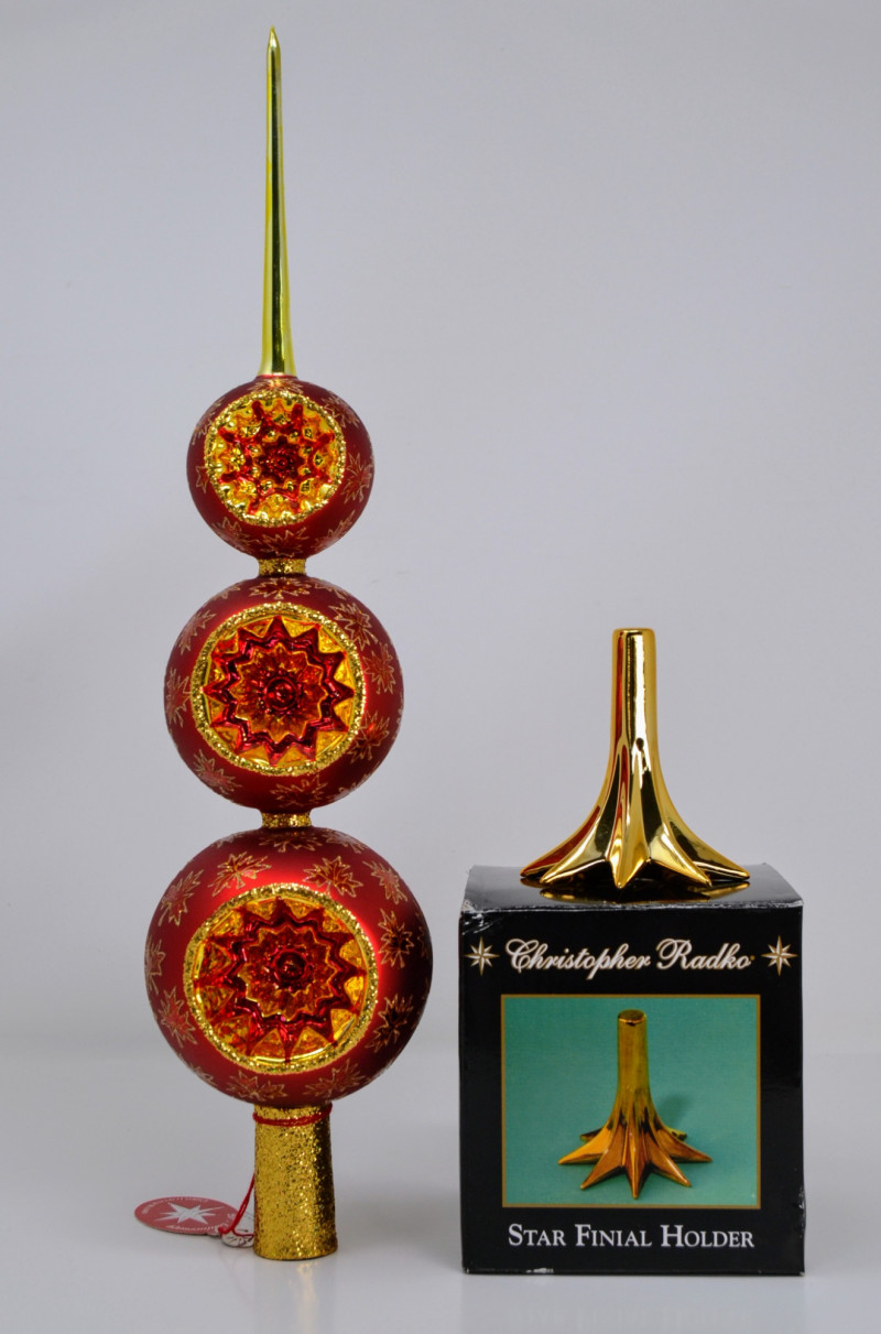 Add a touch of timeless elegance to your holiday décor with this stunning Christopher Radko 20th Anniversary Christmas Finial. Comes with original packaging. Features: Finial Height: 17 1/2" Holder Height: 3 1/2" Origin: Made in Poland Design: Three stacked red globes adorned with intricate gold and red starburst patterns Accents: Includes the original Radko charm tag Holder: Christopher Radko "Star Finial Holder" in glossy gold finish Securely supports the finial for tabletop or mantel display