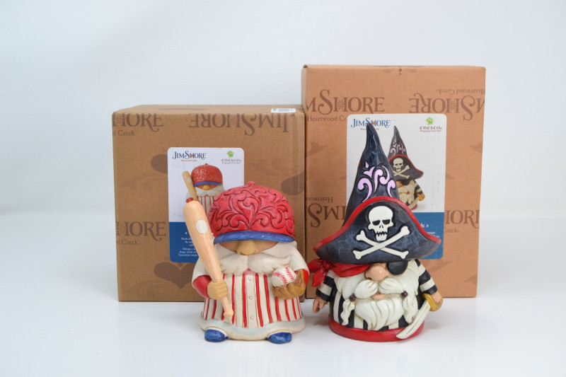 This delightful duo of Jim Shore Heartwood Creek gnome figurines showcases the artist’s signature folk art style blended with playful character themes. Both pieces come in their original, individually labeled boxes. Pirate Gnome Figurine - "Captain Patch" Baseball Gnome Figurine - "Batter Up"
